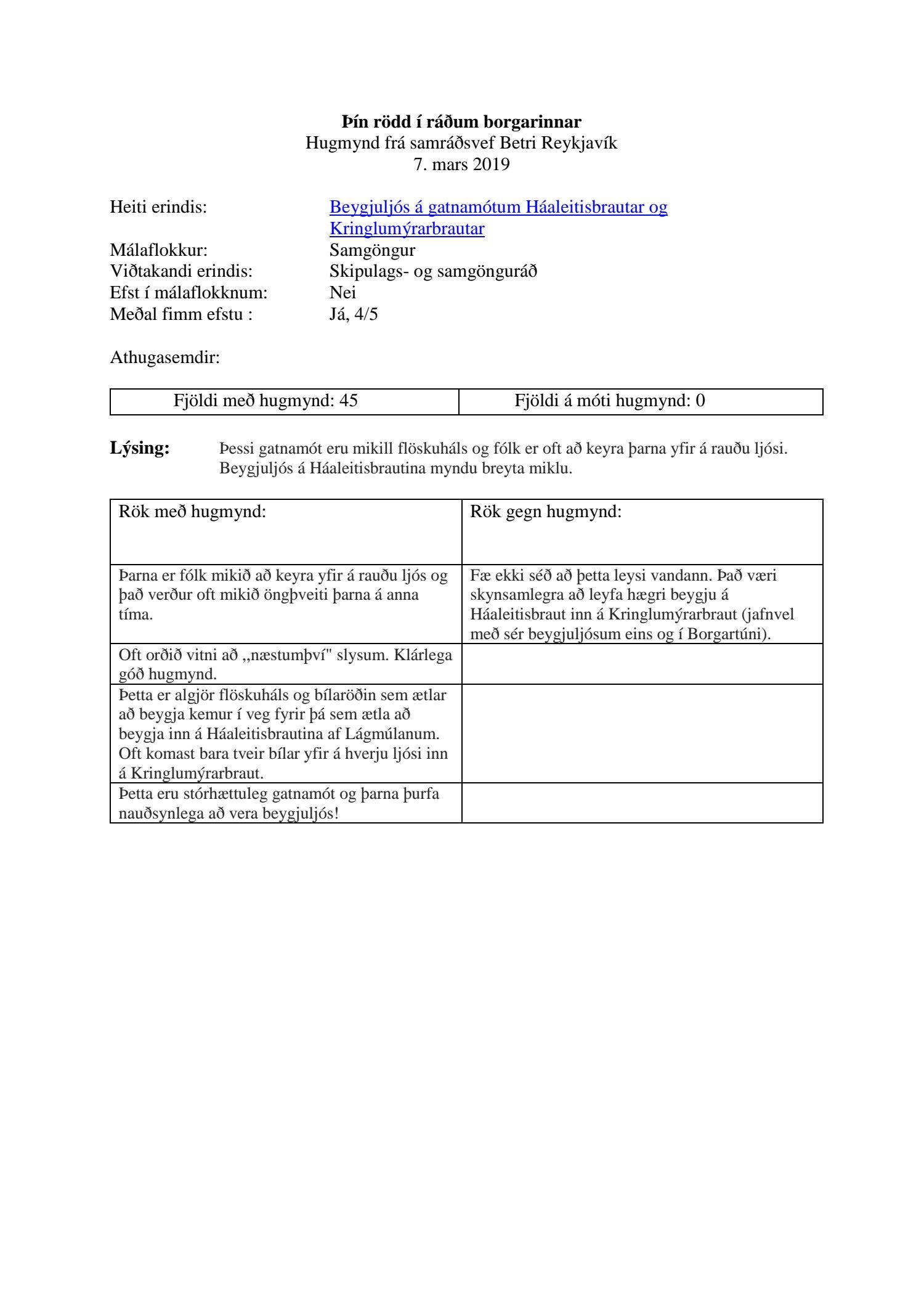 Lagt fram erindið "Beygjuljós á gatnamótum Háaleitisbraut og Kringlumýrarbrautar" sem tekið var af samráðsvefnum Betri Reykjavík þann 5. mars 2019. Erindið var fjórða efsta hugmynd febrúarmánaðar á samráðsvefnum.