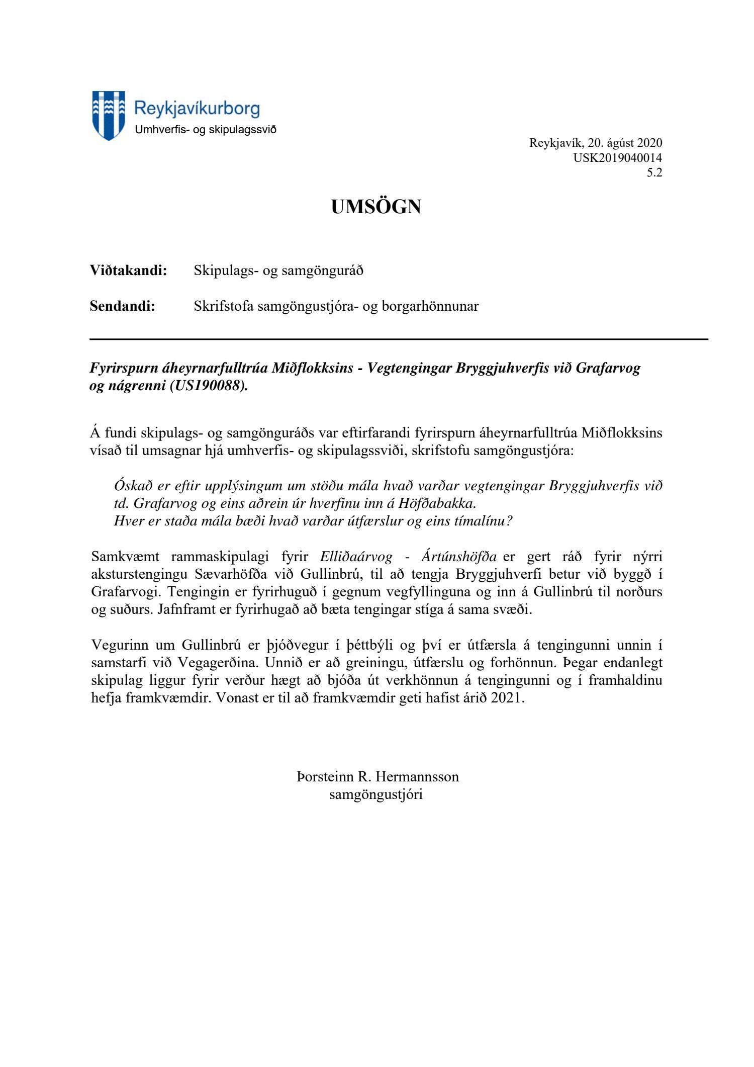 Fyrirspurn frá áheyrnarfulltrúa Miðflokksins, um vegtengingar Bryggjuhverfis, umsögn