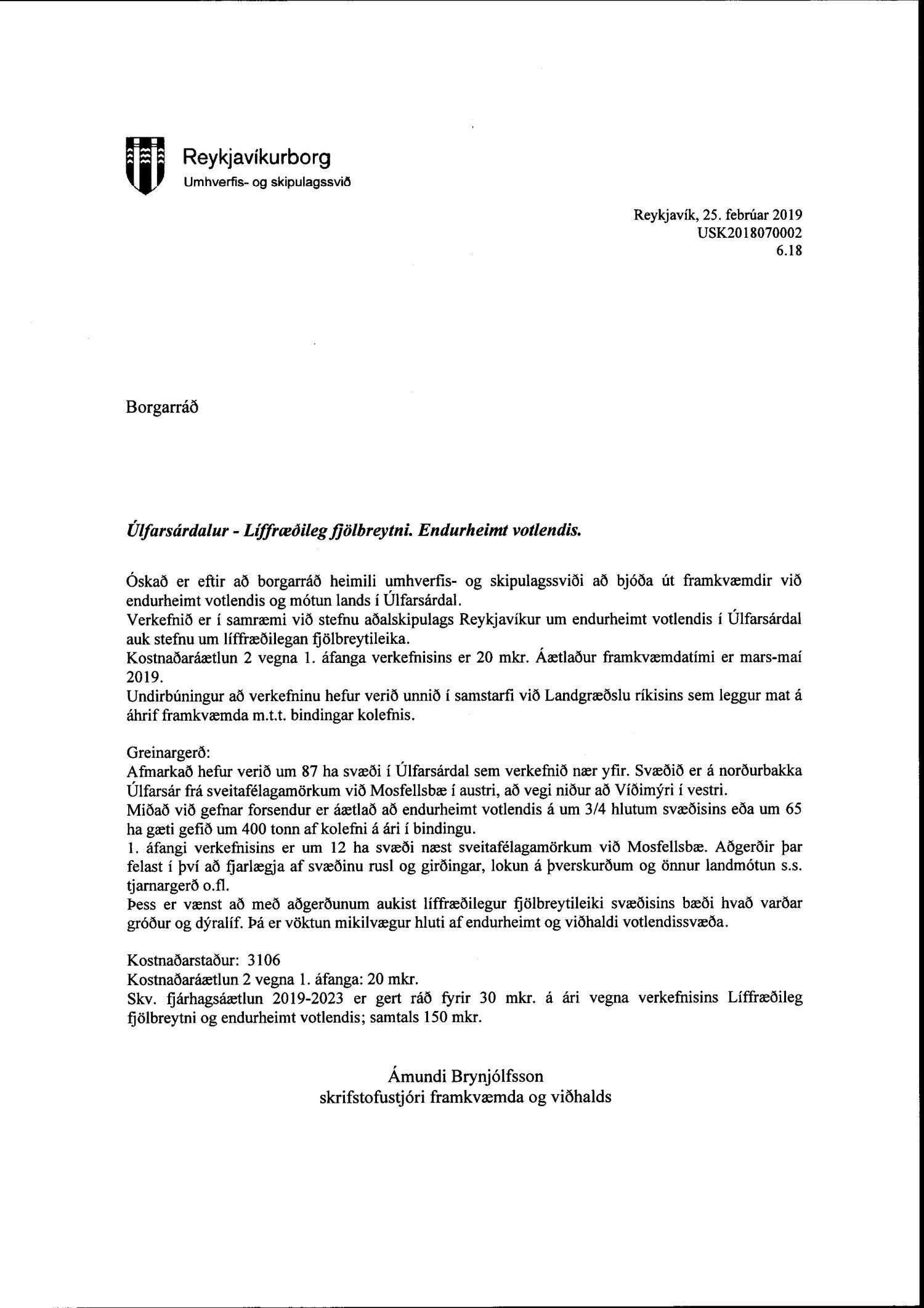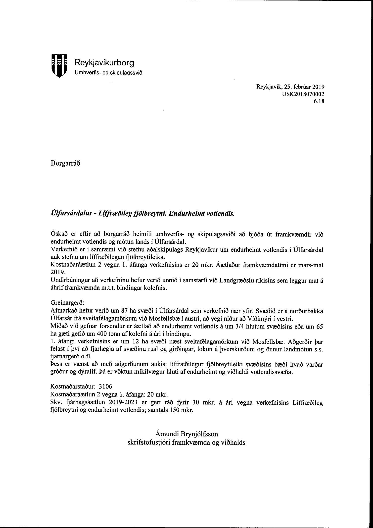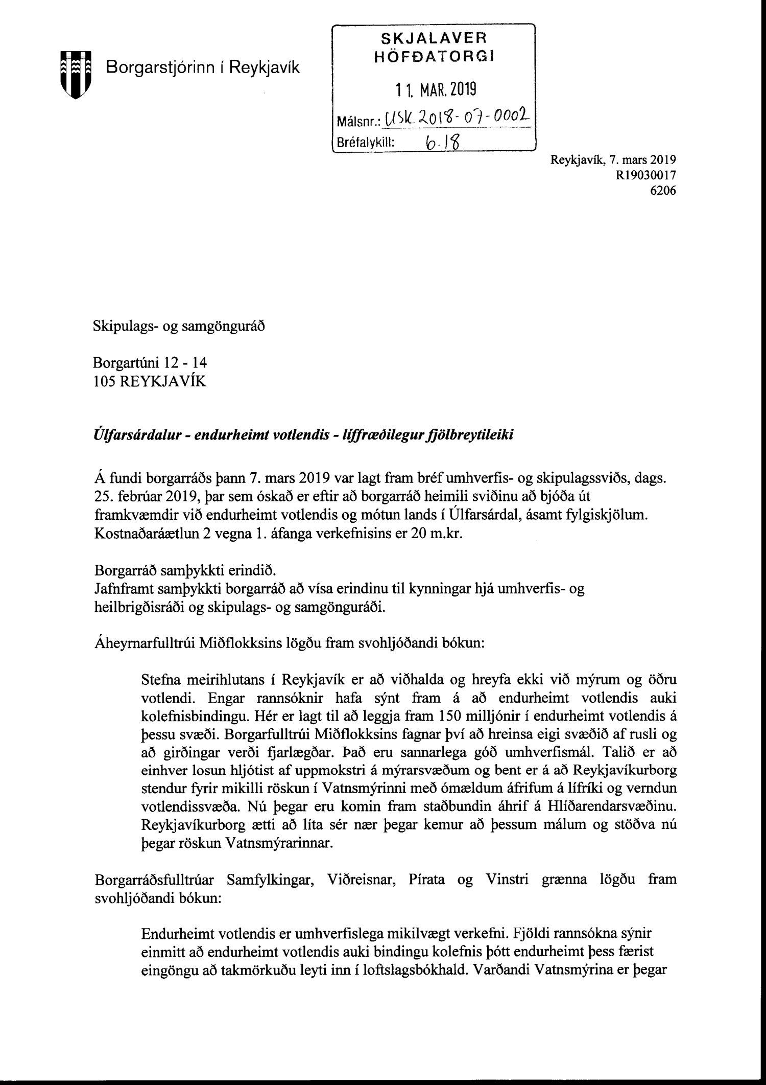 Lagt fram bréf borgarráðs dags. 7. mars 2019 þar sem kynnt er samþykkt borgarráðs til að bjóða megi út framkvæmdir við endurheimt votlendis og mótun lands í Úlfarsárdal. Jafnframt samþykkti borgarráð að vísa erindinu til kynningar í skipulags- og samgönguráði.