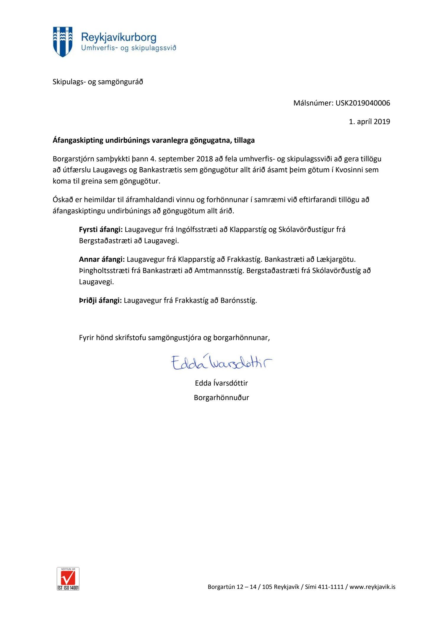Áheyrnarfulltrúi Miðflokksins bókar: Miðflokkurinn harmar að ekki hafi verið haft samráð við hagsmunaaðila við ákvörðunartöku um að varanlegar göngugötur. Yfirlýsing borgarstjóra á fundi borgarstjórnar 4.sept. síðastliðin um að Laugavegur skyldi verða göngugata frá Hlemmi vekur sérstaka eftirtekt, enda myndi slíkt þýða að aðkoma að 200 stæða bílastæðahúsi Bílastæðasjóðs borgarinnar myndi lokast. Gerræðislegar yfirlýsingar sem þessi eru ekki merki um að samráð og sátt sé ofarlega á baugi hjá borgarstjóra enda hefur nú verið ákveðið að svara í engu fjölda athugasemda og undirskriftalistum er málið varða.
