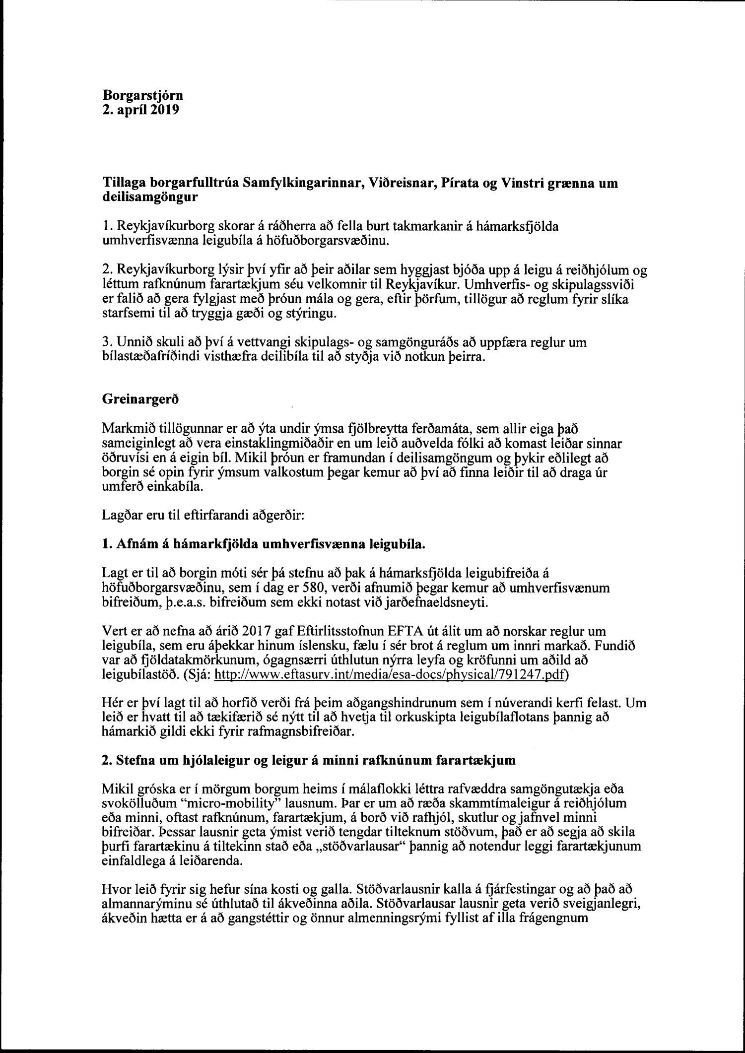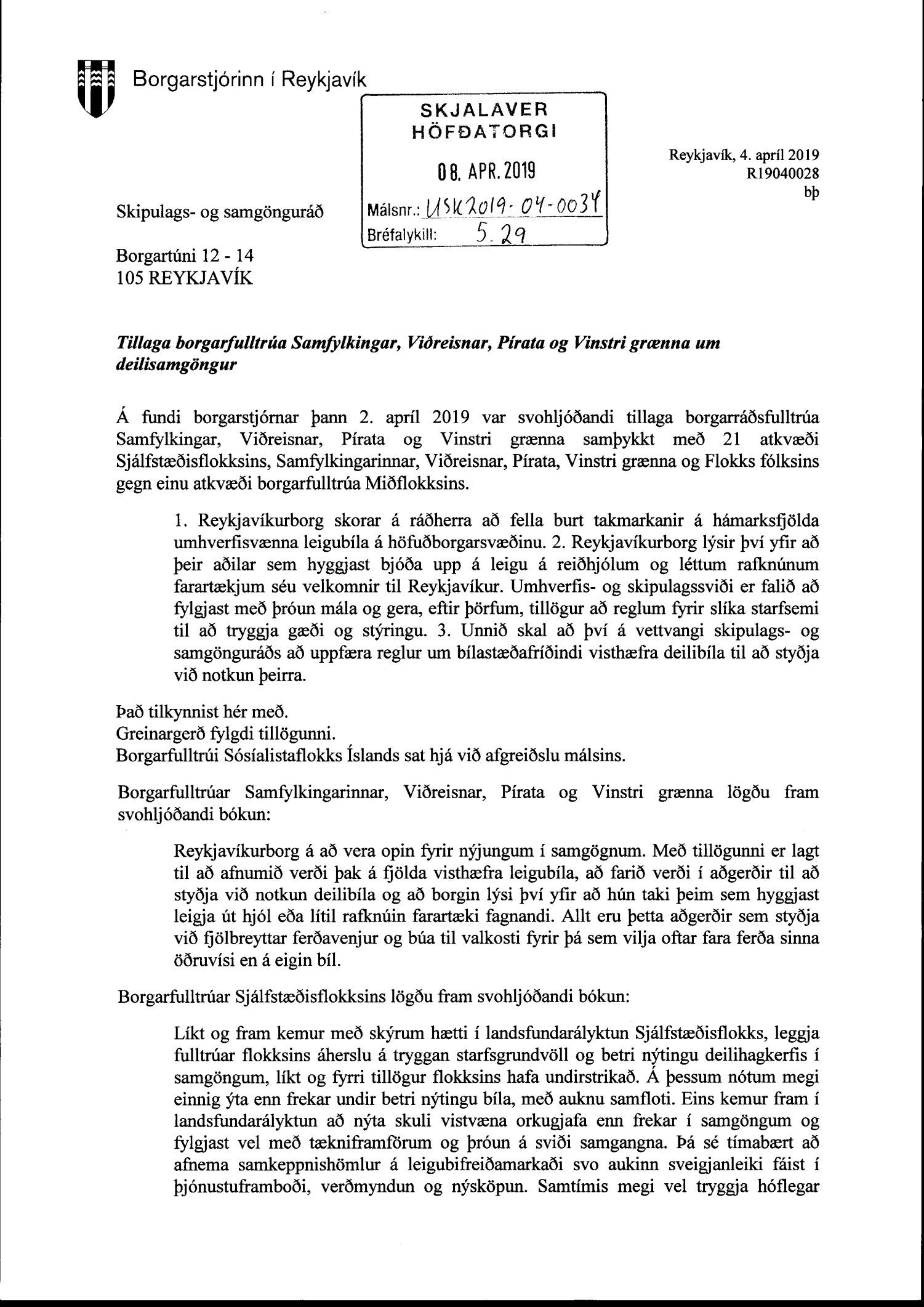 Lagt fram bréf borgarstjórar dags. 4. apríl 2019 varðandi tillögu borgarfulltrúa Samfylkingar, Viðreisnar, Pírata og Vinstri grænna um deilisamgöngur.