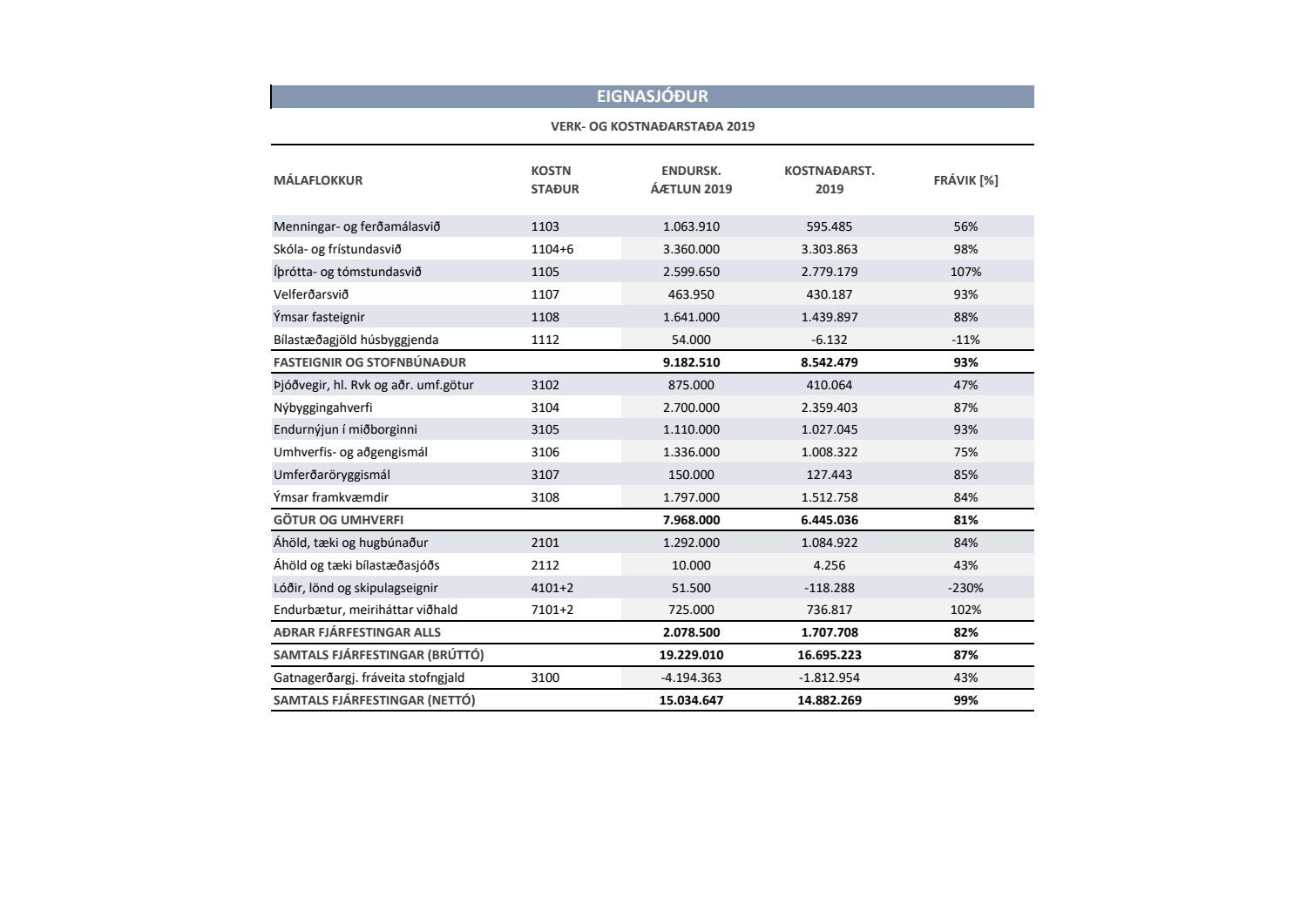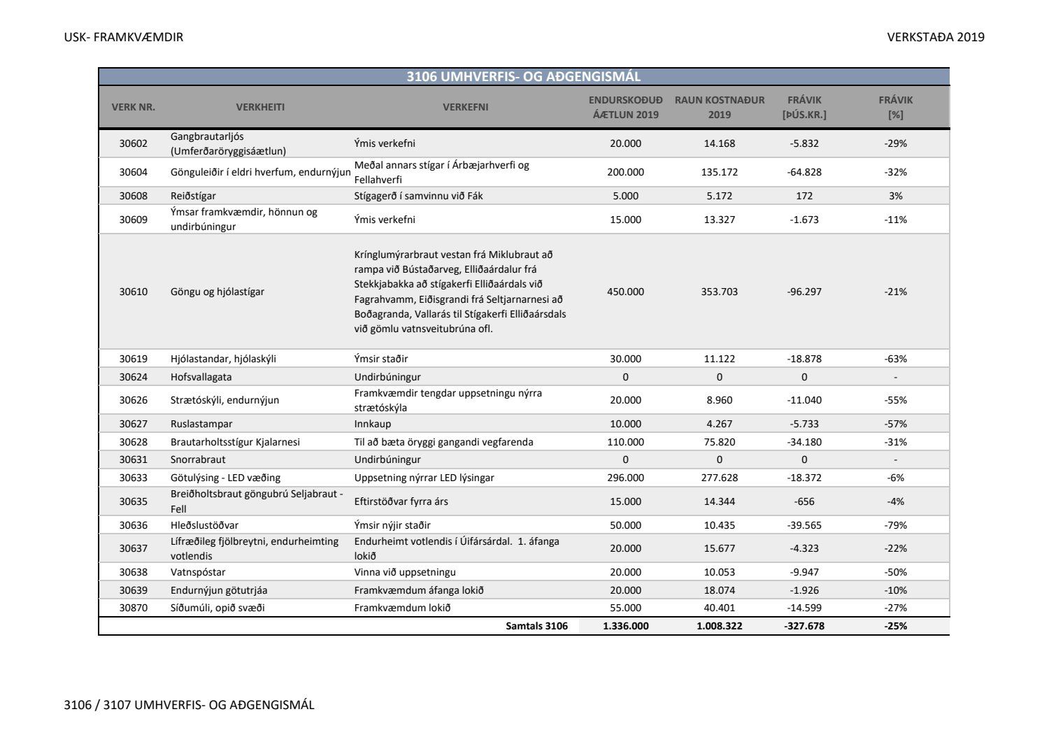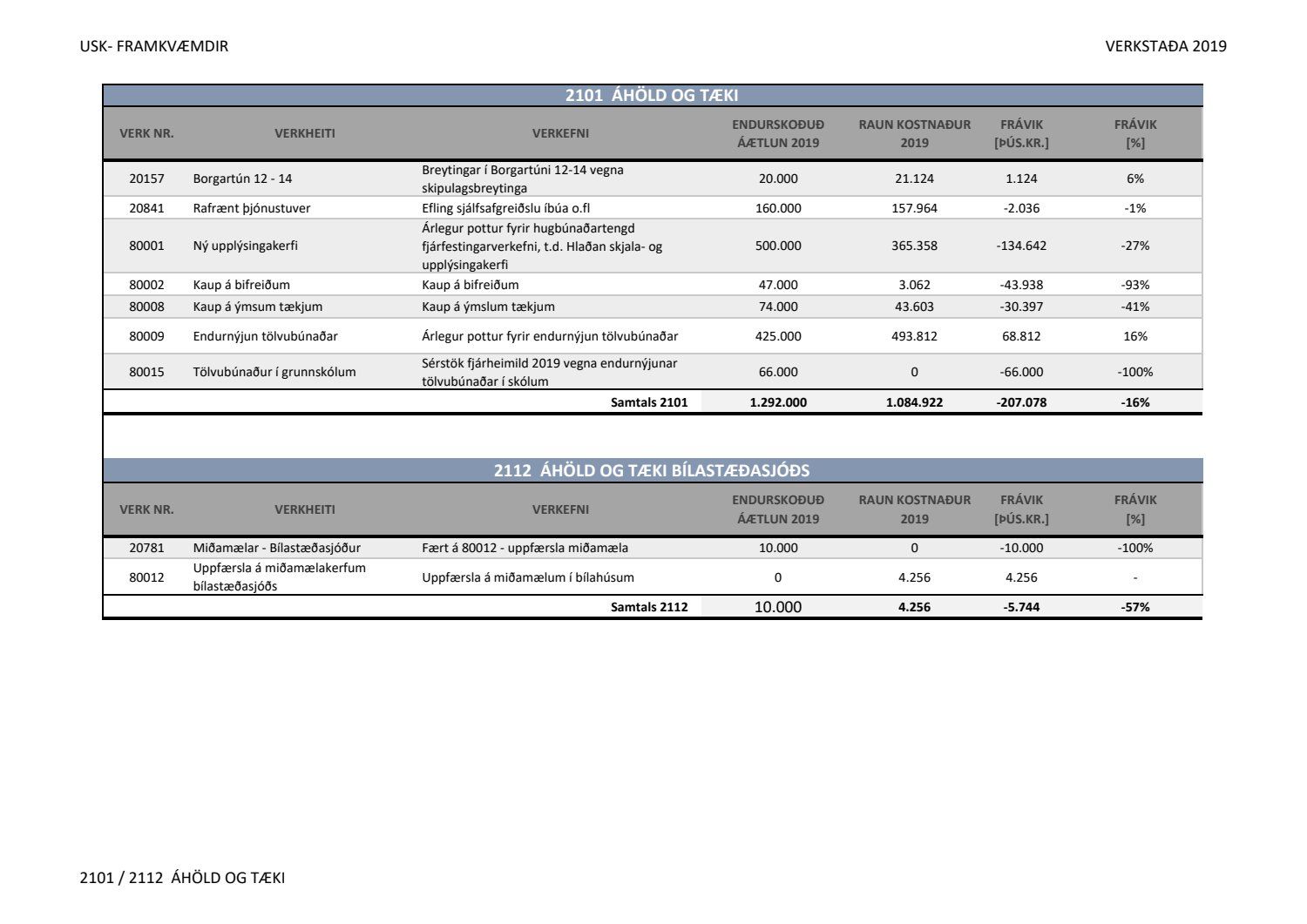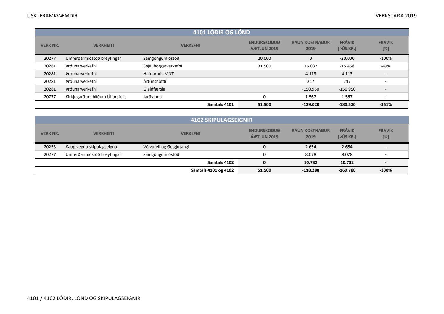 Lagðar fram greinargerðir Umhverfis- og skipulagssviðs í aðal- og eignasjóði. Einnig er lögð fram skýrsla um verkstöðu nýframkvæmda ódags.