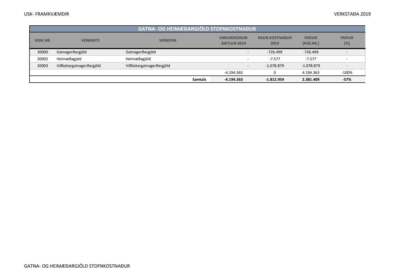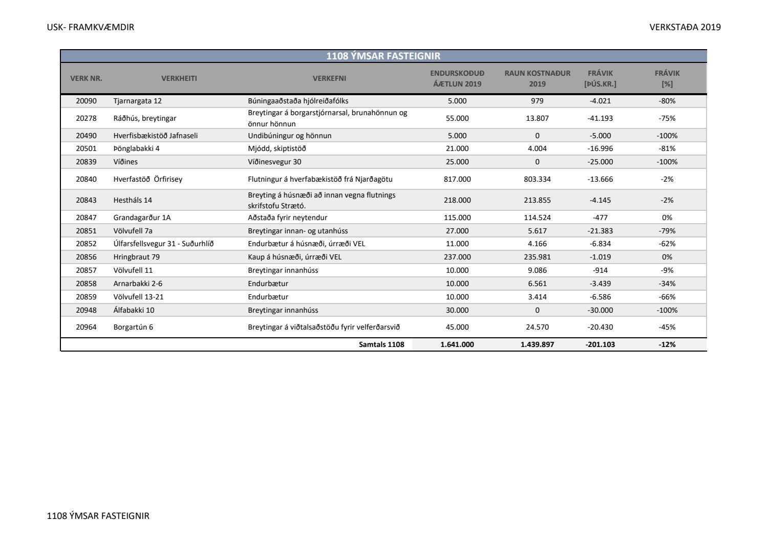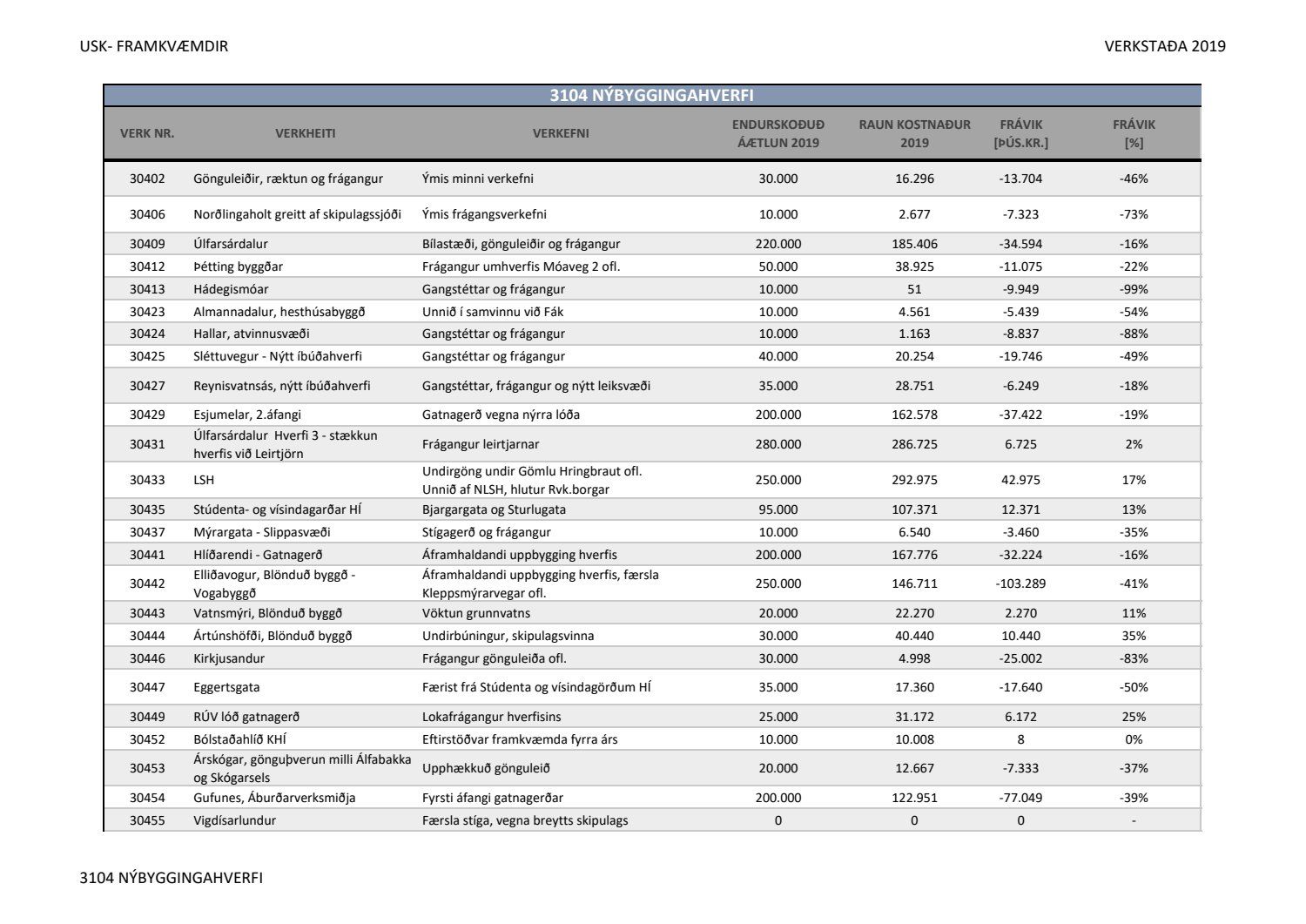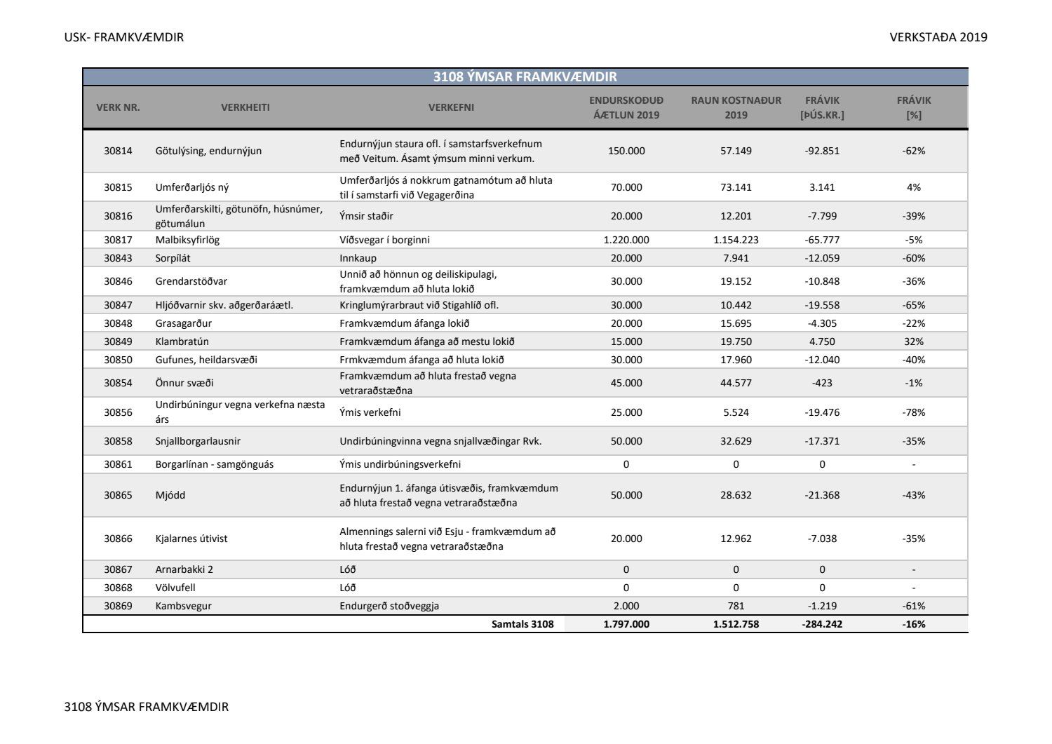 Lagðar fram greinargerðir Umhverfis- og skipulagssviðs í aðal- og eignasjóði. Einnig er lögð fram skýrsla um verkstöðu nýframkvæmda ódags.
