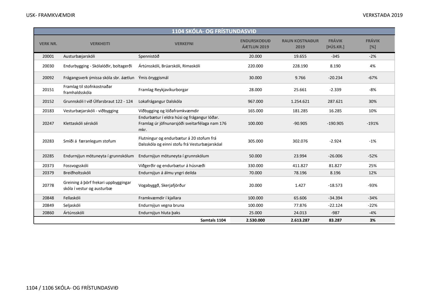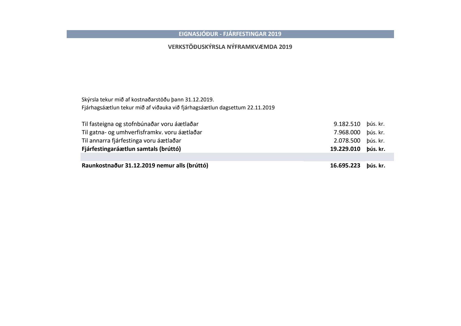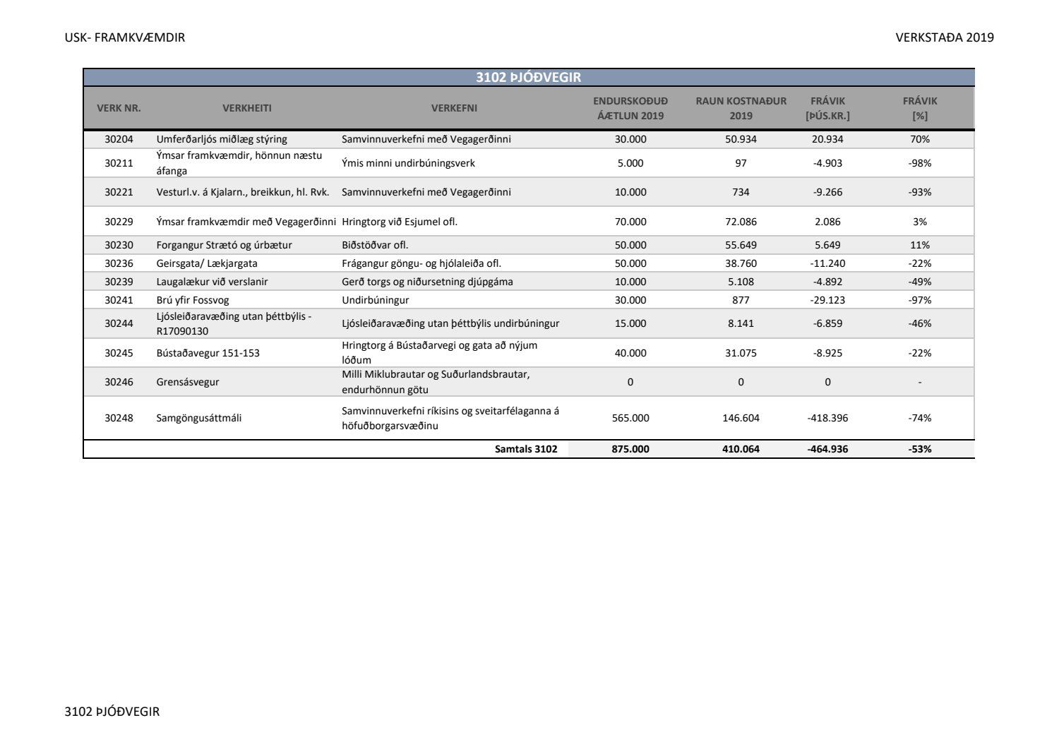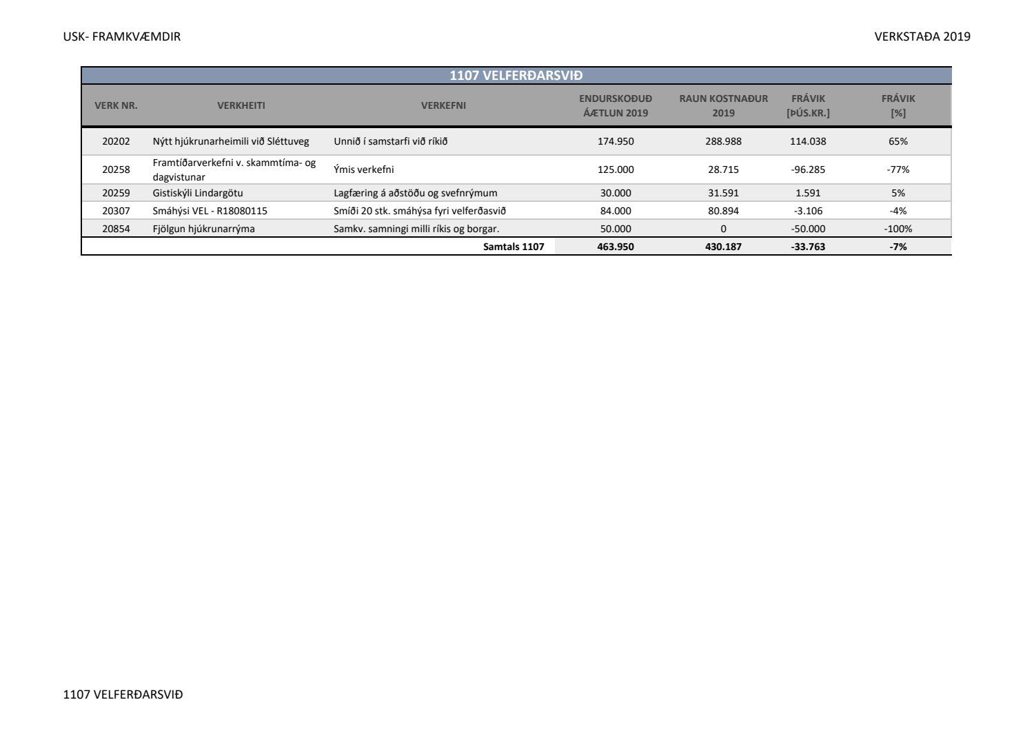 Lagðar fram greinargerðir Umhverfis- og skipulagssviðs í aðal- og eignasjóði. Einnig er lögð fram skýrsla um verkstöðu nýframkvæmda ódags.