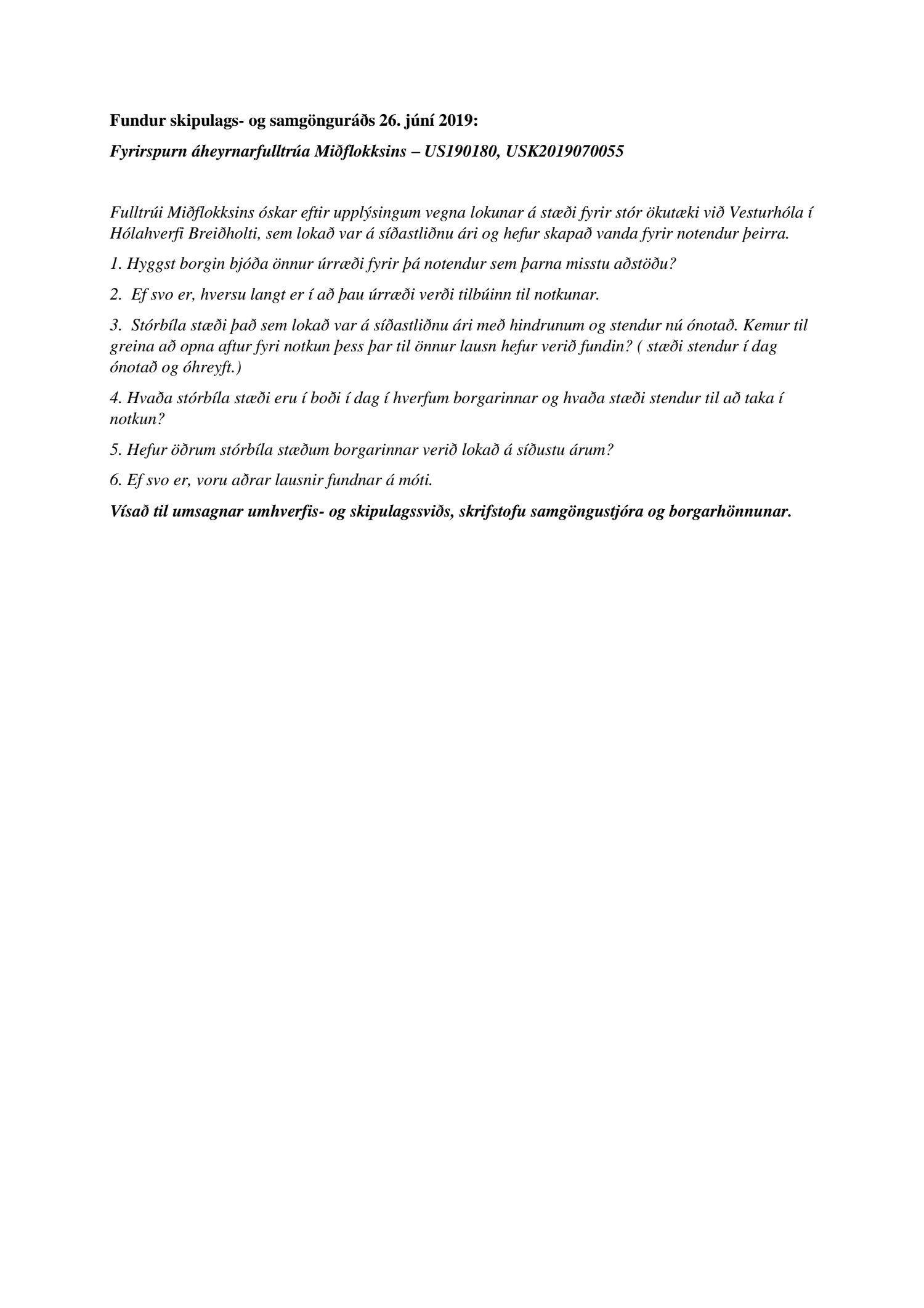 Lögð er fram fyrirspurn áheyrnarfulltrúa Miðflokksins sem barst skipulags- og samgönguráði og var vísað til umsagnar skrifstofu samgöngustjóra og
