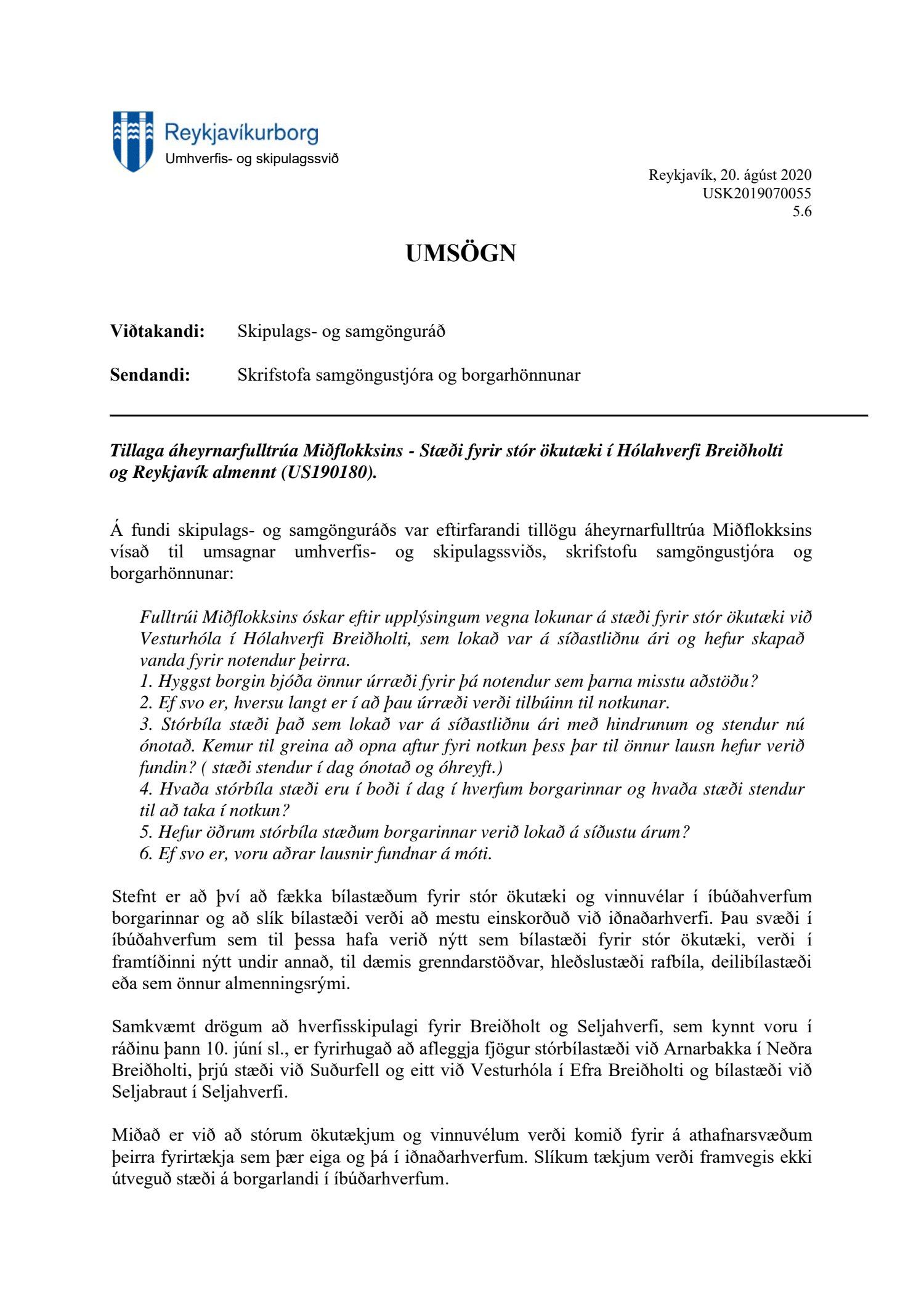 Ekki nóg með það að borgarstjóri og meirihlutinn er að flæma burt fyrirtæki úr borginni, verslunar og veitingamenn úr 101, þá á að flæma einyrkja og atvinnubílstjóra úr landmiklum hverfum borgarinnar. Stórbílastæðum skal nú úthýst í iðnarðarhverfi. Hvað gengur meirihlutanum til? Hverjum er til ama að atvinnubílstjórar leggi bílum sínum á bílastæðum í útjaðri hverfanna? Megnið af atvinnubílstjórum eru einyrkjar sem stunda sína vinnu frá heimilum sínum. Nú skulu boð og bönn ríkja og atvinnubílstjórar skulu hraktir inn í iðnaðarhverfin. Hvað er átt við með þessu – á að fylla Höfðann með ökutækjum og vinnuvélum. Nei það er ekki hægt því hann er fullsetinn. Þá hlýtur sjónum verið beint til Esjumela sem ekki eru enn fullsetnir. Til þess að komast þangað þarf að keyra í gegnum heilt sveitarfélag og keyra fleiri, fleiri kílómetra. Seint verður slíkur óþarfa akstur talinn umhverfisvænn í stefnu meirihlutans. En það skiptir ekki máli – bara ef það hentar þeim. Þeim stórbílastæðum sem borgin hefur lokað með hindrunum er enn haldið lokuðum og eru engum til gagns. Nú stendur til að loka átta stórbílastæðum í Breiðholti samkvæm nýju hverfisskipulagi fyrir Breiðholt og Seljahverfi. Sú ákvörðun er hrein aðför að einyrkjum og öðrum þeim sem hafa hindrunar- og andmælalaust notað stæðin í gegnum árin.