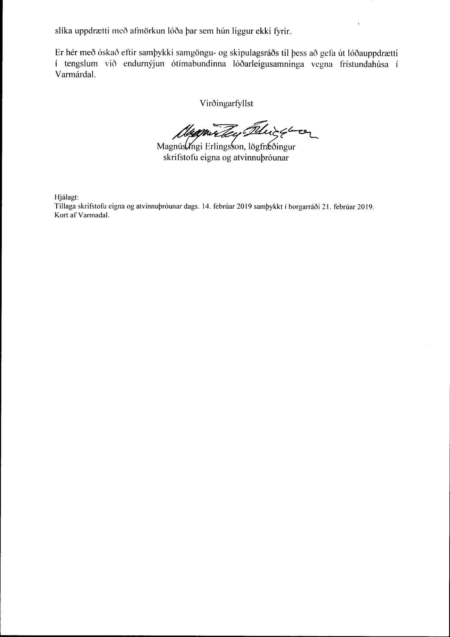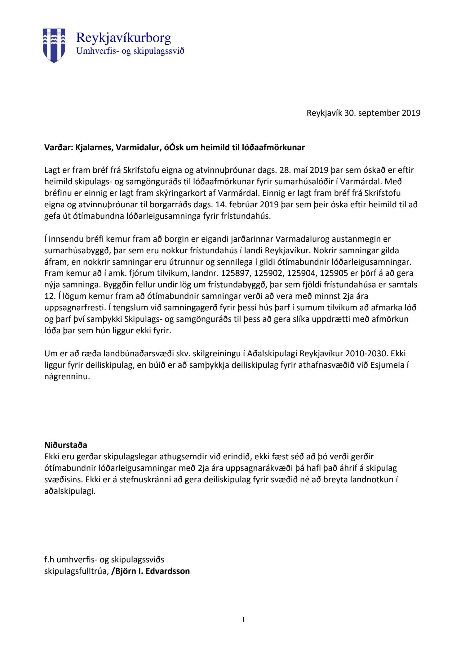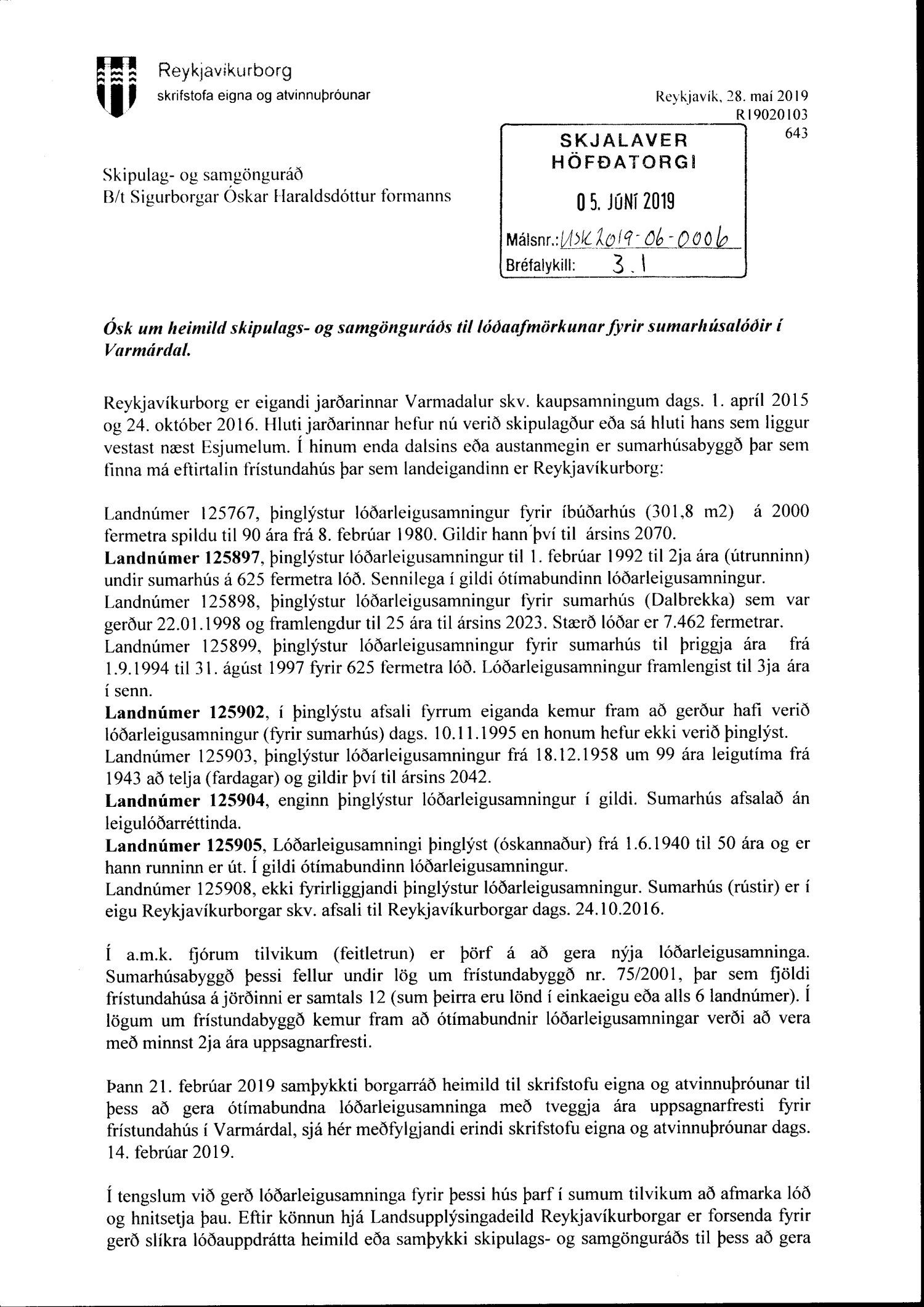 Lagt er fram bréf frá skrifstofu eigna- og atvinnuþróunar dags. 28. maí 2019 þar sem óskað er eftir heimild skipulags- og samgönguráðs til lóðaafmörkunar fyrir sumarhúsalóðir í Varmadal. Með bréfinu er einnig er lagt fram skýringarkort af Varmadal ásamt bréfi skrifstofu eigna- og atvinnuþróunar til borgarráðs dags. 14. febrúar 2019 þar sem óskað er eftir heimild til að gefa út lóðauppdrætti í tengslum við endurnýjun ótímabundinna lóðarleigusamninga fyrir frístundahús. Einnig lögð fram umsögn skipulagsfulltrúa 30. sept. 2019.