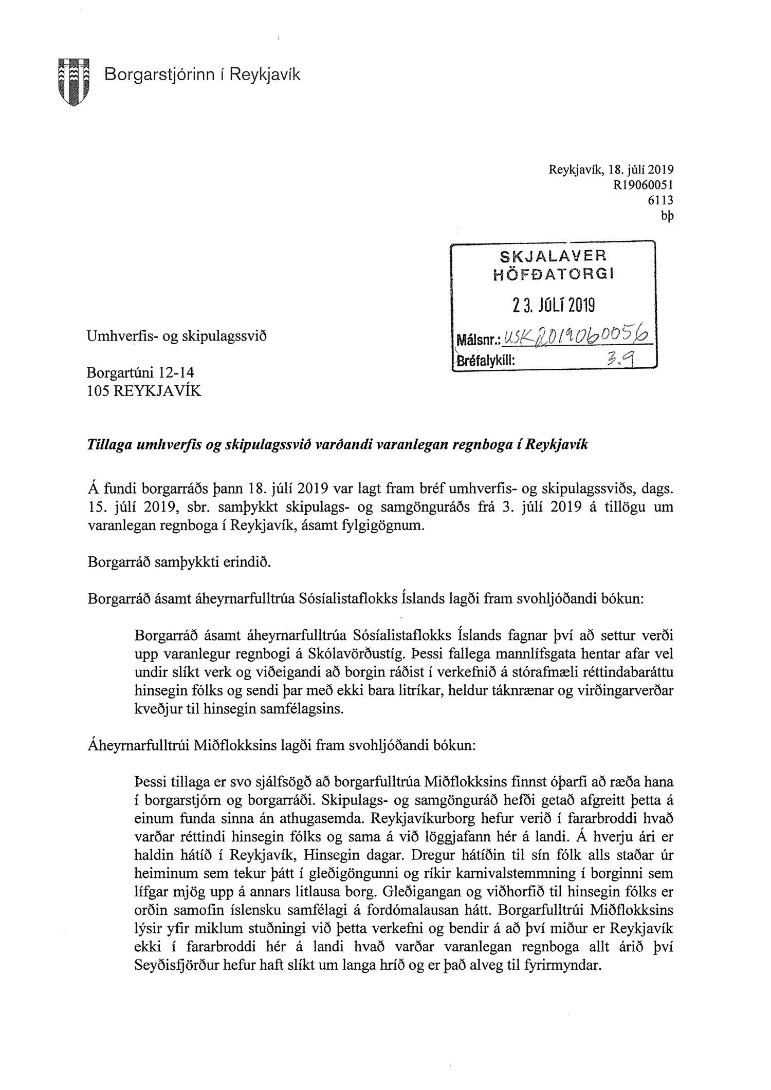 Lagt er fram bréf borgarstjóra dags. 18. júlí 2019 vegna samþykktar tillögu um varanlegan regnboga í Reykjavík.