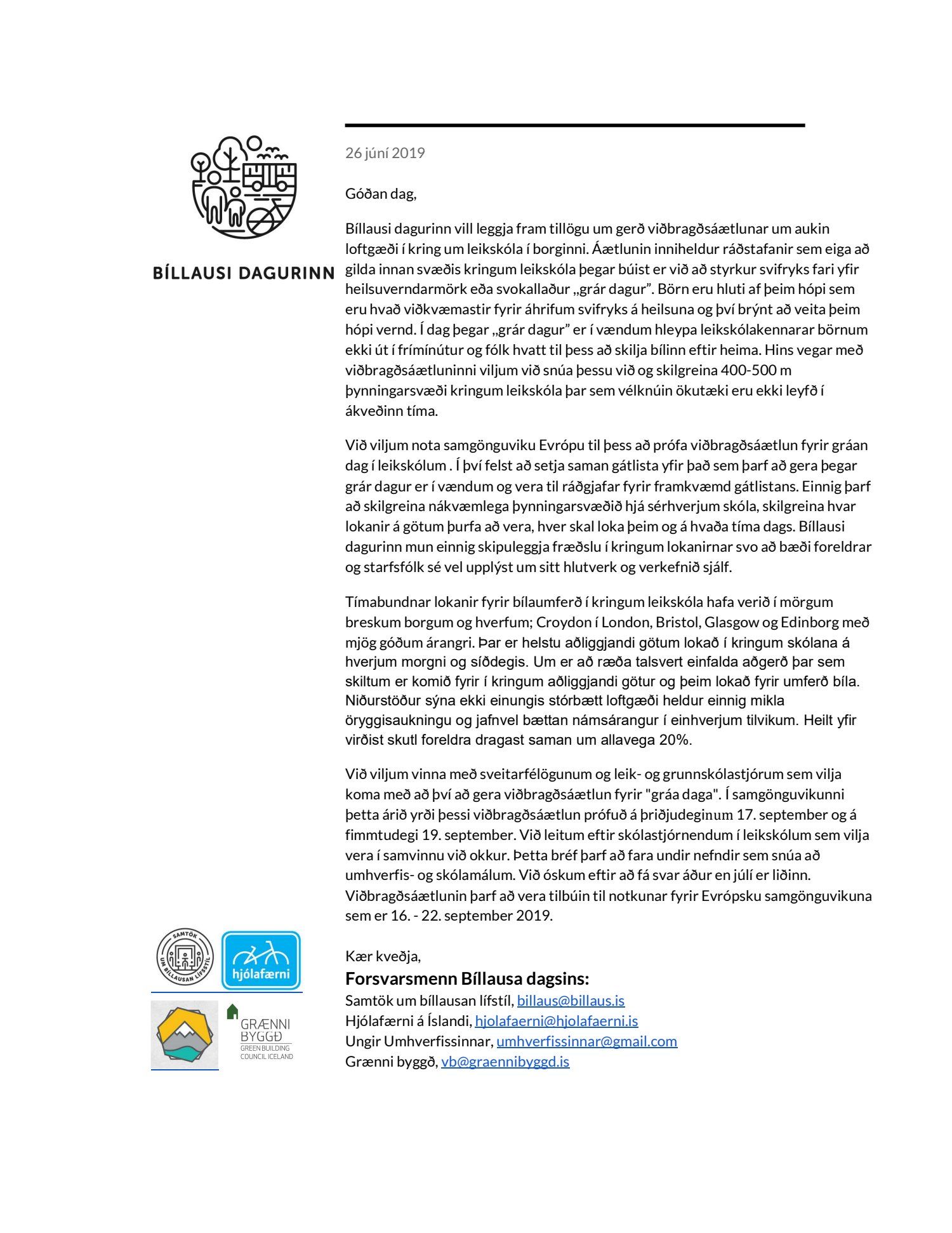 Lögð fram tillaga Bíllausa dagsins um gerð viðbragðsáætlunar um aukin loftgæði í kring um leikskóla í borginni, sbr. bréf Forsvarsmanna Bíllausa dagsins, dags. 26. júní 2019.