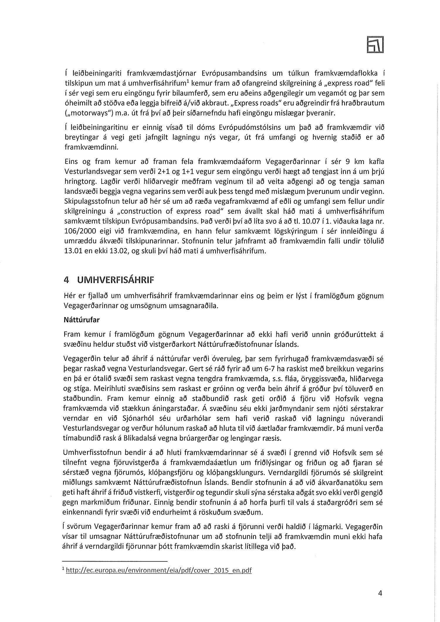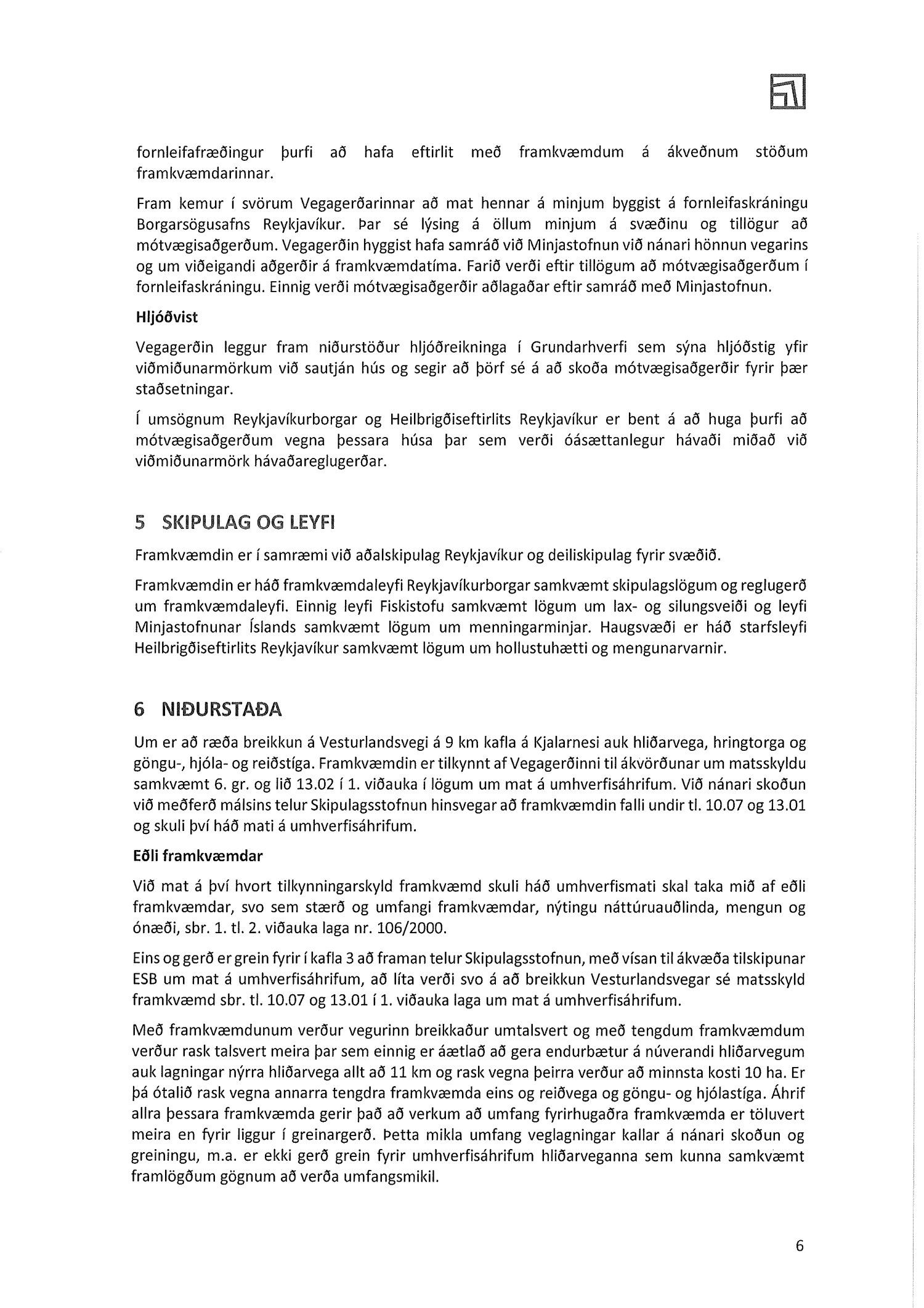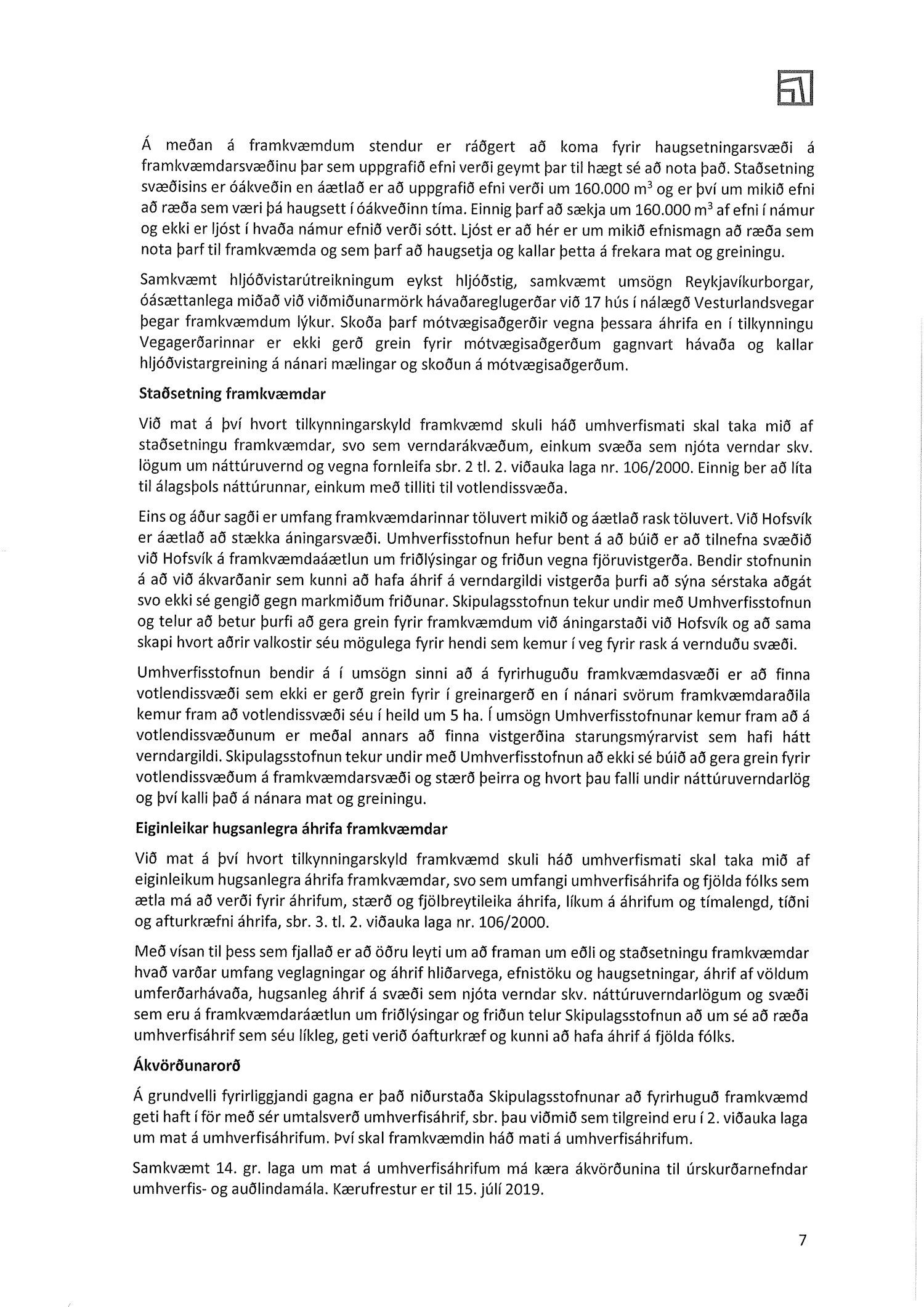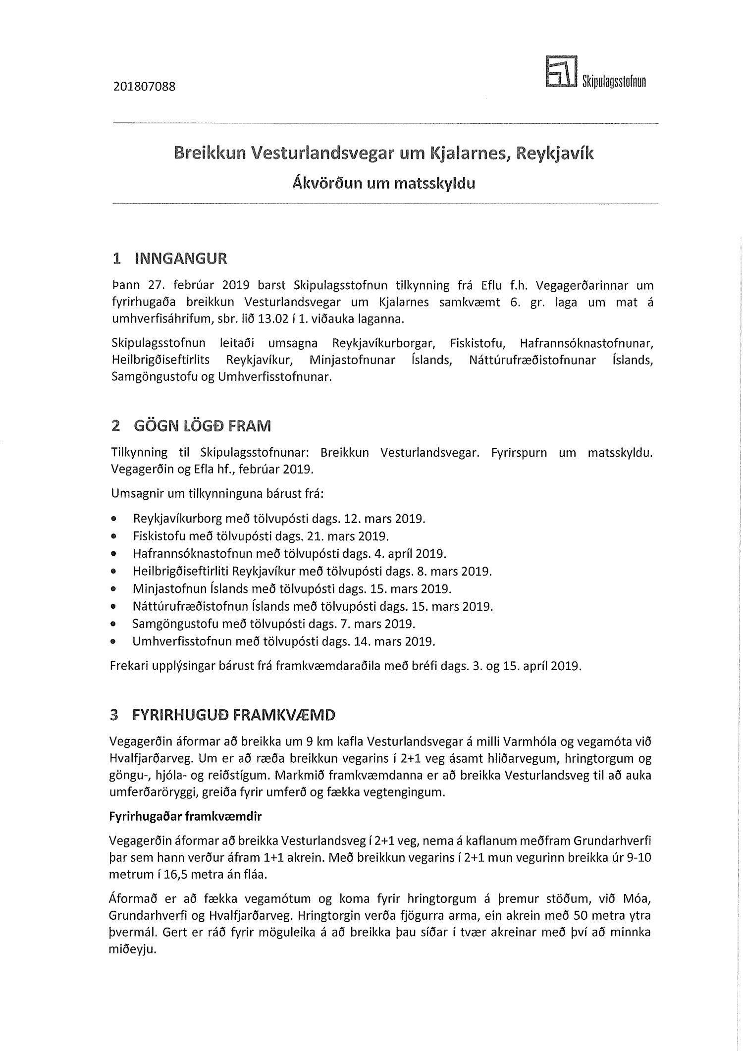 Lagt fram bréf Skipulagsstofnunnar dags. 11. júní 2019 um ákvörðun um matskyldu vegna breikkunnar Vesturlandsvegar um Kjalarnes.