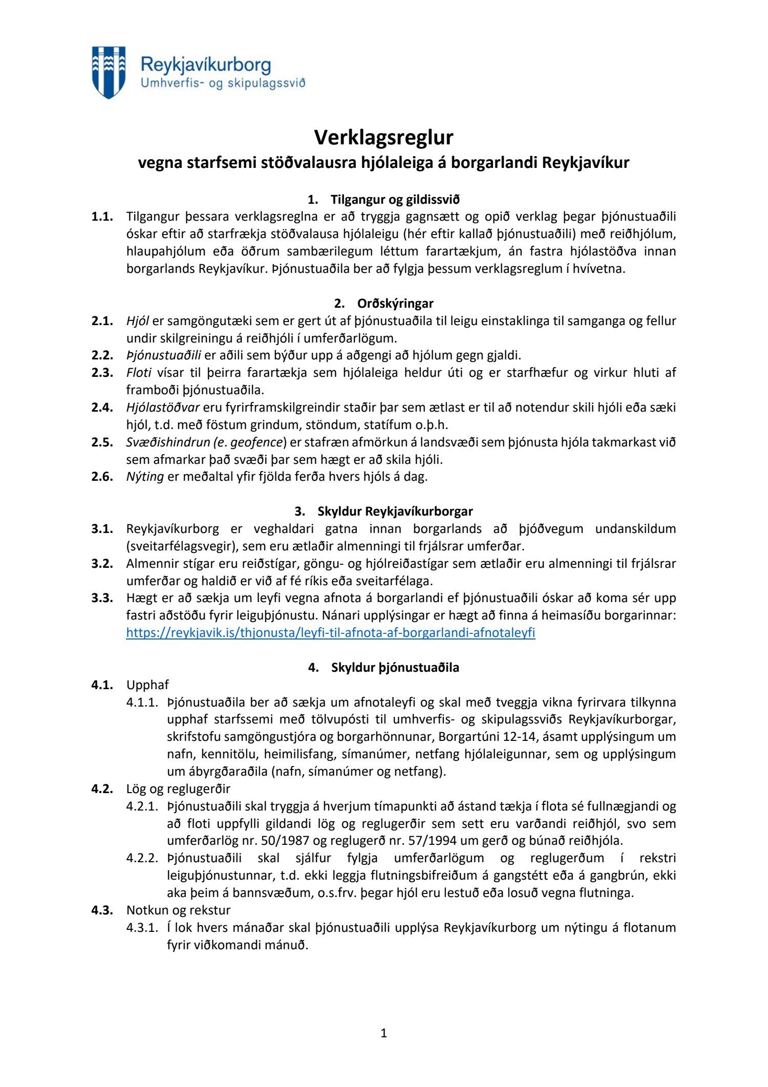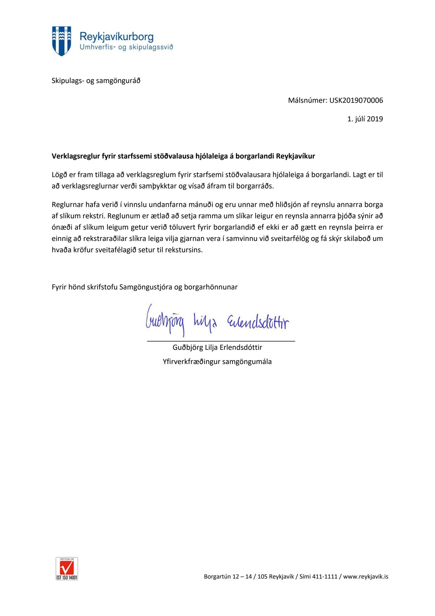 Lagt fram verklagsreglur fyrir starfssemi stöðvalausa hjólaleiga á borgarlandi Reykjavíkur dags. 1. júlí 2019. Einnig er lagt fram bréf Umhverfis- og skipulagssviðs, samgöngustjóra dags. 1. júlí 2019.
