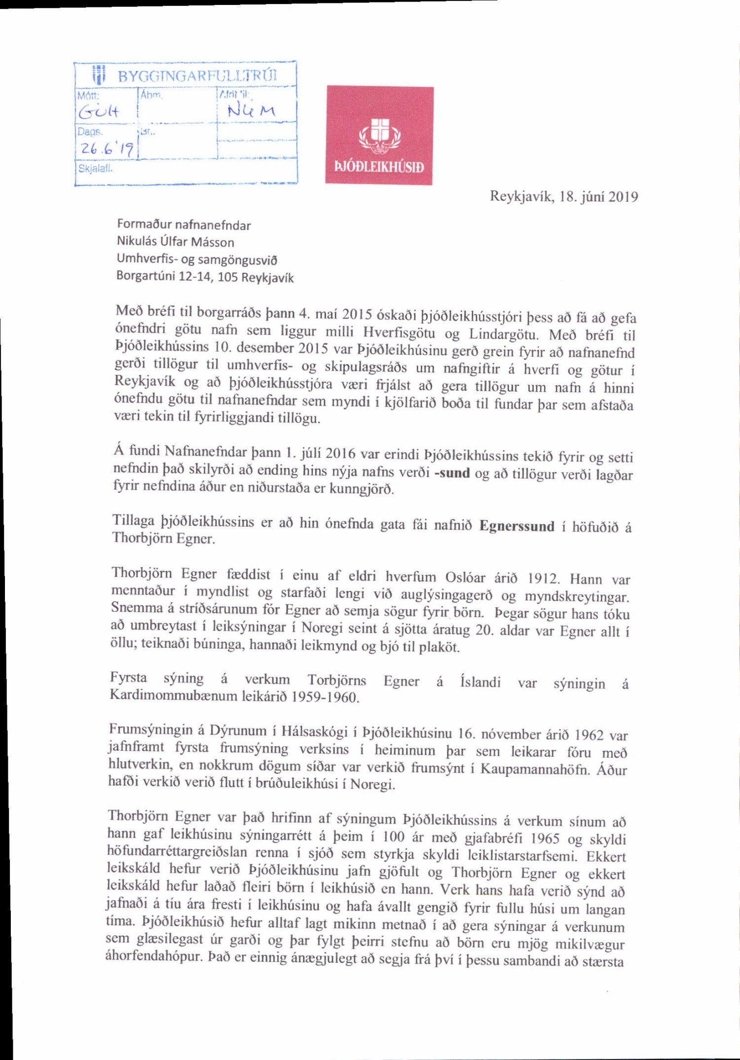Lagt er fram bréf byggingarfulltrúa f.h. Nafnanefndar dags. 29. ágúst 2019 með tillögu að heiti sunds, næst fyrir vestan Þjóðleikhúsið. Einnig er lagt frá bréf frá Þjóðleikhússtjóra dags. 18. júní 2019 og skjáskot af ja.is með staðsetningu sundsins.