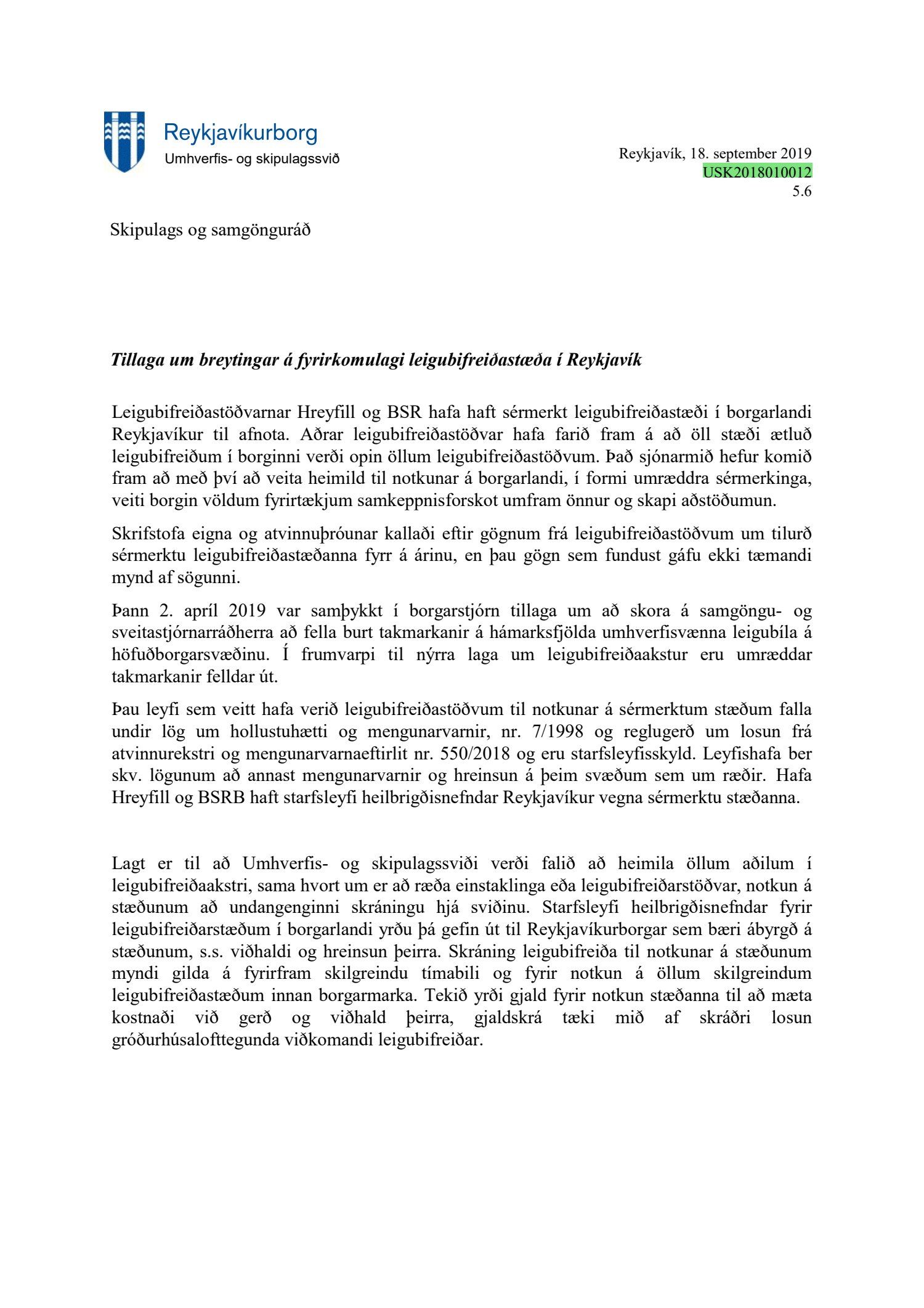Lagt fram bréf Umhverfis- og skipulagssviðs, skrifstofu samgöngustjóra og borgarhönnunar dags. 18. september, tillaga um breytingar á fyrirkomulagi leigubifreiðastæða í Reykjavík.