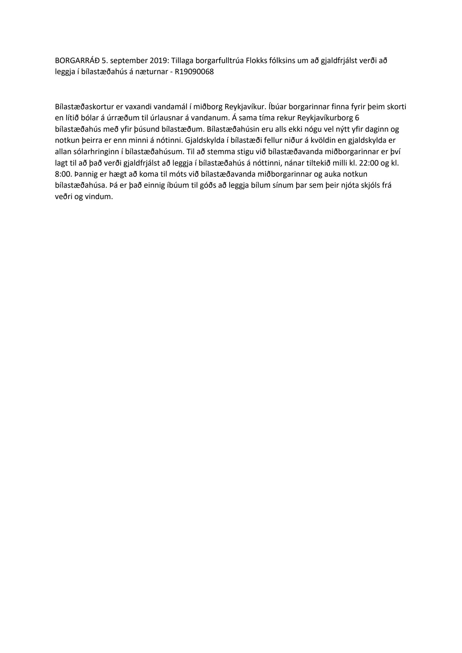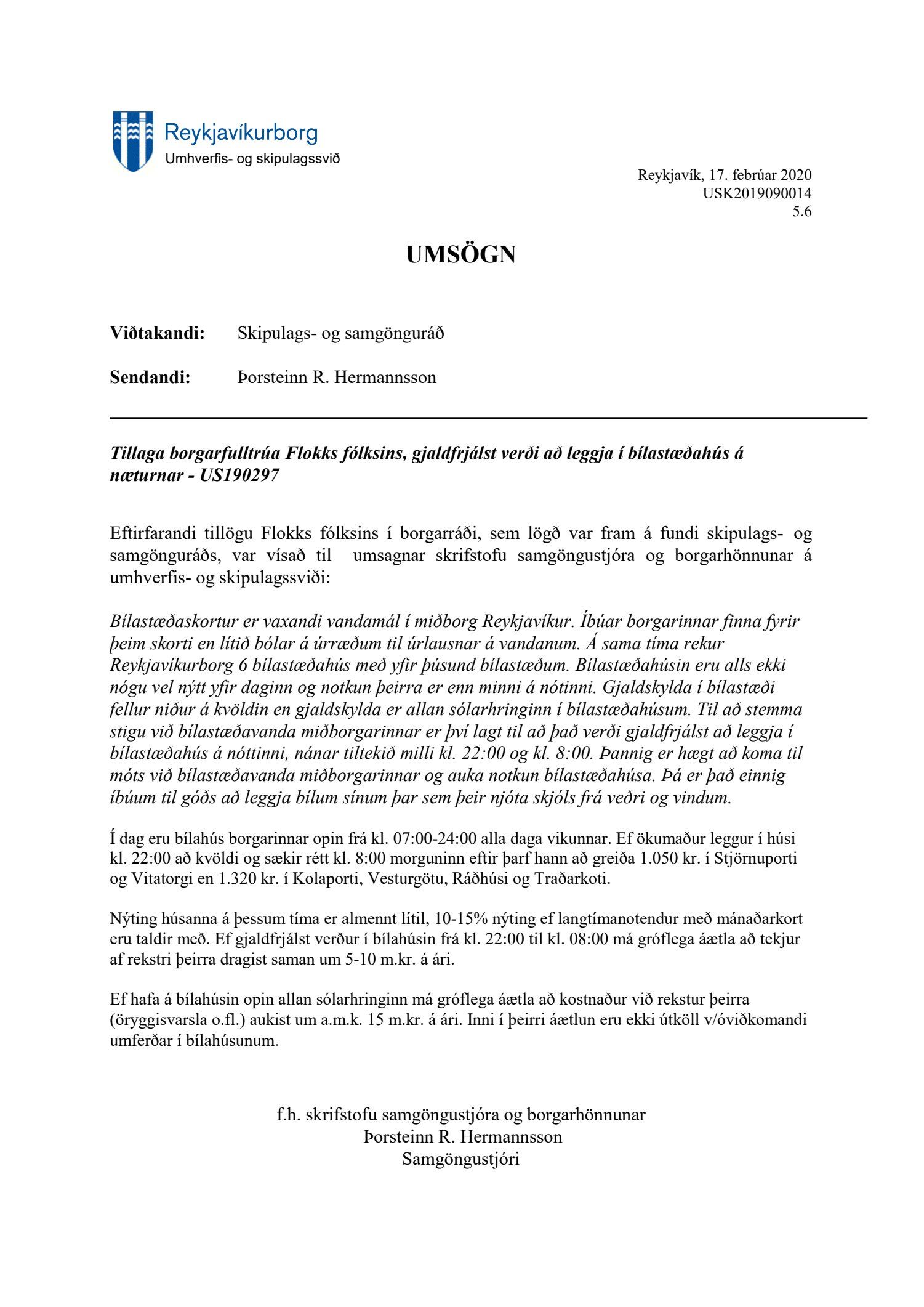 Lögð er fram umsögn frá umhverfis- og skipulagssviði, Skrifstofu samgöngustjóra og borgarhönnunnar, dags. 17. febrúar 2020 vegna tillögu borgarfulltrúa Flokks fólksins sem barst úr borgarráði dags. 5. september 2019, um að gjaldfrjálst verði að leggja í bílastæðahús á næturnar.