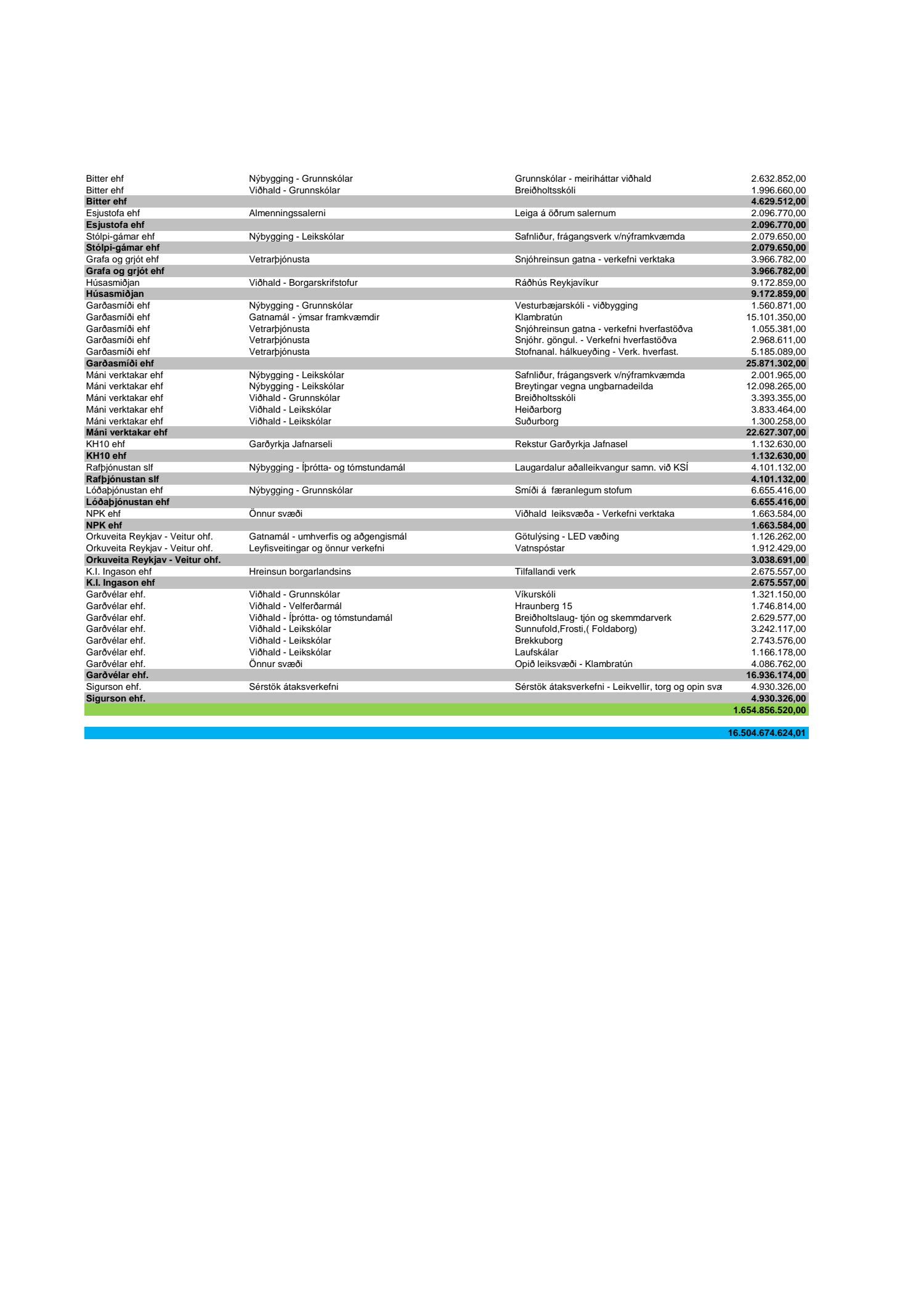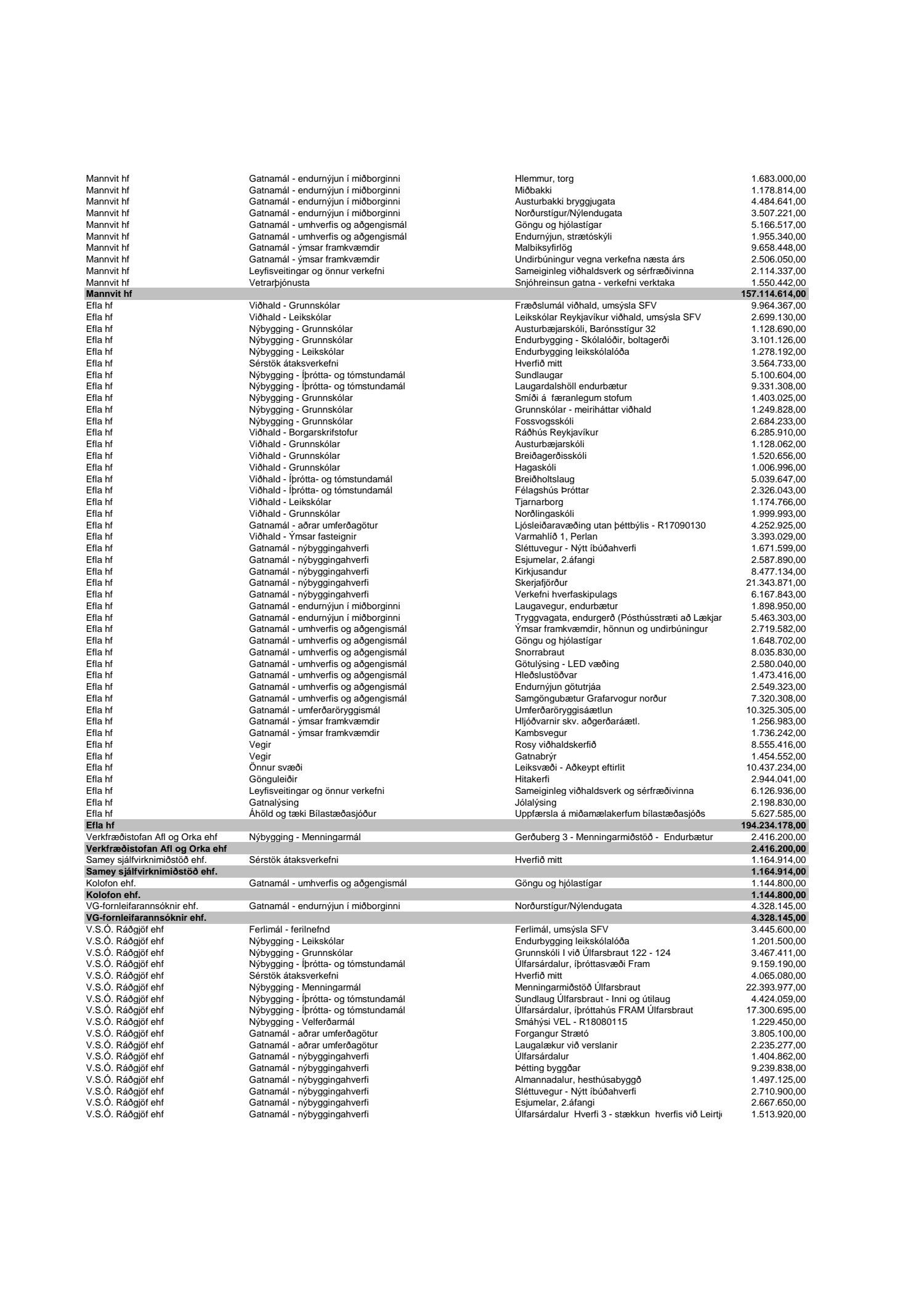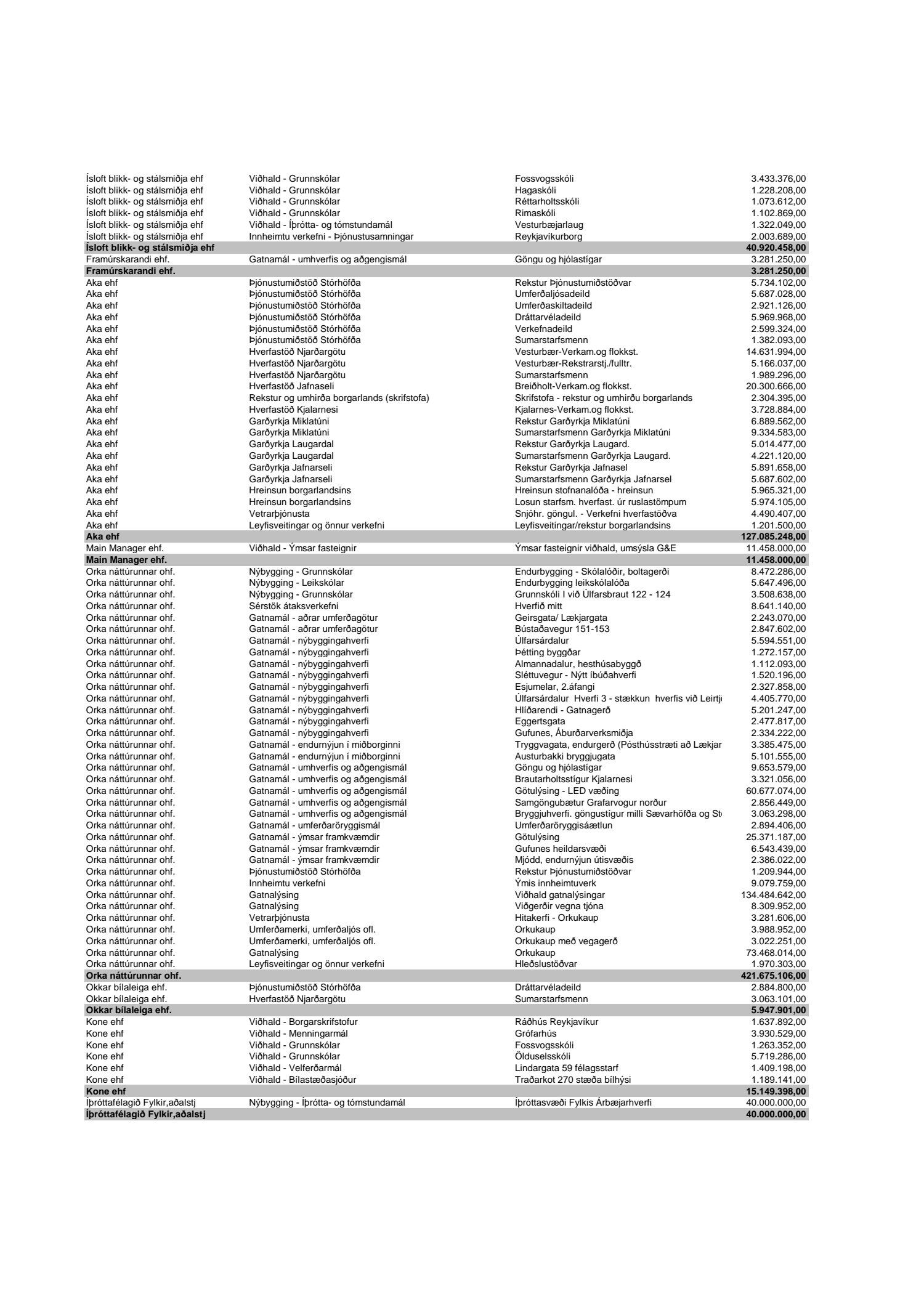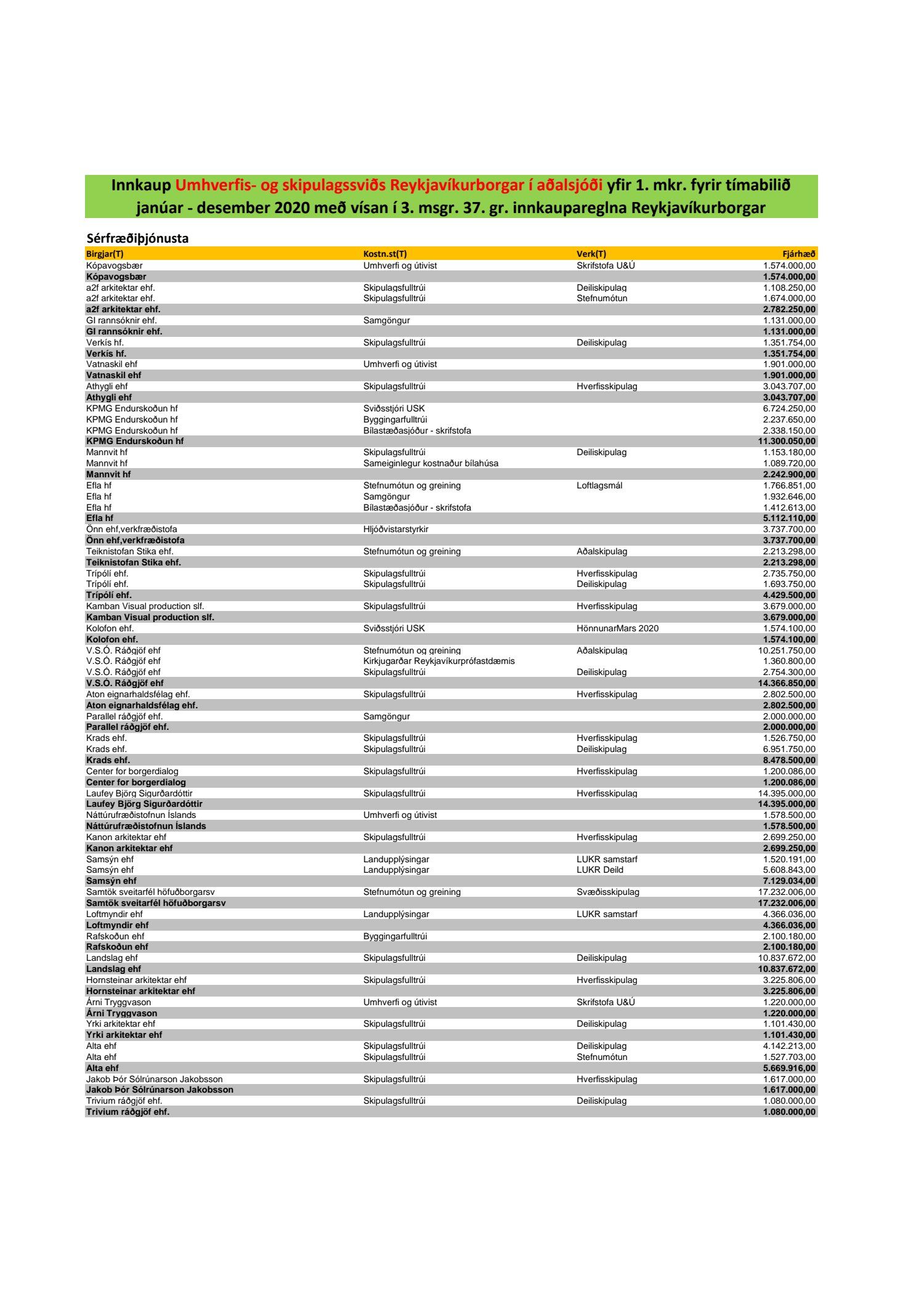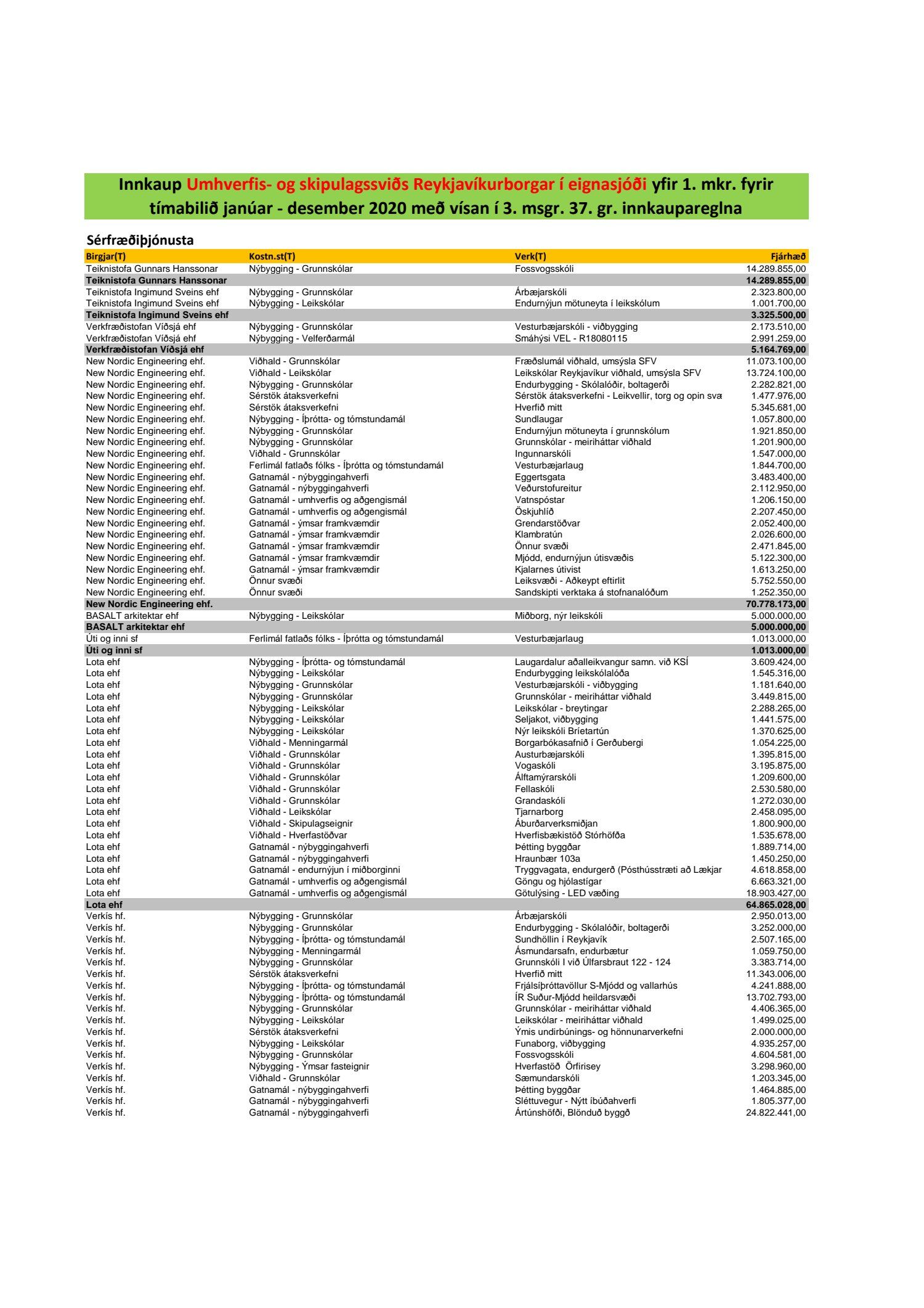 Erfitt er fyrir einstaka borgarfulltrúa að greina þennan lista um innkaup og átta sig á mikilvægi verkefna og hvort greiðslur séu í samræmi við verk og gæði og annað í þeim dúr. Samtals er um að ræða 16. 5 milljarð. Liðum eins og viðhaldsliðir, gatnagerð og þess háttar skýra sig e.t.v. sjálfir. Það vekur þó athygli hversu mikil vinna er keypt af ráðgjafa- og verkfræðistofum og hefur fulltrúi Flokks fólksins áður bókað um það. Á sviðinu starfa fjöldi sérfræðinga í umhverfis-, skipulags- og samgöngumálum en þrátt fyrir það virðist þurfa að kaupa ráðgjöf fyrir nánast hvert handtak, stórt eða smátt. Það er því ekki að undra að stundum upplifir borgarfulltrúinn eins og embættis- og starfsmenn séu ekki ráðnir sem sérfræðingar heldur frekar sem verkstjórar. En öll þessi vinna/ráðgjöf sem keypt er af utan að komandi sérfræðingum í stór sem smá verkefni vekur upp spurningar um hagkvæmni. Er sem dæmi enginn arkitekt á launaskrá hjá umhverfis- og skipulagsráði eða á skipulags- og samgönguráði? Annars segir þessi listi um innkaup kjörnum fulltrúa ekki mikið. Hvað er t.d. verið að greiða New Nordic Engineering ehf fyrir að upphæð 70.778.173.00?