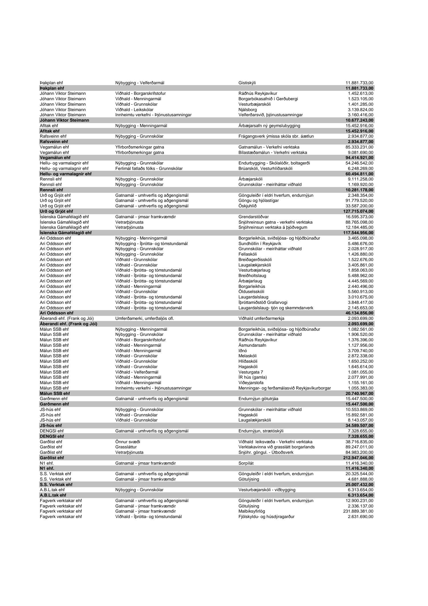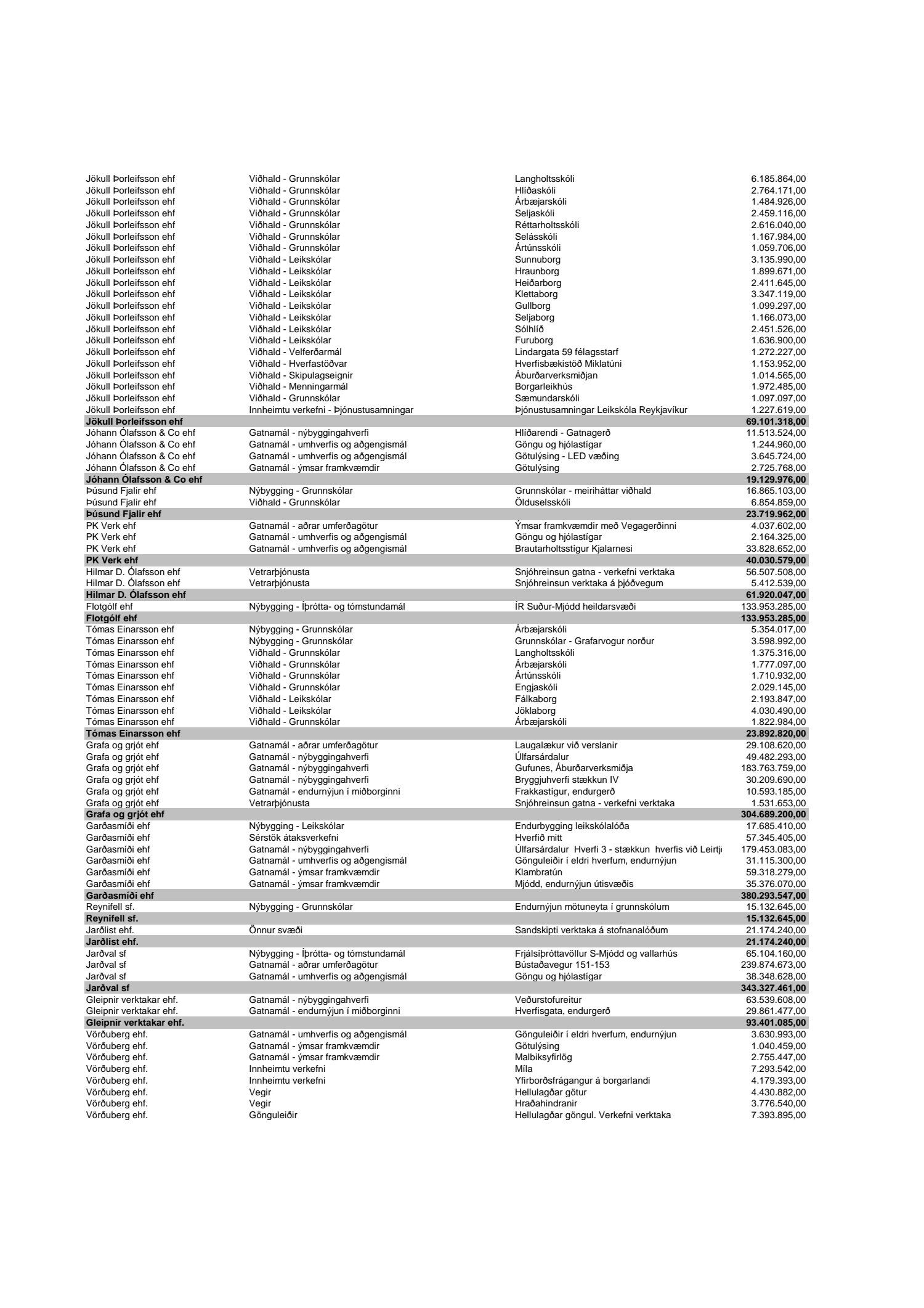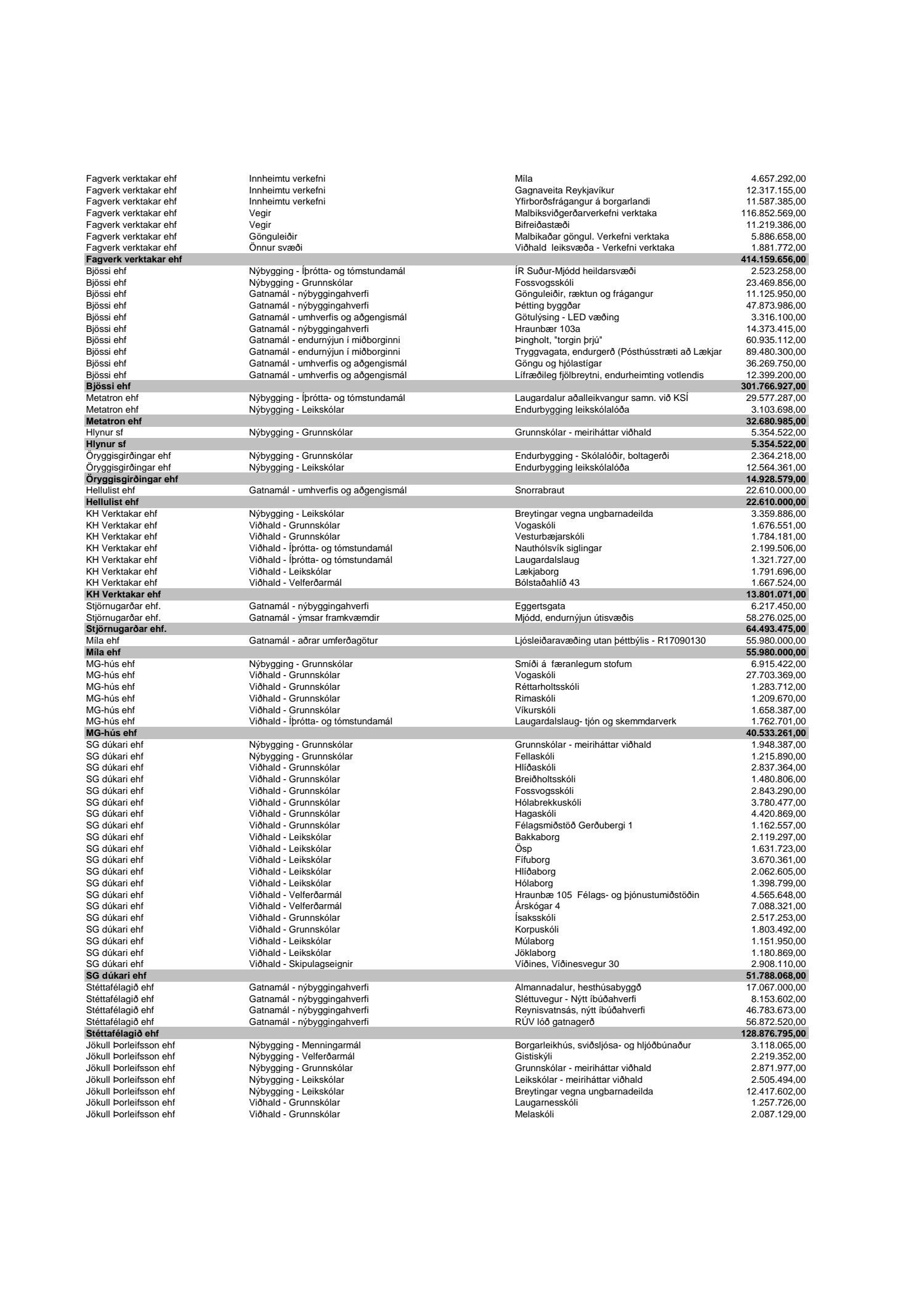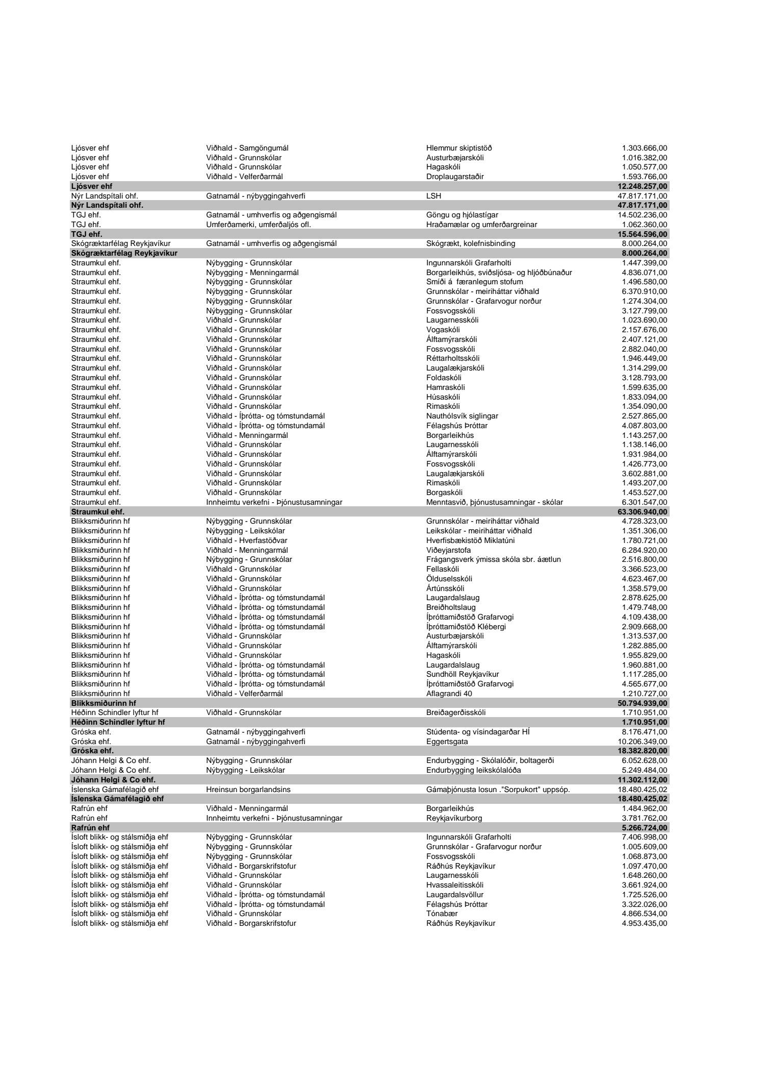 Erfitt er fyrir einstaka borgarfulltrúa að greina þennan lista um innkaup og átta sig á mikilvægi verkefna og hvort greiðslur séu í samræmi við verk og gæði og annað í þeim dúr. Samtals er um að ræða 16. 5 milljarð. Liðum eins og viðhaldsliðir, gatnagerð og þess háttar skýra sig e.t.v. sjálfir. Það vekur þó athygli hversu mikil vinna er keypt af ráðgjafa- og verkfræðistofum og hefur fulltrúi Flokks fólksins áður bókað um það. Á sviðinu starfa fjöldi sérfræðinga í umhverfis-, skipulags- og samgöngumálum en þrátt fyrir það virðist þurfa að kaupa ráðgjöf fyrir nánast hvert handtak, stórt eða smátt. Það er því ekki að undra að stundum upplifir borgarfulltrúinn eins og embættis- og starfsmenn séu ekki ráðnir sem sérfræðingar heldur frekar sem verkstjórar. En öll þessi vinna/ráðgjöf sem keypt er af utan að komandi sérfræðingum í stór sem smá verkefni vekur upp spurningar um hagkvæmni. Er sem dæmi enginn arkitekt á launaskrá hjá umhverfis- og skipulagsráði eða á skipulags- og samgönguráði? Annars segir þessi listi um innkaup kjörnum fulltrúa ekki mikið. Hvað er t.d. verið að greiða New Nordic Engineering ehf fyrir að upphæð 70.778.173.00?
