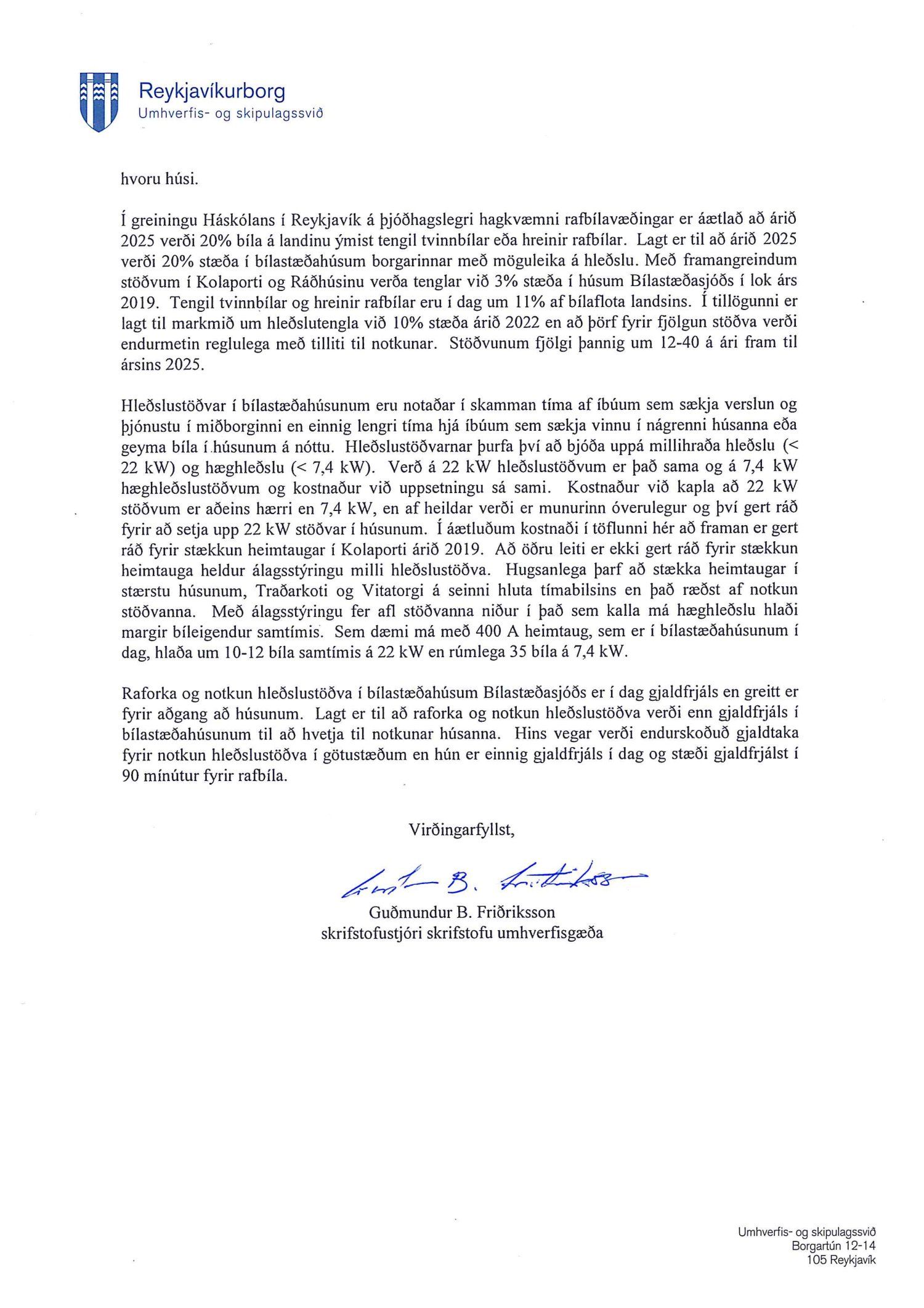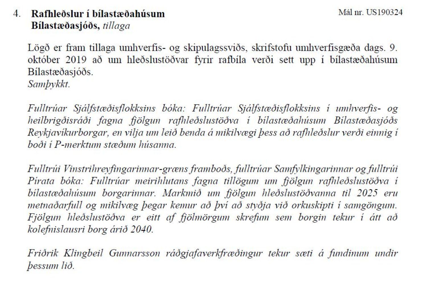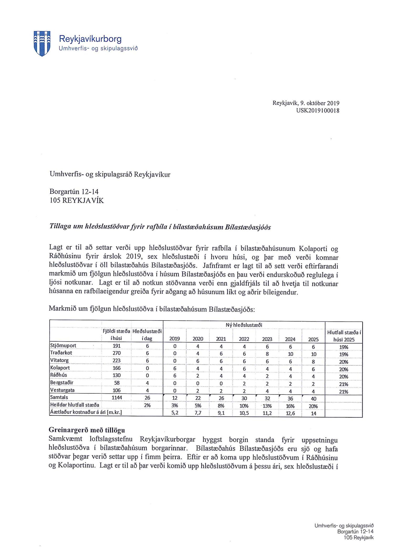 Lagt fram til kynningar bréf skrifstofu umhverfisgæða dags. 9. október 2019 þar sem lagt er til að settar verði upp hleðslustöðvar fyrir rafbíla í Bílastæðahúsunum Kolaporti og Ráðhúsinu fyrir árslok 2019, sex hleðslustöðvar í hvoru húsi, og þar með verði komnar hleðslustöðvar í öll bílastæðahús Bílastæðasjóðs. Einnig er lögð fram útskrift úr gerðabók umhverfis- og heilbrigðisráðs þar sem málið var staðfest og vísað til meðferðar.