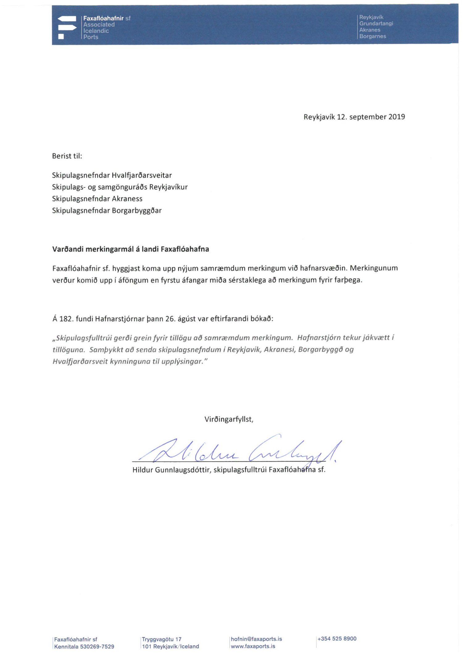 Lagt fram bréf Faxaflóahafna dags. 12. september 2019 ásamt tillögu ódags. að samræmdum merkingum á landi Faxaflóahafna.