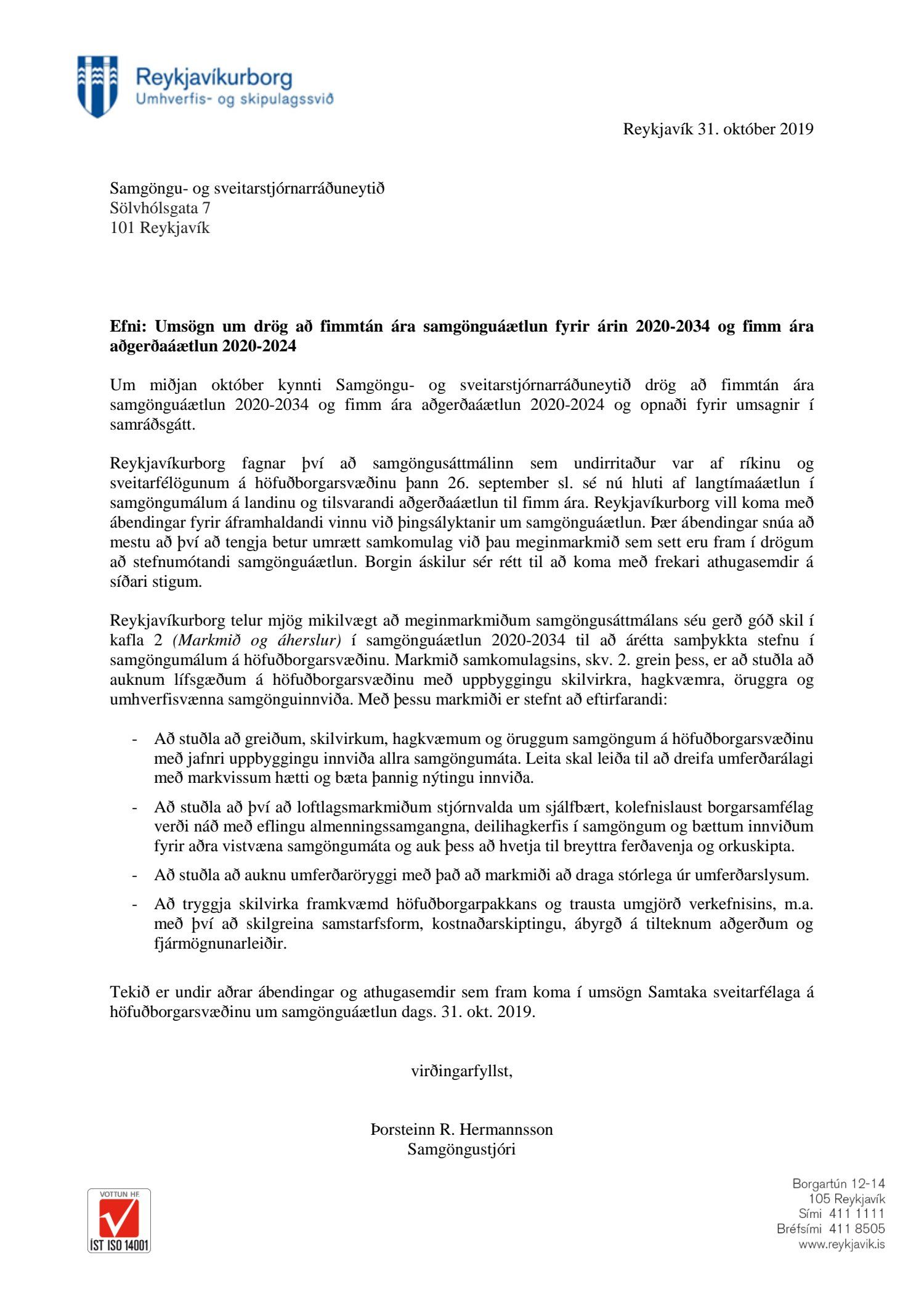 Lögð er fram umsögn umhverfis- og skipulagssviðs, samgöngustjóra, dags. 31. október 2019 um drög að fimmtán ára samgönguáætlun 2020-2034 og fimm ára aðgerðaáætlun 2020-2024.
