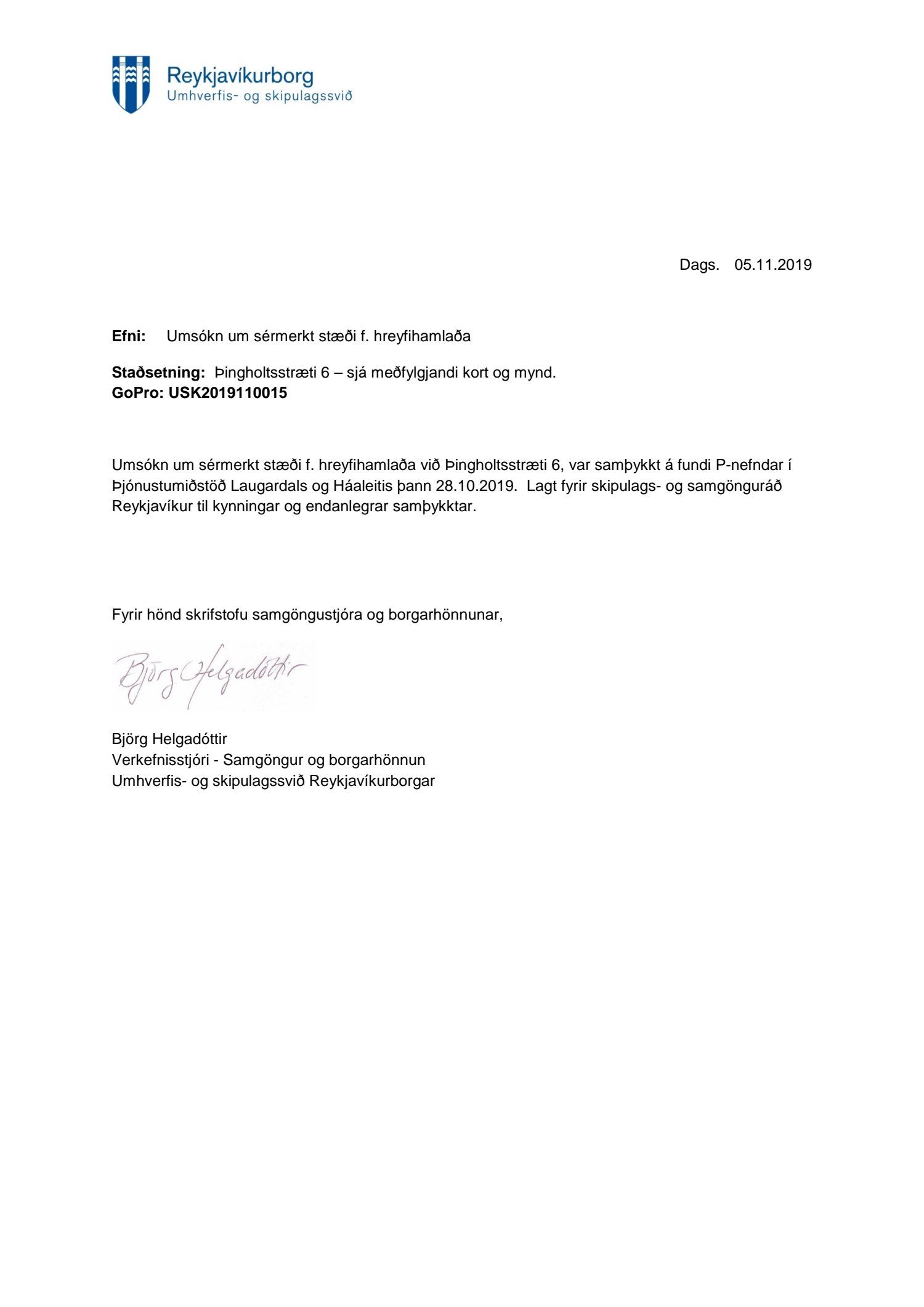 Lagt er fram bréf dags. 5. nóvember 2019 vegna umsóknar um sérmerkt p-stæði við Þingholtsstræti 6, var samþykkt á fundi P-nefndar í Þjónustumiðstöð Laugardals og Háaleitis þann 28.10.2019. Lagt fyrir skipulags- og samgönguráð Reykjavíkur til kynningar og endanlegrar samþykktar.