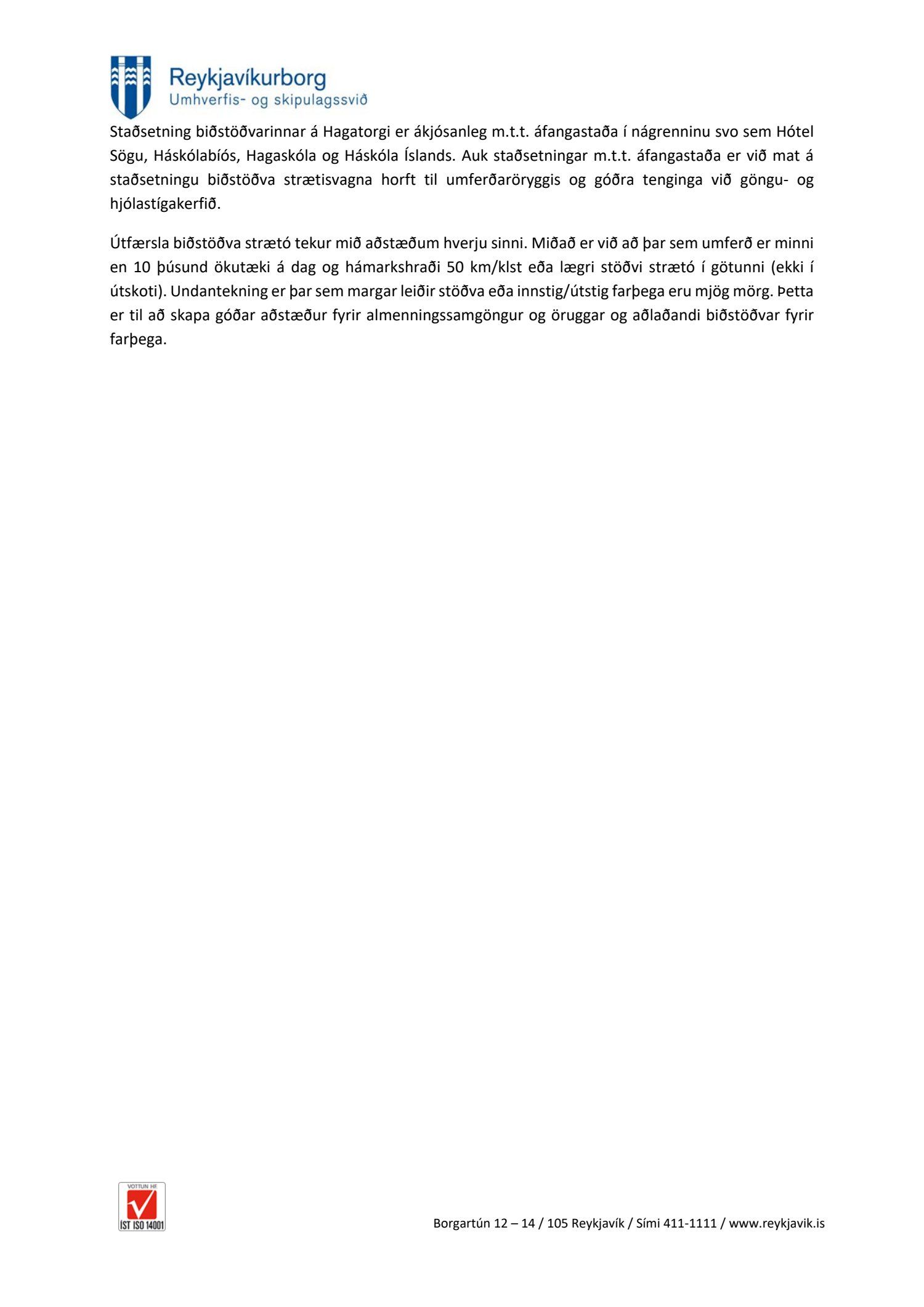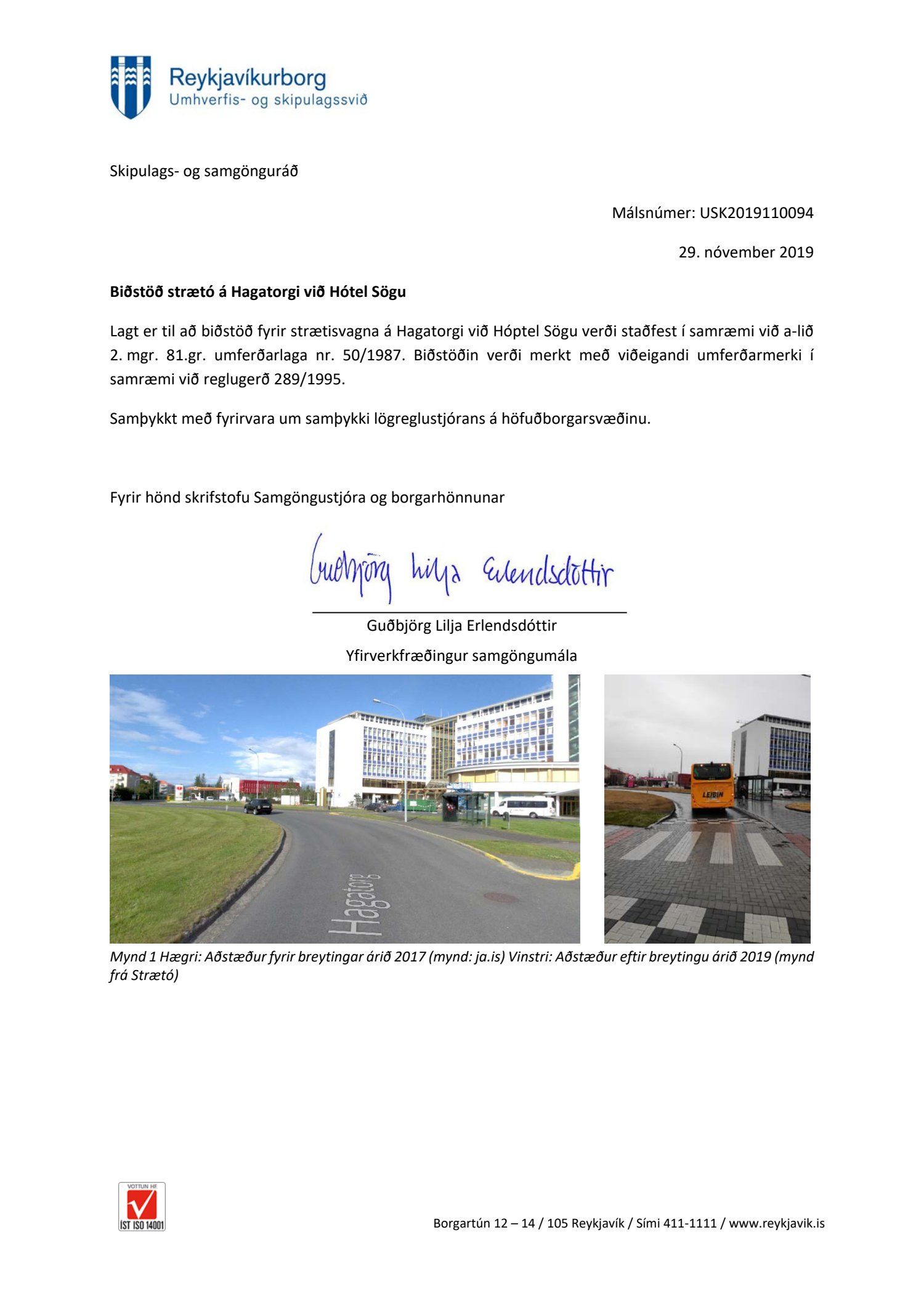 Lagt fram bréf skrifstofu samgöngustjóra og borgarhönnunar dags. 29. nóvember 2019 þar sem lagt er til að biðstöð fyrir strætisvagna á Hagatorgi við Hótel Sögu verði staðfest í samræmi við a-lið 2. mgr. 81. gr. umferðarlaga nr. 50/1987. Biðstöðin verði merkt með viðeigandi umferðarmerki í samræmi við reglugerð 289/1995.