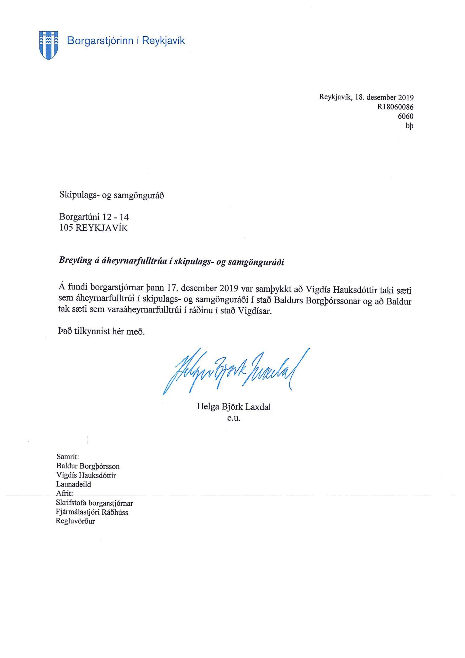 Lagt fram bréf skrifstofu borgarstjórnar dags. 18. desember 2019 þar sem tilkynnt er að Vigdís Hauksdóttir tekur sæti sem fulltrúi í skipulags- og samgönguráði í stað Baldurs Borgþórssonar. Jafnframt er lagt til að Baldur taki sæti sem varamaður í ráðinu í stað Vigdísar Hauksdóttur.