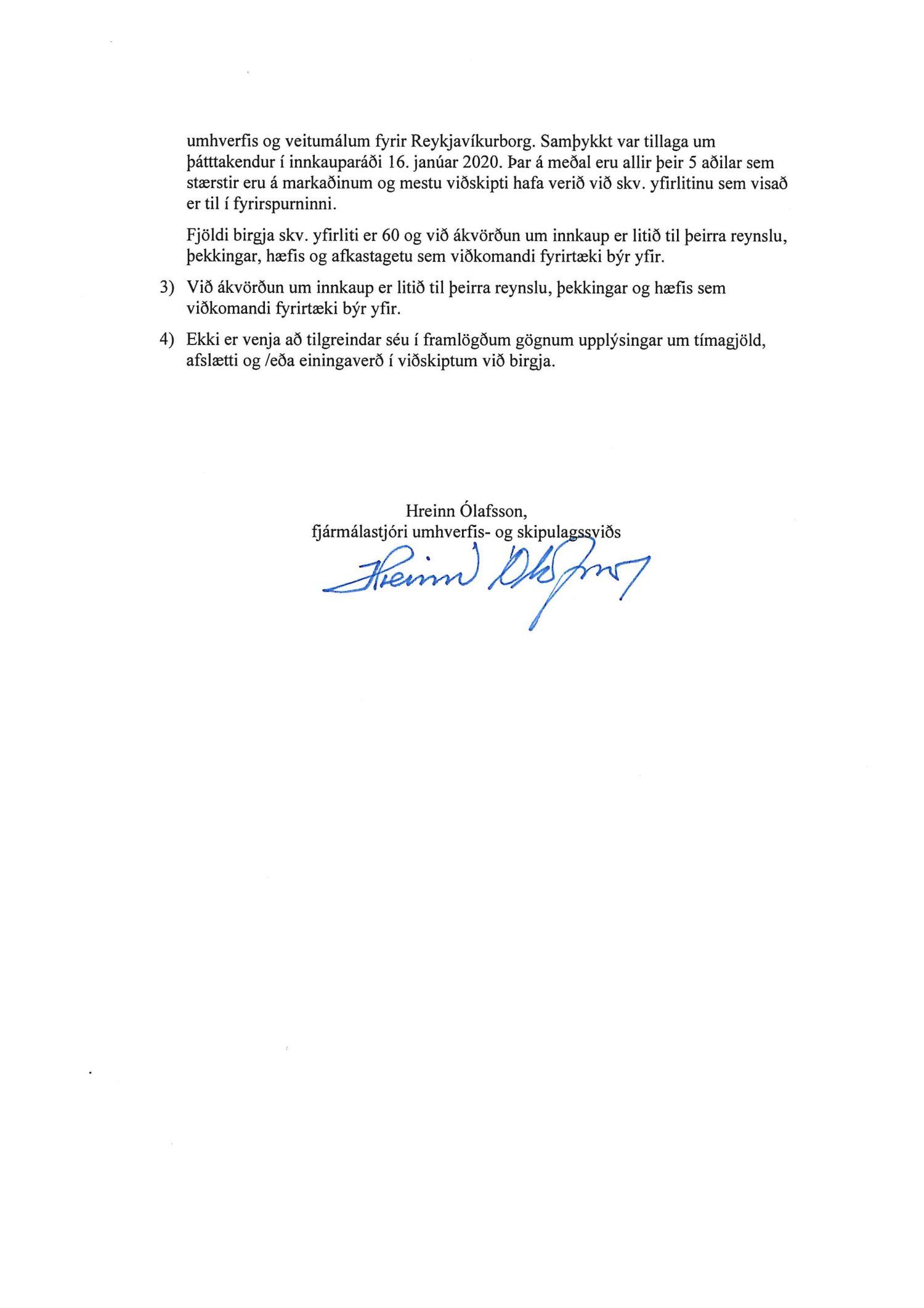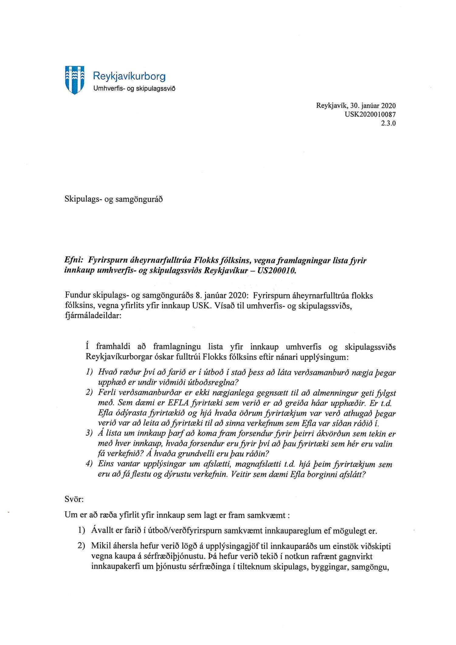 Eins og oft áður eru svör við fyrirspurnum ótæmandi og almennar. Hvernig á almenningur að átta sig á hvort eitt tilboð er betra en annað ef litlar sem engar upplýsingar fylgja tilboðum fyrirtækja, eða ásett verð þeirra á tiltekna framkvæmd sem ekki þarf að fara í útboð? Hvort er afsláttur eða ekki og hvaða listaverð miðar eitt fyrir tæki við og hvað hitt fyrirtækið? Það vaknar sú spurning þegar skoðaðar eru framkvæmdir á vegum borgarinnar þá eru oftast sömu fyrirtækin sem hljóta verkefnin. Hvernig má það þá vera að önnur fyrirtæki geti nokkur tímann öðlist þá reynslu, þekkingu og hæfni sem „viðkomandi“ fyrirtæki þurfa að búa yfir ef þau hljóta ekki náð hjá skipulagsyfirvöldum? Ergo, öðlast aldrei það sem krafist er af þeim af hálfu borgarinnar.