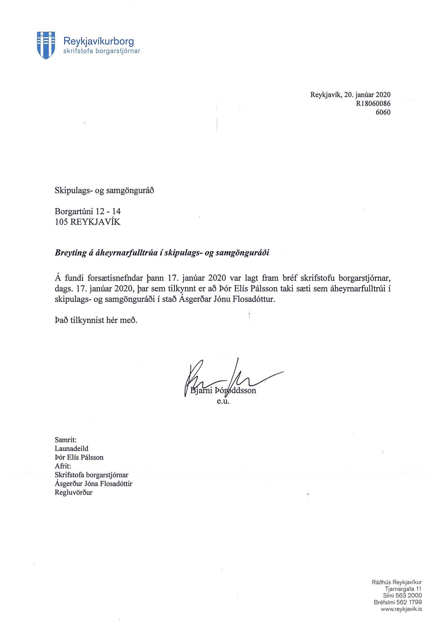 Lagt fram bréf skrifstofu borgarstjórnar dags. 20. janúar 2020 þar sem tilkynnt er að Þór Elís Pálsson tekur sæti sem fulltrúi í skipulags- og samgönguráði í stað Ásgerðar Jónu Flosadóttur.