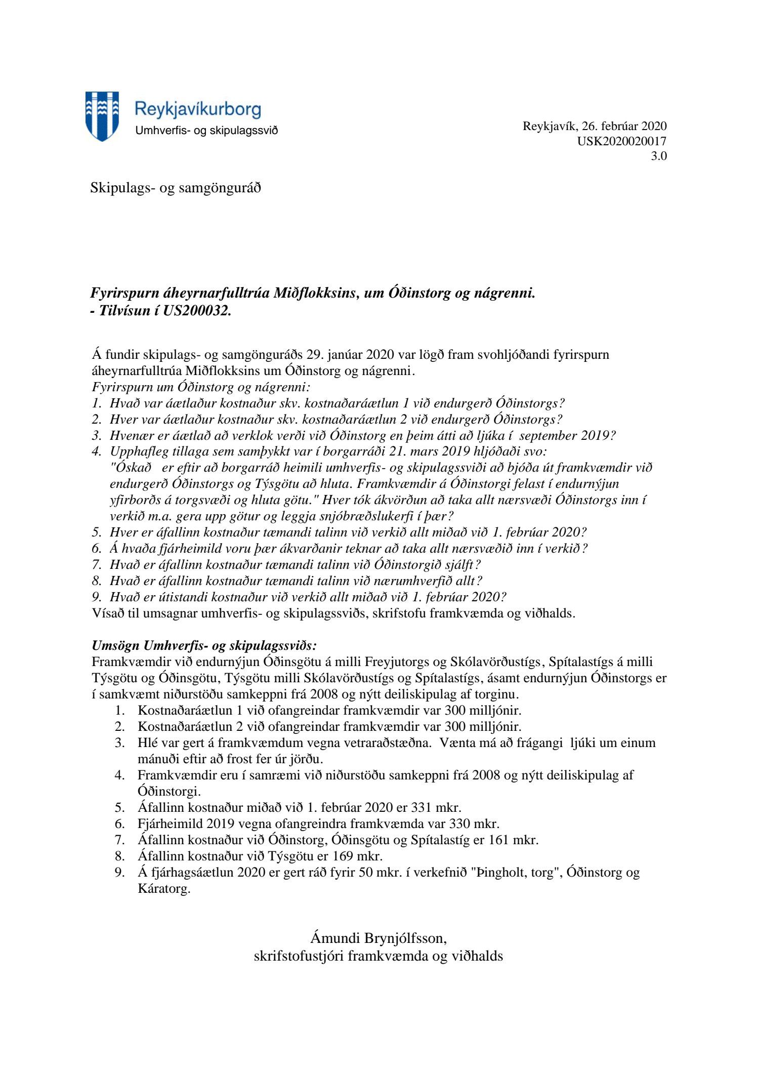 Ljóst er að framkvæmdir við Óðinstorg sem er við heimili borgarstjóra er komin fram úr áætlunum. Samkvæmt kosnaðaráætlunum átti framkvæmdin að kosta 300 milljónir. Viðurkennt er í svari þessu að verkið er komið langt fram úr áætlunum og endi samkvæmt fjárhagsáætlunum í 380 milljónum. Er það framúrkeyrsla upp á tæp 30%. Ekki er litið á þetta svar sem lokasvar því verkið hefur dregist úr hófi og fróðir menn sem skoðað hafa framkvæmdirnar segja að verkið hljóti að vera mun dýrara. Framkvæmdum átti að ljúka í lok september 2019 en ljóst er að þeim ljúki ekki fyrr en í byrjun sumars 2020. Borgarfulltrúi Miðflokksins fylgist áfram með kostnaðarauka sem kemur til með að falla á endurgerð Óðinstorgs.