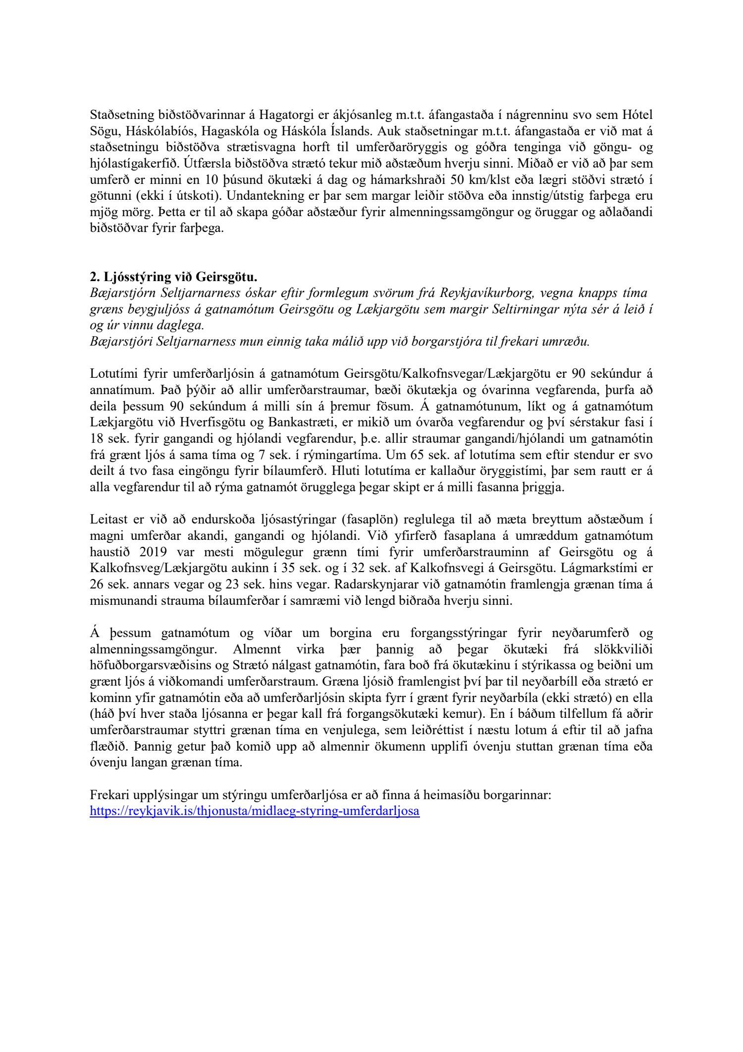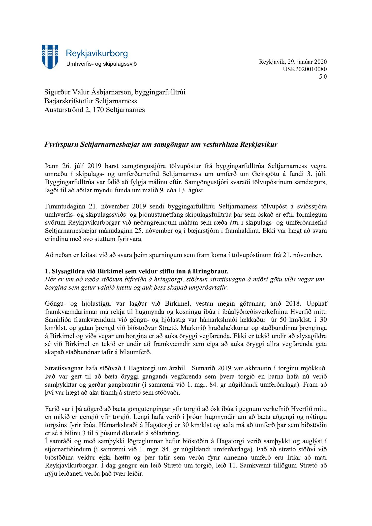 Lagt er fram bréf umhverfis- og skipulagssviðs Reykjavíkur, skrifstofu samgöngustjóra og borgarhönnunar dags. 29. janúar 2020 þar sem fyrirspurnum byggingarfulltrúa Seltjarnarness er svarað.