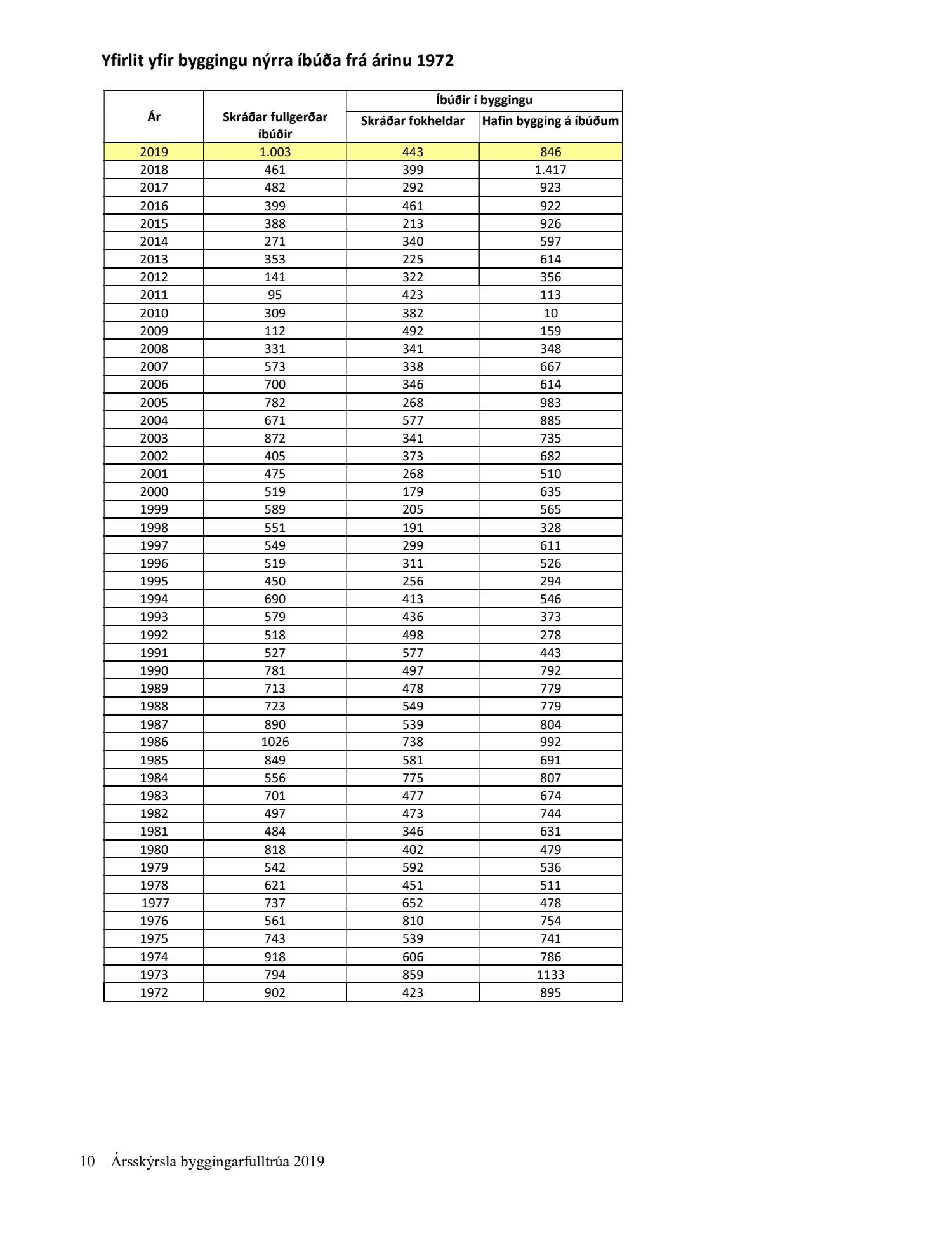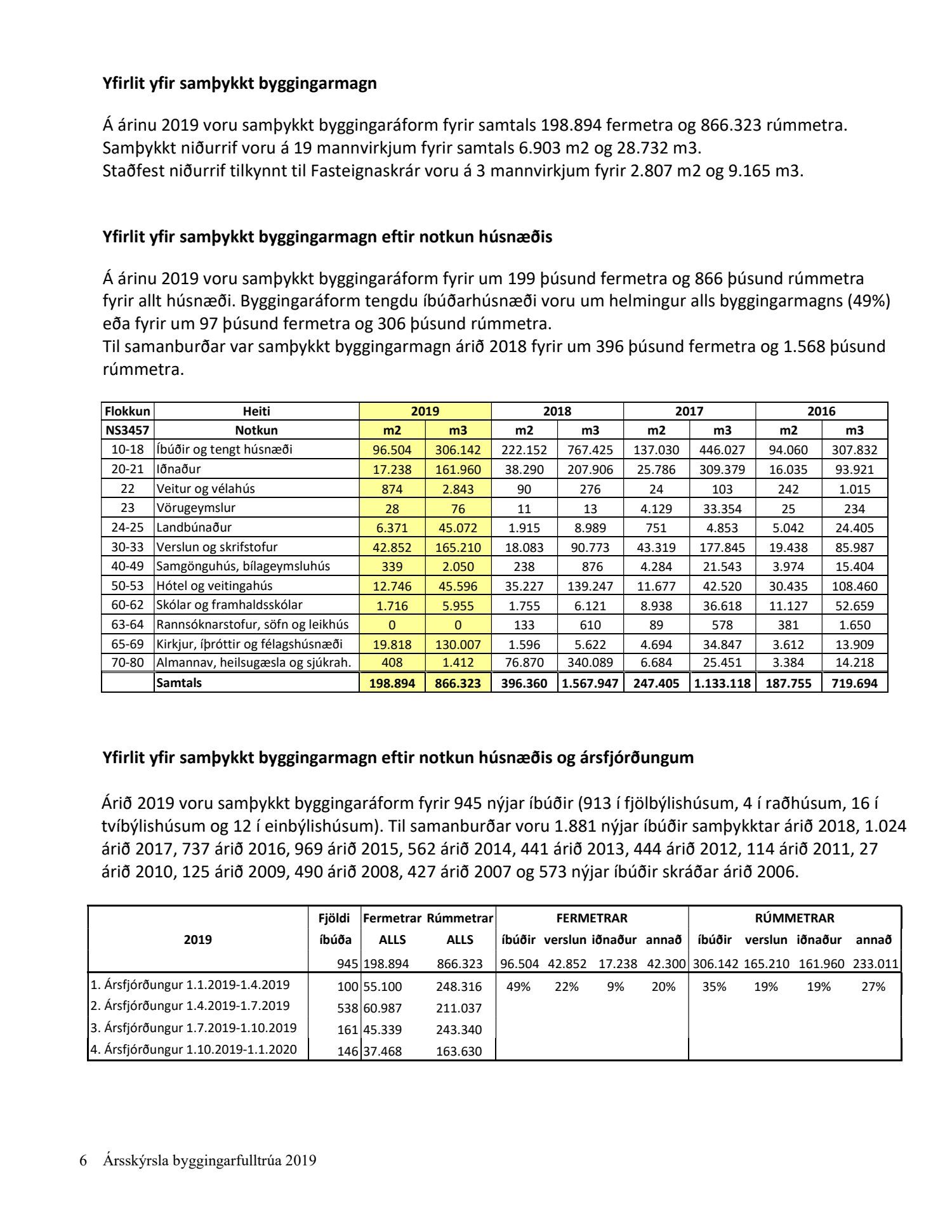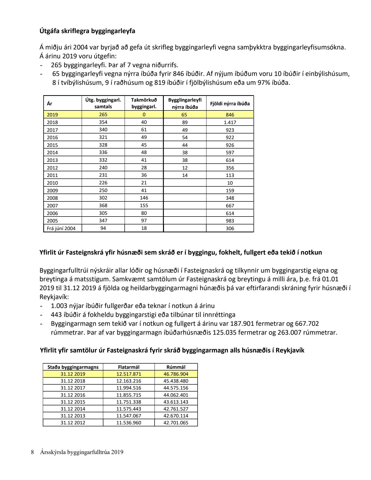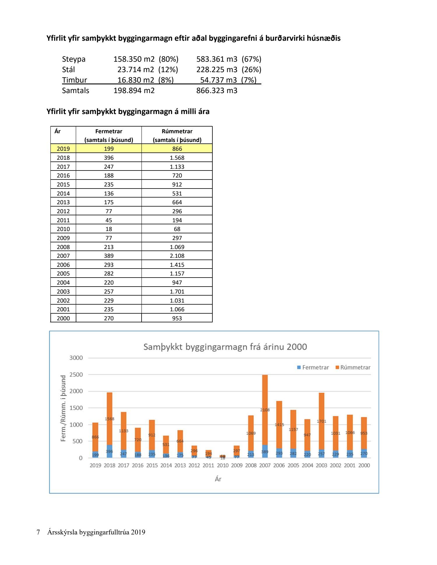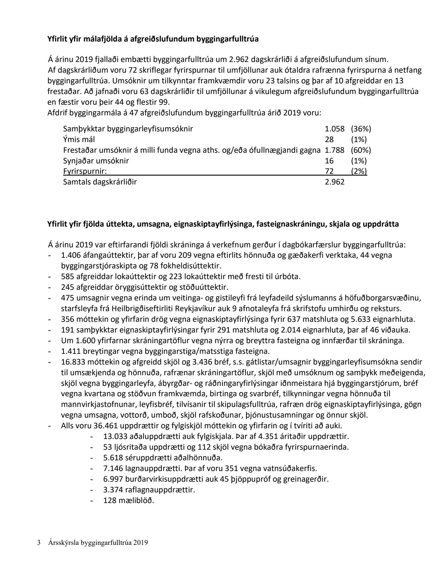 Lögð er fram ársskýrsla byggingarfulltrúa fyrir árið 2019 dags. í janúar 2010. Í skýrslunni kemur fram tölulegt yfirlit yfir byggingarleyfisumsóknir, byggingarmagn, byggingarleyfi, úttektir, fasteignaskráningu o.fl. samkvæmt skráningum í málaskrá yfir árið.