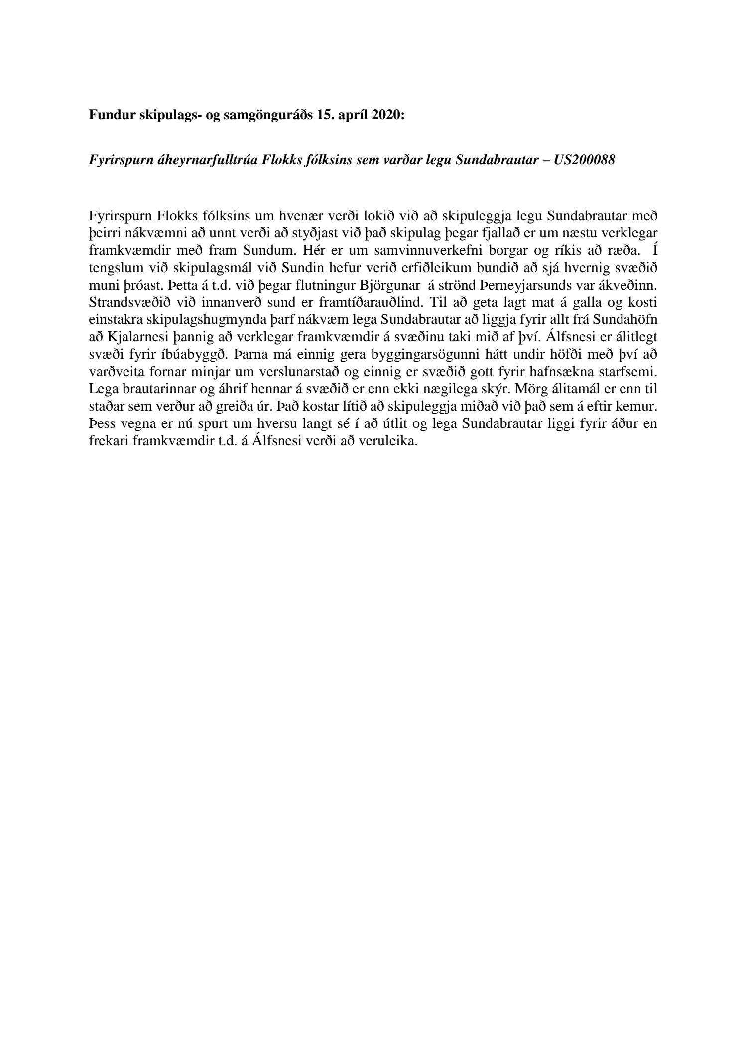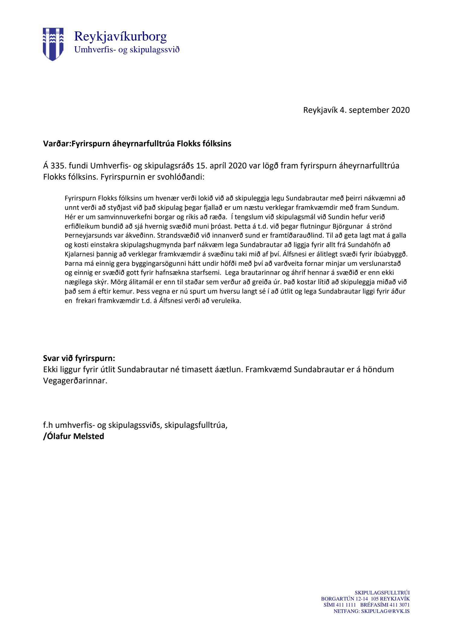 Fulltrúi Flokks fólksins var með fyrirspurnir sem varðar legu Sundabrautar og hvenær verði lokið við að skipuleggja legu hennar með þeirri nákvæmni að unnt verði að styðjast við það skipulag þegar fjallað er um næstu verklegar framkvæmdir með fram Sundum. Í svari segir að framkvæmd Sundabrautar sé í höndum Vegagerðarinnar. Svarið er hreinn útúrsnúningur. Spurt var um legu brautarinnar en ekki hver hefði umsjón með framkvæmdum eða framkvæmdarhraða. Hvar Sundabraut liggur er skipulagsmál og er því í höndum skipulagsyfirvalda borgarinnar en ekki Vegagerðarinnar. Það er því með ólíkindum hvernig umhverfis- og skipulagssvið getur svarað spurningu kjörins fulltrúa um skipulagsmál eins og um legu Sundabrautar með svari um hver ber ábyrgð á framkvæmd verksins? Óskað er eftir meiri nákvæmni í svörum við fyrirspurnum kjörinna fulltrúa. Hverju máli fylgir ákveðin vinna bæði fyrir kjörinn fulltrúa og starfsmenn og það er miður ef endurtaka þurfi fyrirspurnina einungis vegna þess að svar umhverfis- og skipulagssviðs er út í hött.