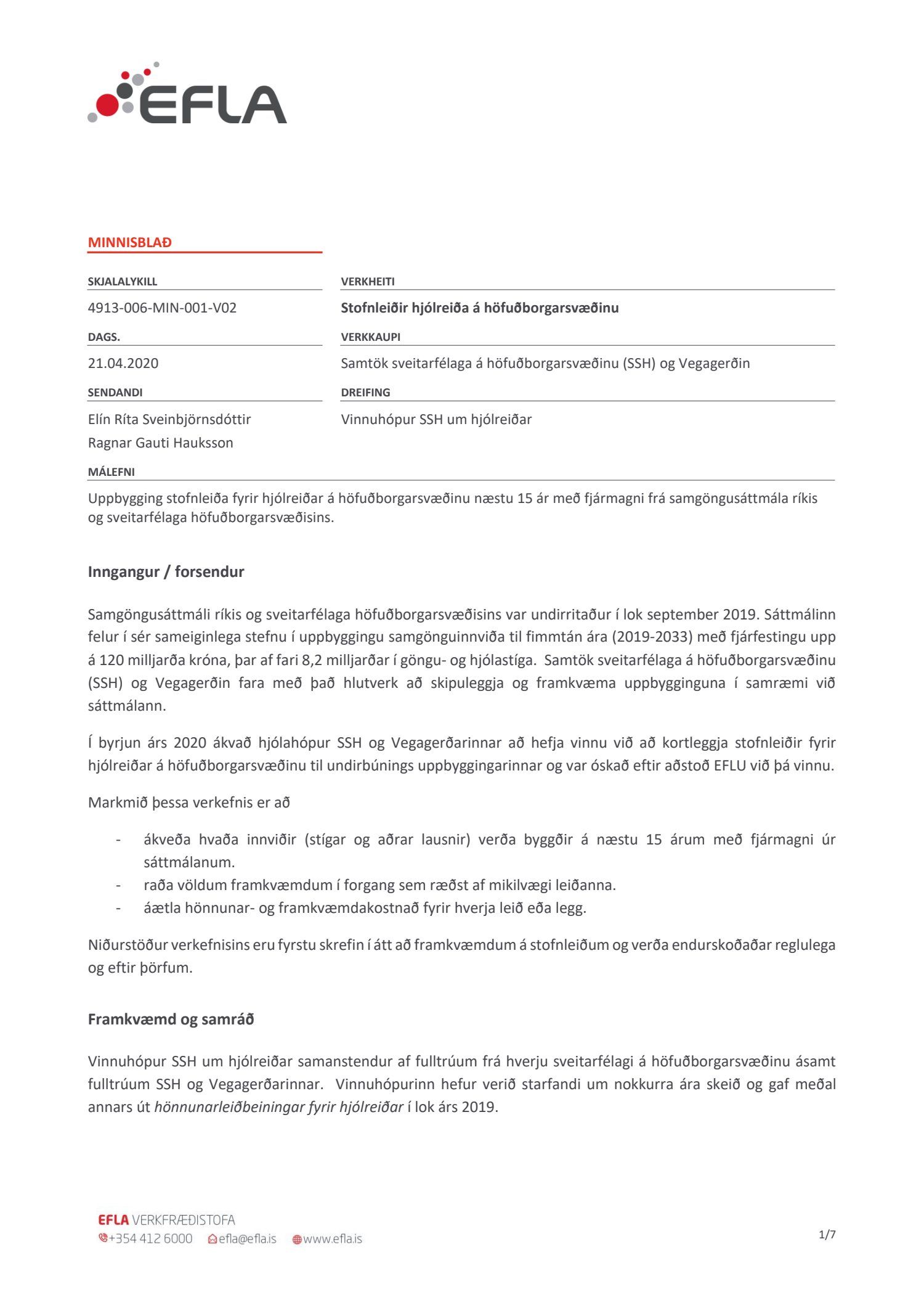 Bókun Flokks fólksins um minnisblað Eflu og yfirlitskort, dags. 21. apríl 2020, tillaga hjólahóps SSH og Vegagerðarinnar um uppbyggingu stofnleiða hjólreiða á höfuðborgarsvæðinu næstu 15 ár með fjármagni samgöngusáttmála. Fulltrúi Flokks fólksins vill benda á að gott er að stefna að því að hjólastígar séu og verði hugsaðir sem samgönguæð.