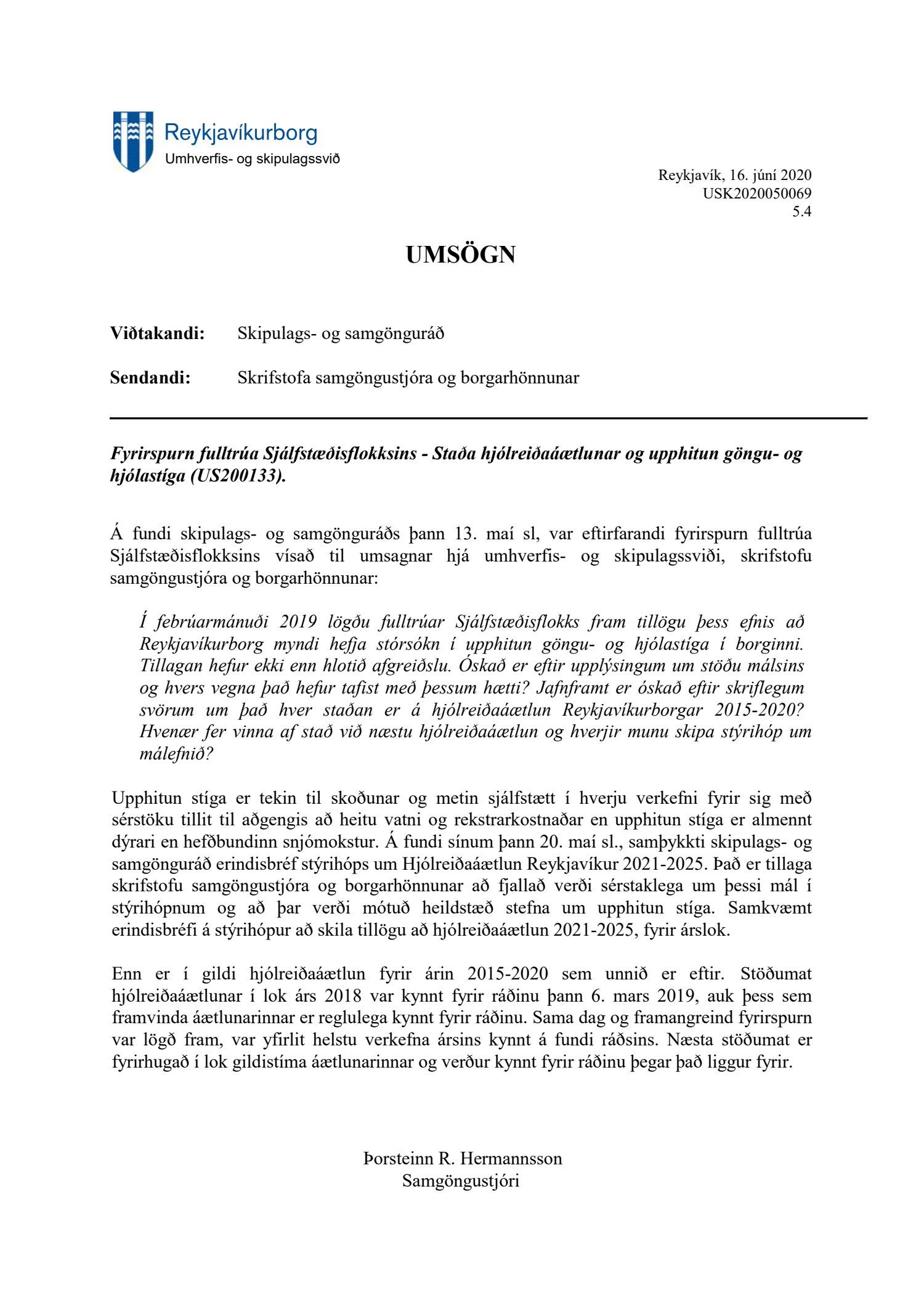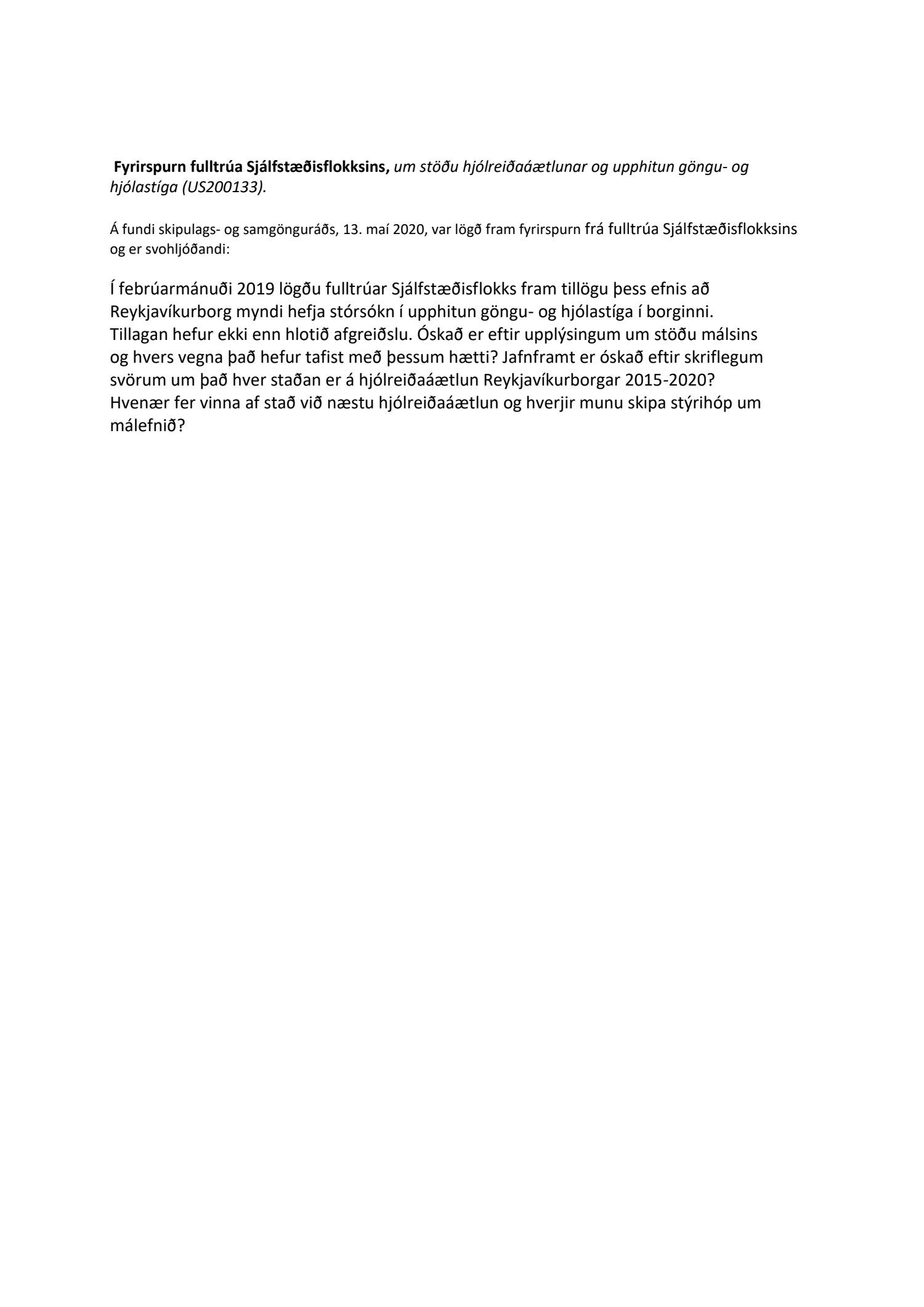 Lögð er fram fyrirspurn fulltrúa Sjálfstæðisflokksins ásamt umsögn samgöngustjóra, dags. 16. júní 2020, vegna tillögu um upphitun göngu- og hjólastíga í borginni og barst skipulags- og samgönguráði 13. maí 2020.