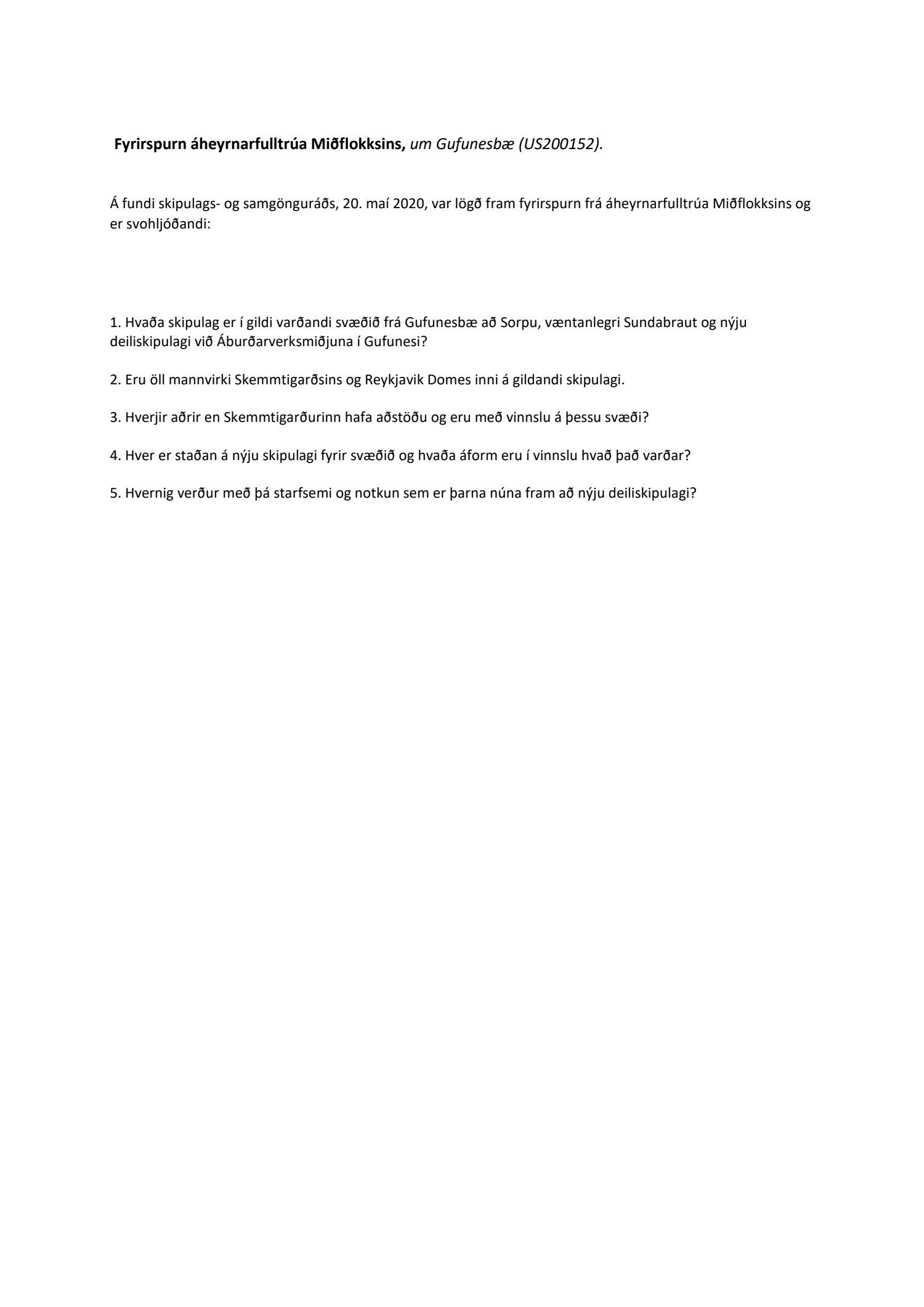 Lögð er fram fyrirspurn áheyrnarfulltrúa Miðflokksins ásamt umsögn skipulagsfulltrúa, dags. 29. maí 2020, varðandi svæðið frá Gufunesbæ að Sorpu og barst skipulags- og samgönguráði 20. maí 2020.