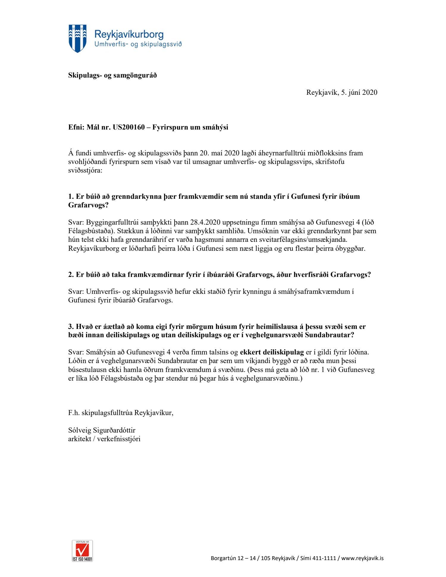 Viðurkennt er að ekkert deiliskipulag er í gildi þar sem verið er að koma fyrir fimm smáhýsum á Gufunesvegi 4, enda koma þau til með að standa á veghelgunarsvæði Sundabrautar sem er jafnframt viðukennt í þessu. Því hefur sífellt verið neitað af kjörnum fulltrúum í meirihlutanum. Talað er um að byggðin sé til bráðabirgða en það er ekki rétt því steyptur grunnur er undir hverju húsi. Í 2. gr. laga nr. 40/2002 um fasteignakaup segir um hugtakið fasteign: „Fasteign samkvæmt lögum þessum telst vera afmarkaður hluti lands, ásamt eðlilegum hlutum þess, lífrænum og ólífrænum, og mannvirki sem varanlega eru við landið skeytt.“ Reykjavíkurborg er því að byggja varanlegt húsnæði í trússi við lög og viðurkennir að byggðin rýs þar sem planað er að Sundabraut eigi að liggja. Hvað er hægt að segja þegar skemmdarverkin í samgöngum á landsvísu eru svona augljós. Einnig er það ekki í anda góðrar stjórnsýslu að grenndarkynna ekki fyrirhugaða uppbyggingu eins og t.d. fyrir íbúaráði Grafarvogs.
