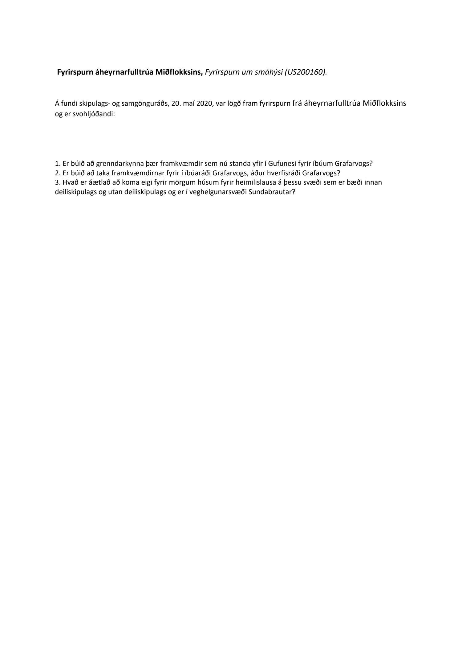 Lögð er fram fyrirspurn áheyrnarfulltrúa Miðflokksins ásamt umsögn skipulagsfulltrúa, dags. 5. júní 2020, vegna uppsetningar, kynningar og skipulagningar smáhýsa og barst skipulags- og samgönguráði 20. maí 2020.