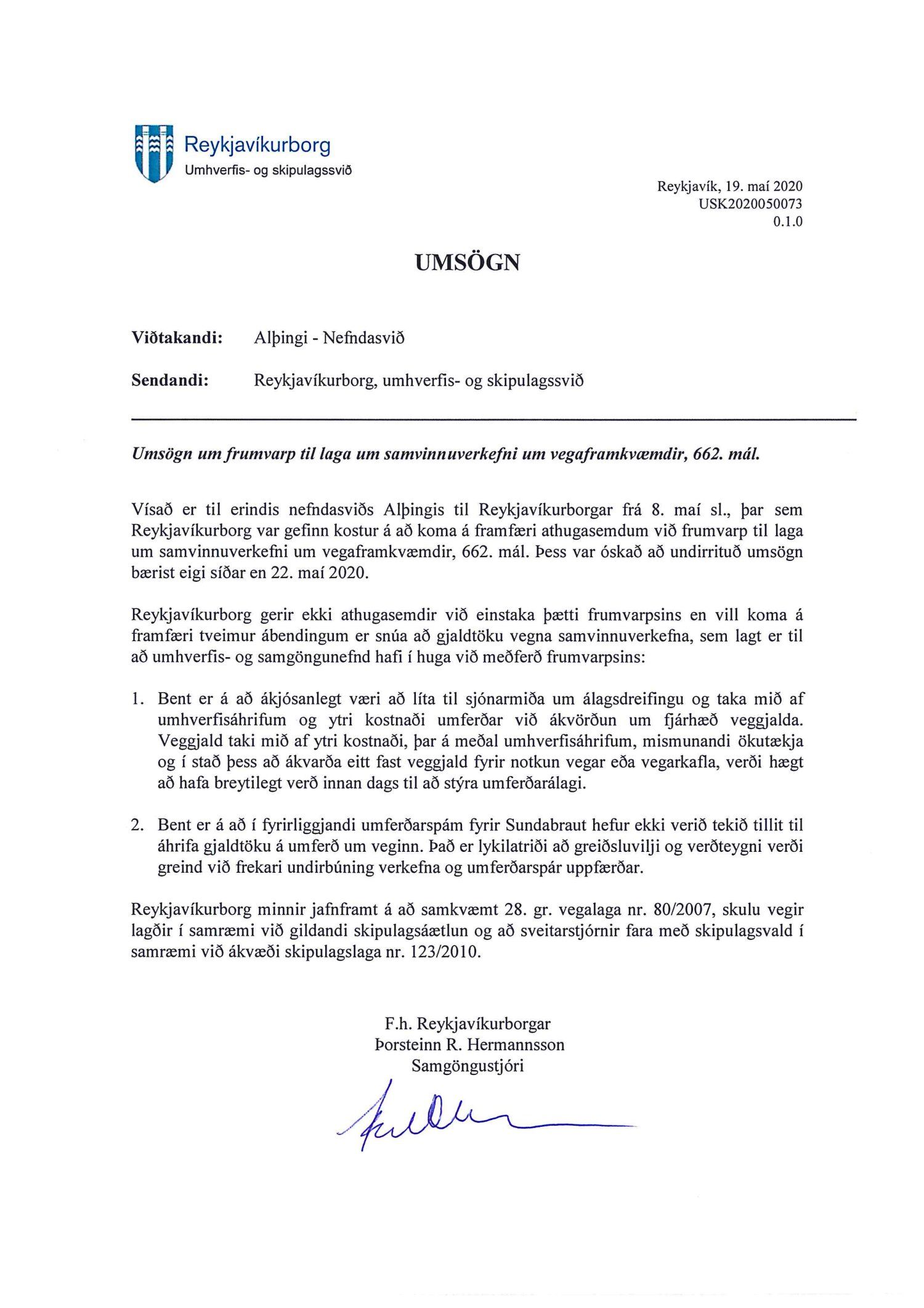 Lögð fram umsögn umhverfis- og skipulagssviðs, Skrifstofu samgöngustjóra og borgarhönnunar, dags. 19. maí 2020, um frumvarp til laga um samvinnuverkefni um vegaframkvæmdir, 662. mál, þingskjal 1122 sem lagt var fram á 150. löggjafarþingi 2019–2020.