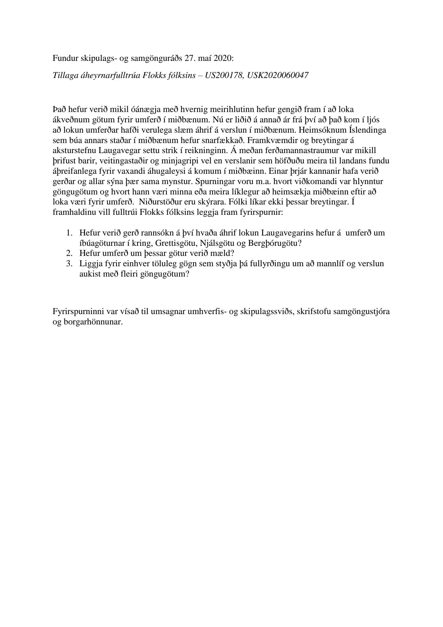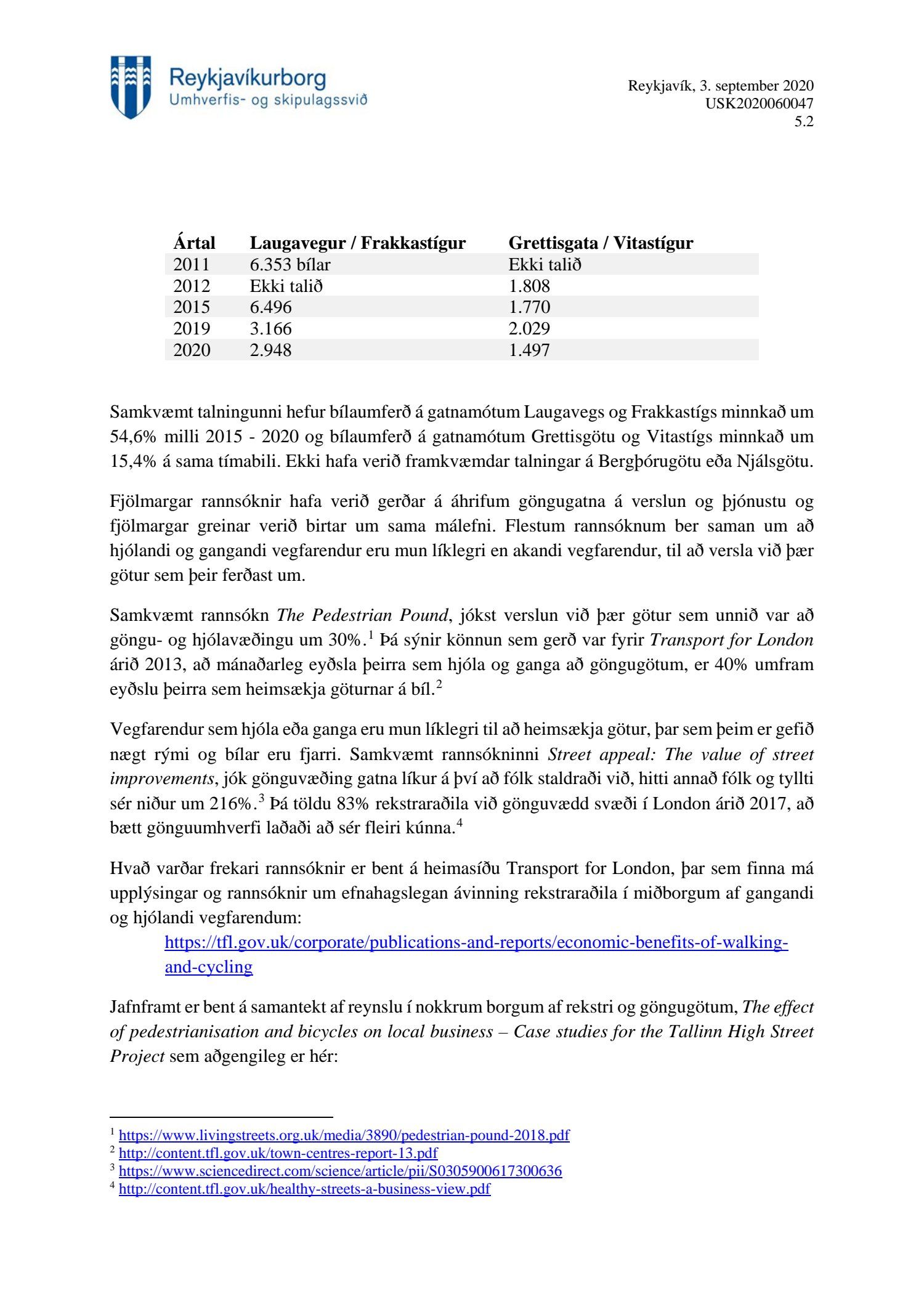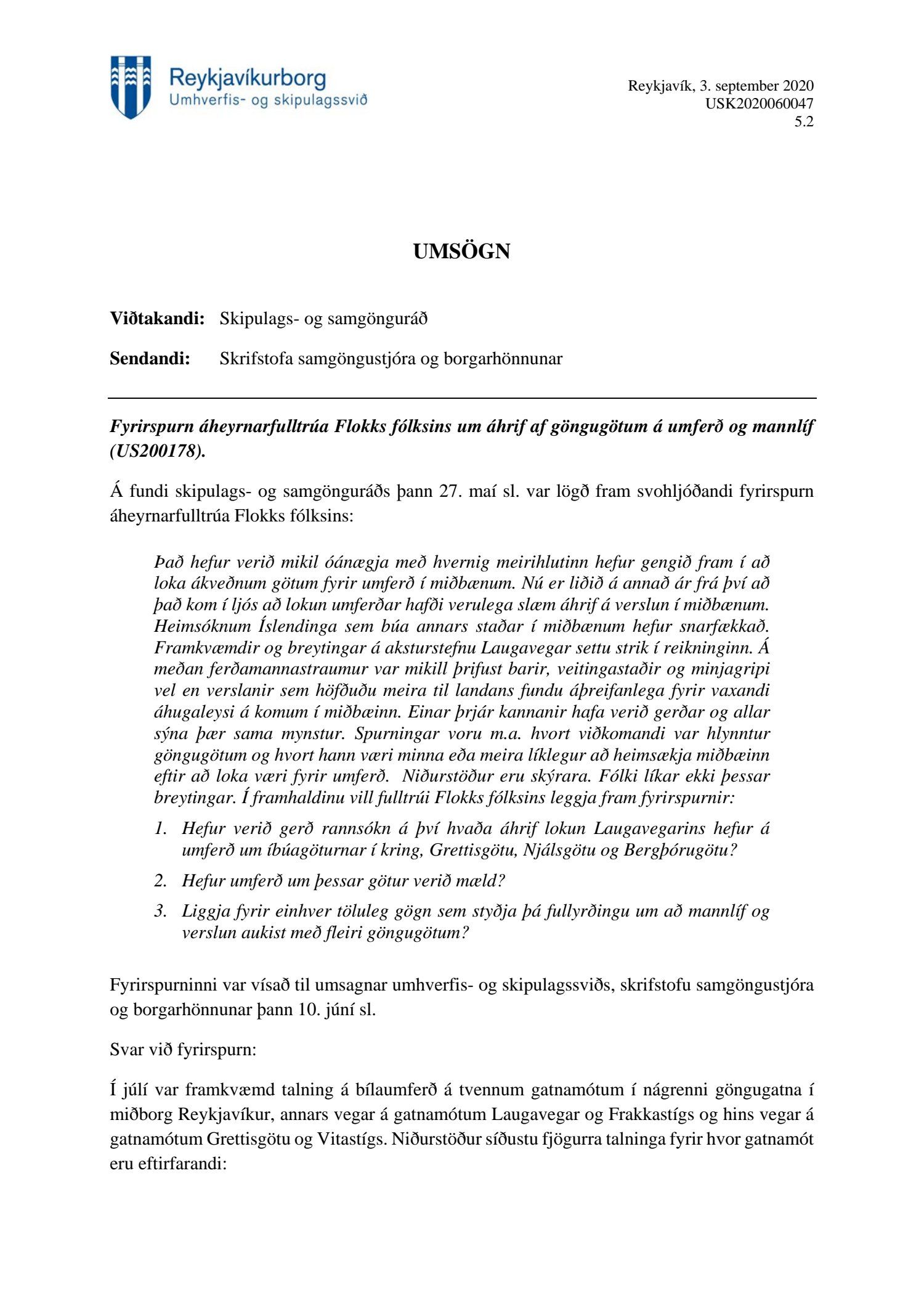Lögð er fram að nýju fyrirspurn áheyrnarfulltrúa Flokks fólksins um áhrif göngugatna á umferð og mannlíf, sbr. 5. lið fundargerðar skipulags- og samgönguráðs 27. maí 2020. Einnig lögð fram umsögn umhverfis- og skipulagssviðs, Skrifstofu samgöngustjóra og borgarhönnunar, dags. 3. september 2020.