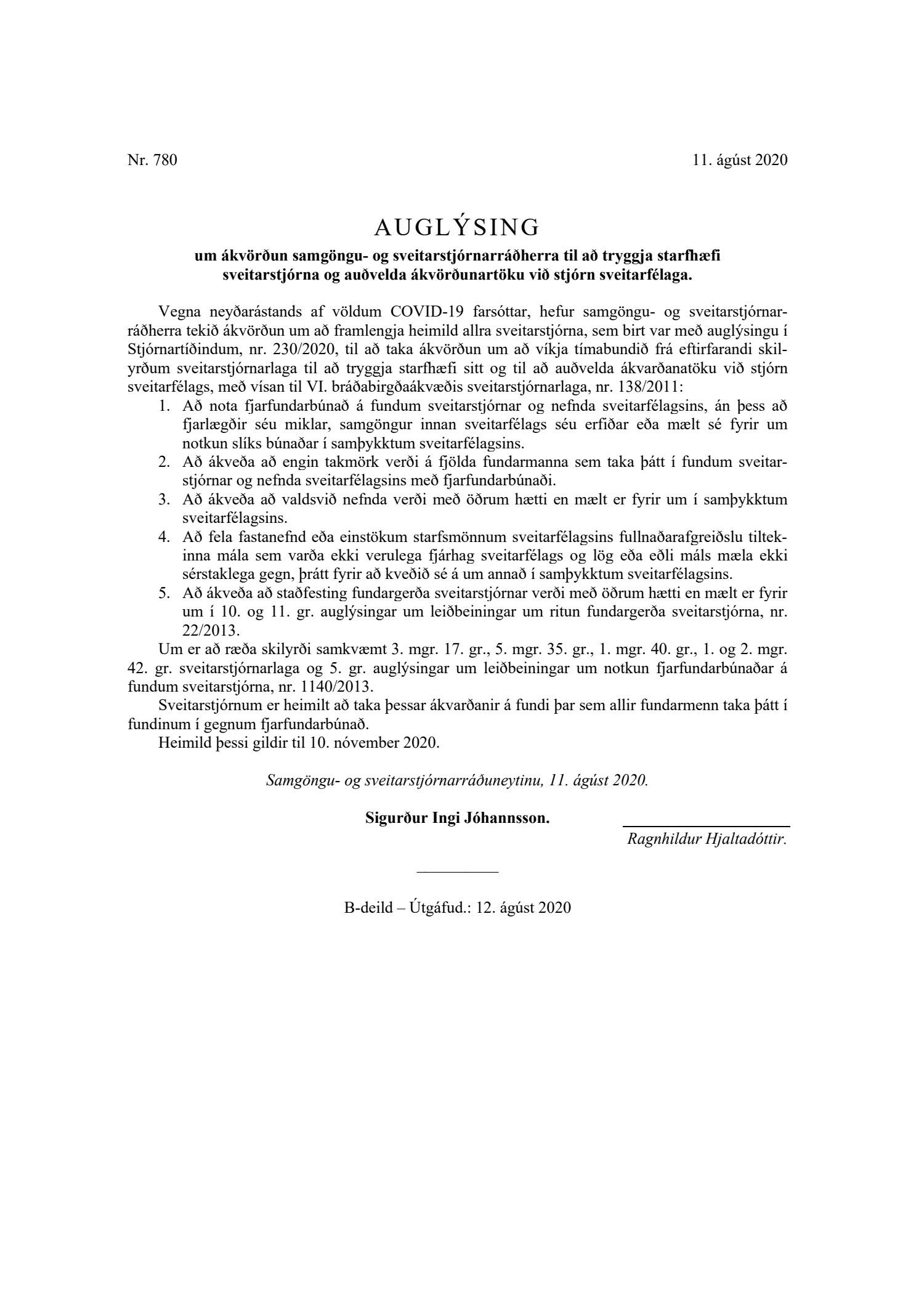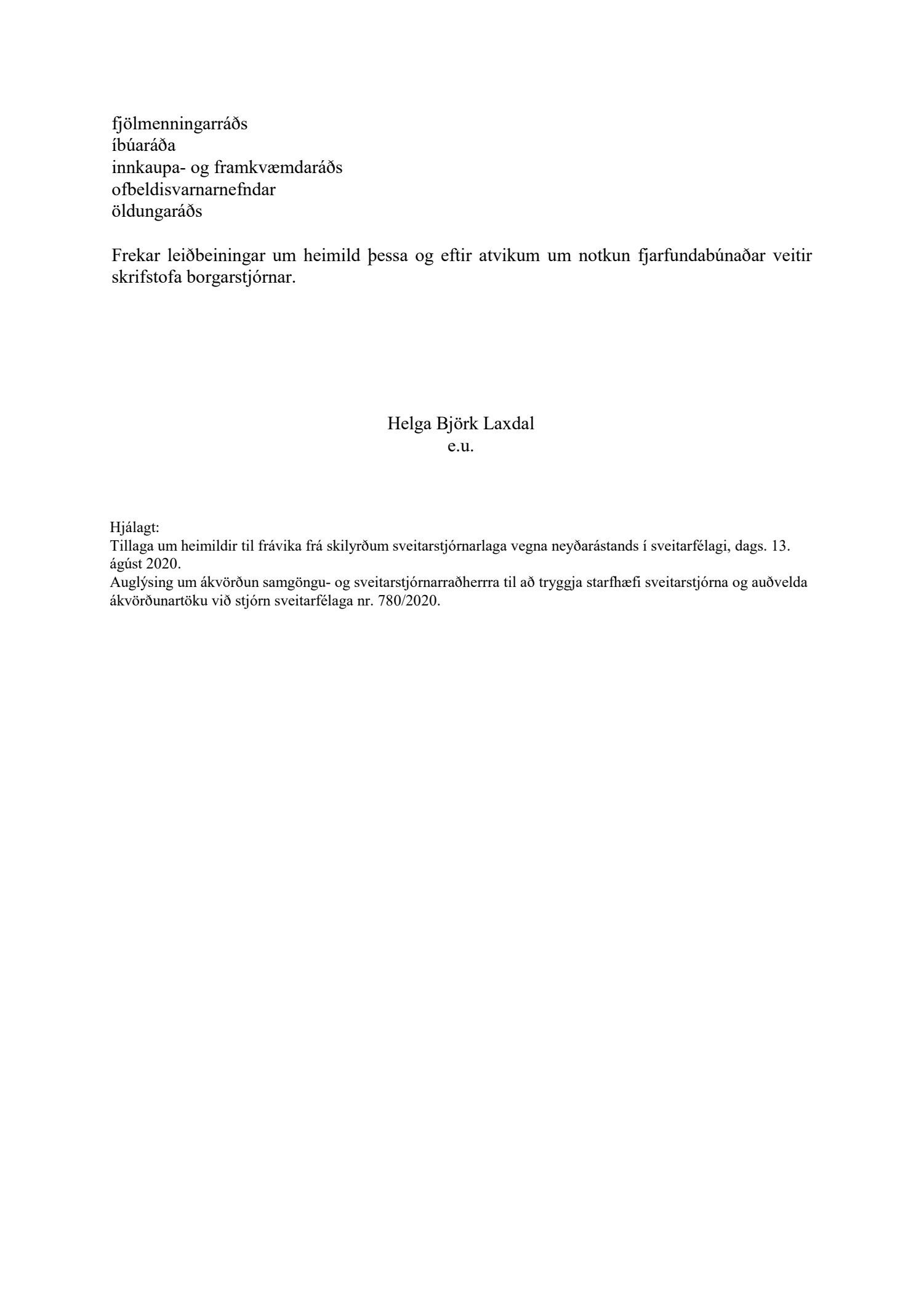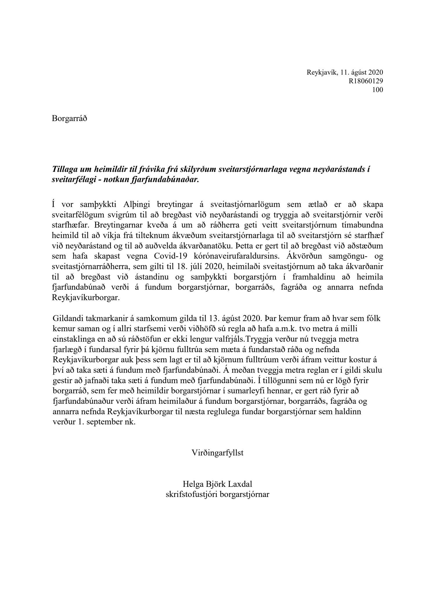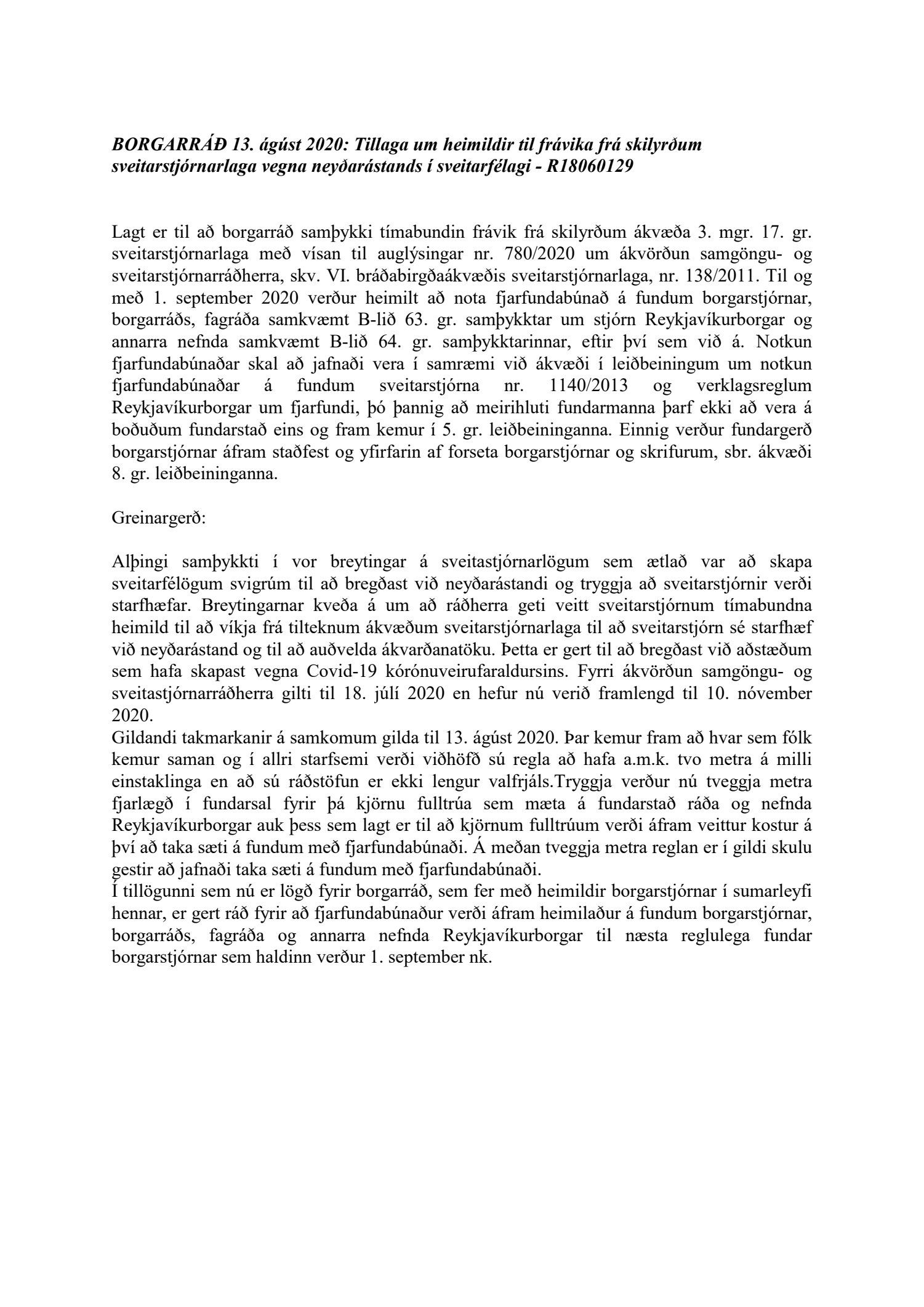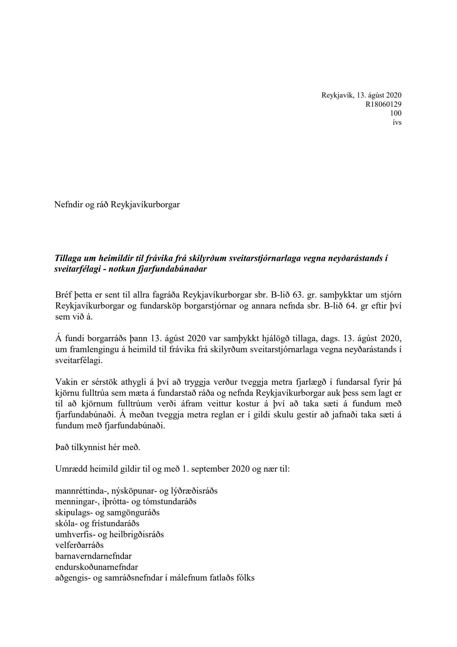 Lagt fram bréf borgarstjórnar Reykjavíkur til nefnda og ráða Reykjavíkurborgar þar sem fram kemur að borgarstjórn samþykkti þann 13. ágúst sl. tillögu um framlengingu á heimild til frávika frá skilyrðum sveitarstjórnarlaga vegna neyðarástands í sveitarfélagi. Einnig er lögð fram auglýsing, dags. 11. ágúst 2020, um ákvörðun samgöngu- og sveitarstjórnarráðherra til að tryggja starfhæfi sveitarstjórna og auðvelda ákvörðunartöku við stjórn sveitarfélaga nr. 780/2020 og auglýsing um leiðbeiningar um notkun fjarfundabúnaðar á fundum sveitarstjórna nr. 1140/2013.