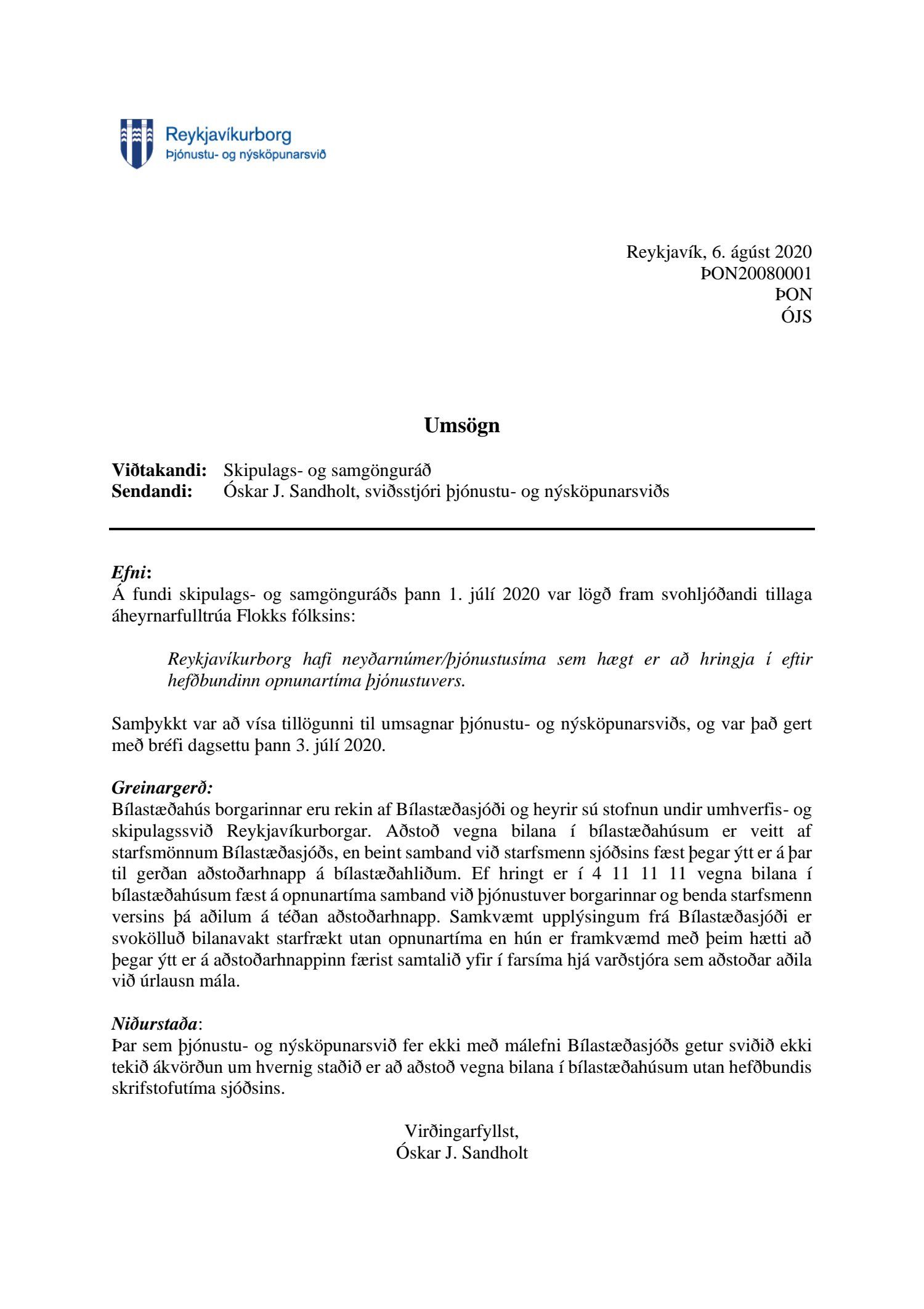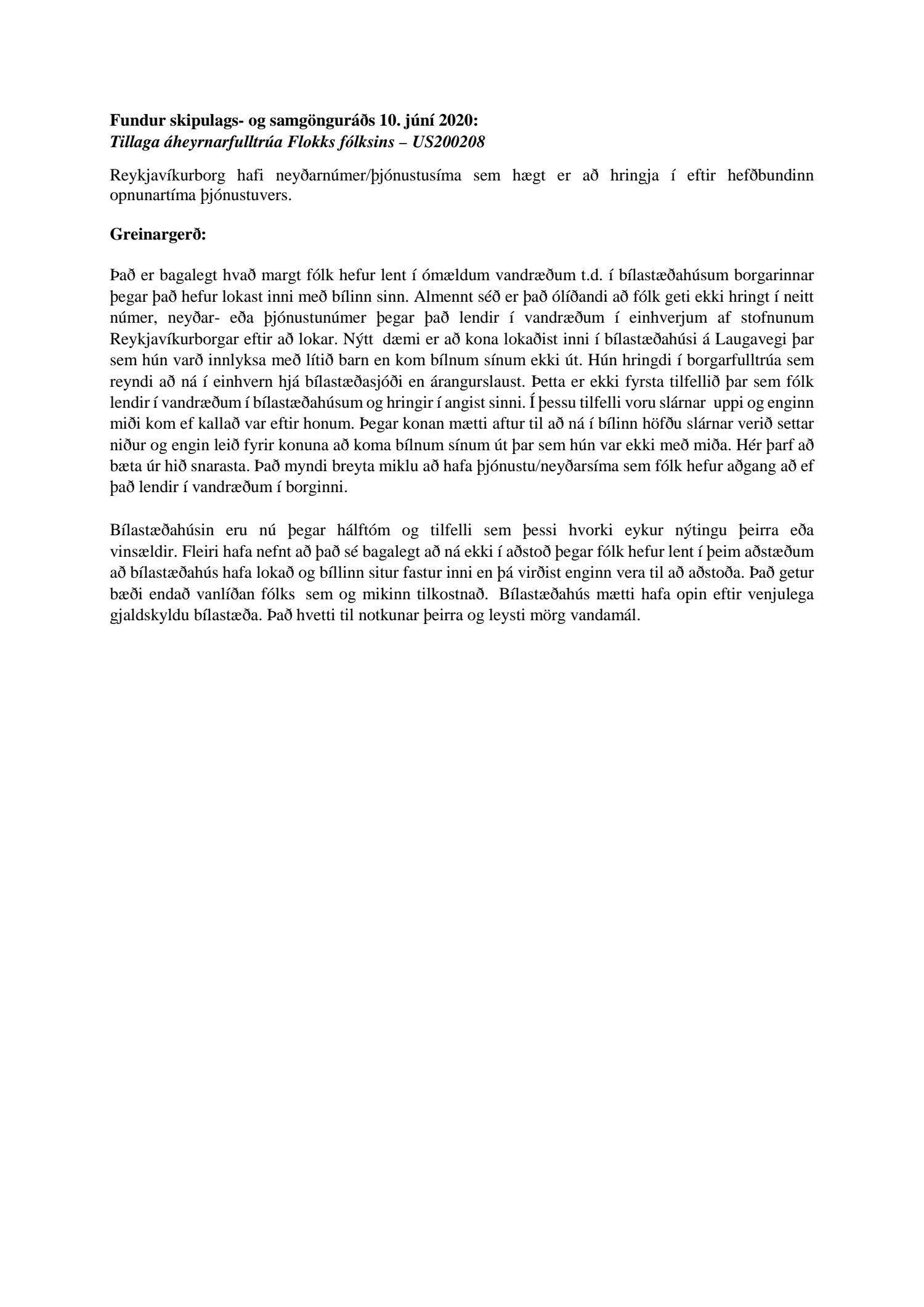 Tillaga áheyrnarfulltrúa Flokks fólksins um að Reykjavíkurborg hafi neyðarnúmer/þjónustusíma sem hægt er að hringja í eftir hefðbundinn opnunartíma þjónustuvers hefur verið felld. Tillagan var send til umsagnar þjónustu- og nýsköpunarsviðs sem hefur ekkert að gera með þessa tillögu. Rökin fyrir að fella tillöguna er því ekki byggð á umsögn þeirra sem hafa með þessi mál að gera. Þessi þjónusta sem Flokkur fólksins er að reyna að fá bætta er ekki í góðu lagi. Fólk hefur lent í miklum vandræðum í bílastæðahúsum. Af afgreiðslunni að dæma lítur ekki út fyrir að laga eigi þessa hluti. Fulltrúi Flokks fólksins hefur fengið ábendingar frá þeim sem lokast hafa inni í bílastæðahúsum og ekki fundið leiðir til að kalla eftir hjálp. Almennt séð er það ólíðandi að fólk geti ekki hringt í neitt númer, neyðar- eða þjónustunúmer þegar það lendir í vandræðum í einhverjum af stofnunum Reykjavíkurborgar eftir að lokun. Hér þarf að bæta úr hið snarasta. Það myndi breyta miklu að hafa þjónustu/neyðarsíma sem fólk hefur aðgang að ef það lendir í vandræðum í borginni. Þótt tillagan hafi verið felld er það enn von fulltrúa Flokks fólksins að bílastæðasjóður taki til greinar þessar ábendingar, í það minnsta merki betur hvað fólks skuli gera lendi það í vandræðum.