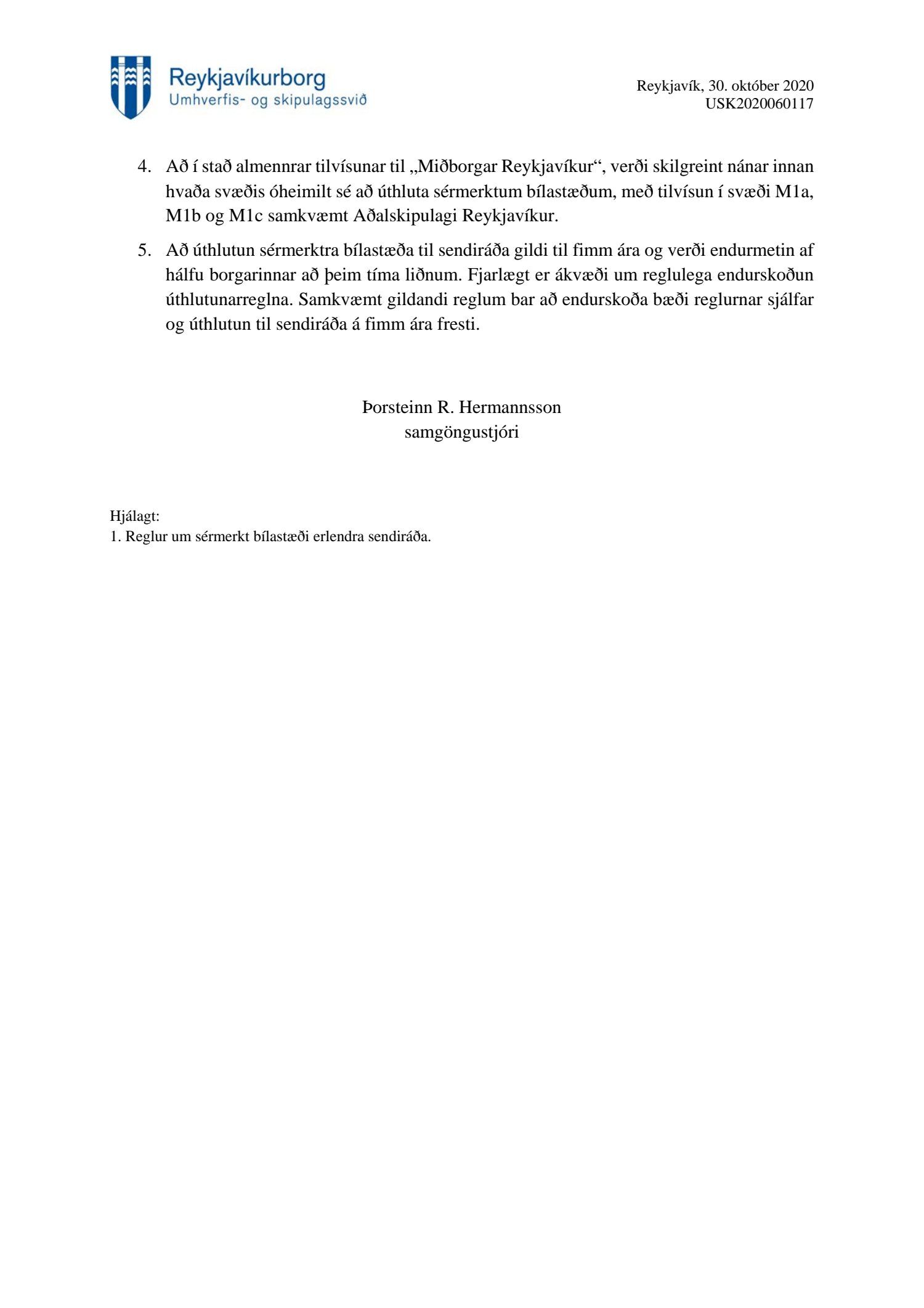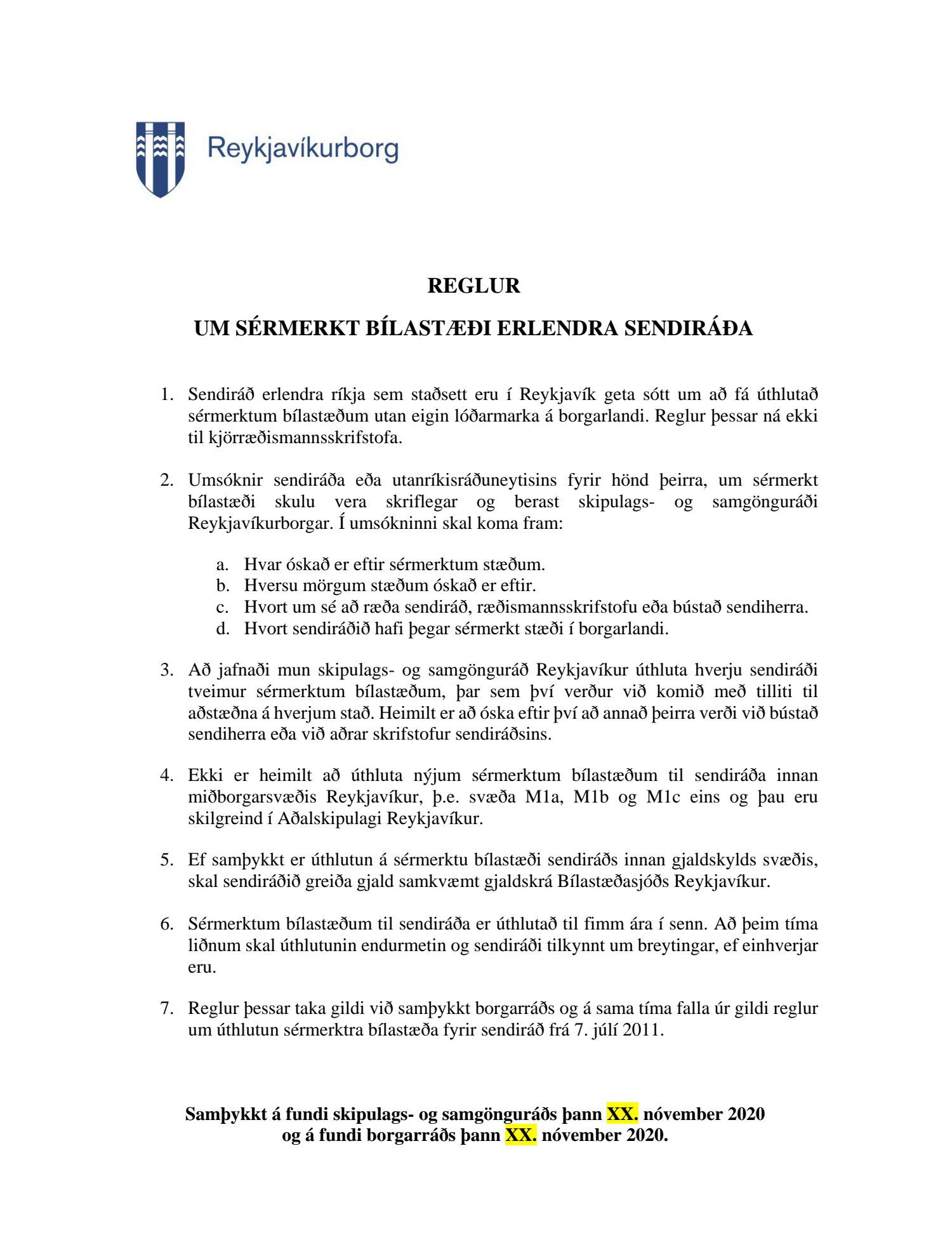 Reglur um sérmerkt bílastæði erlendra sendiráða, tillaga
