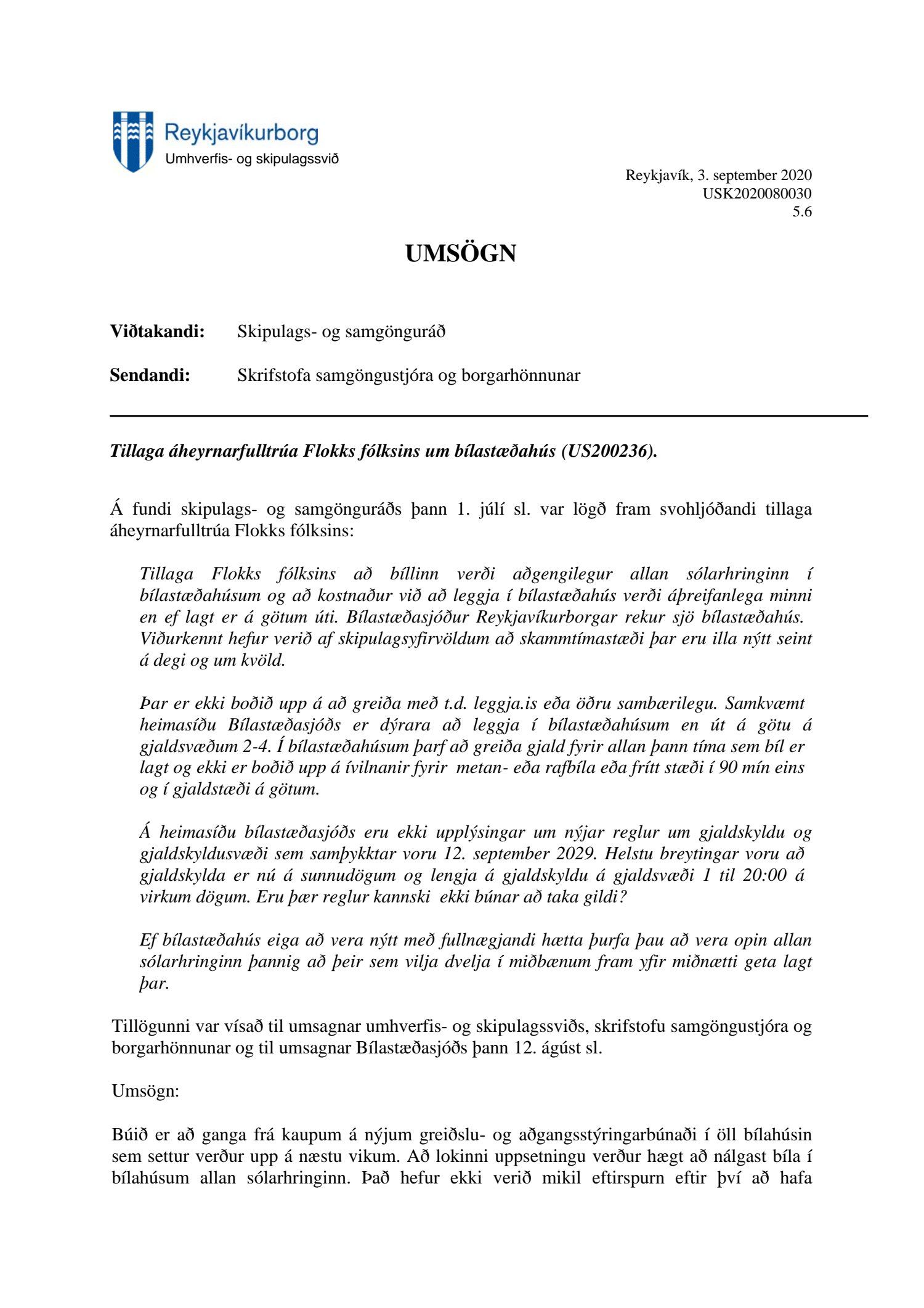 Lögð er fram að nýju tillaga áheyrnarfulltrúa Flokks fólksins sem varðar bílastæðahús, sbr. 81. lið fundargerðar skipulags- og samgönguráðs 1. júlí 2020. Einnig lögð fram umsögn umhverfis- og skipulagssviðs, Skrifstofu samgöngustjóra og borgarhönnunar og bílastæðasjóðs dags. 3. september 2020.