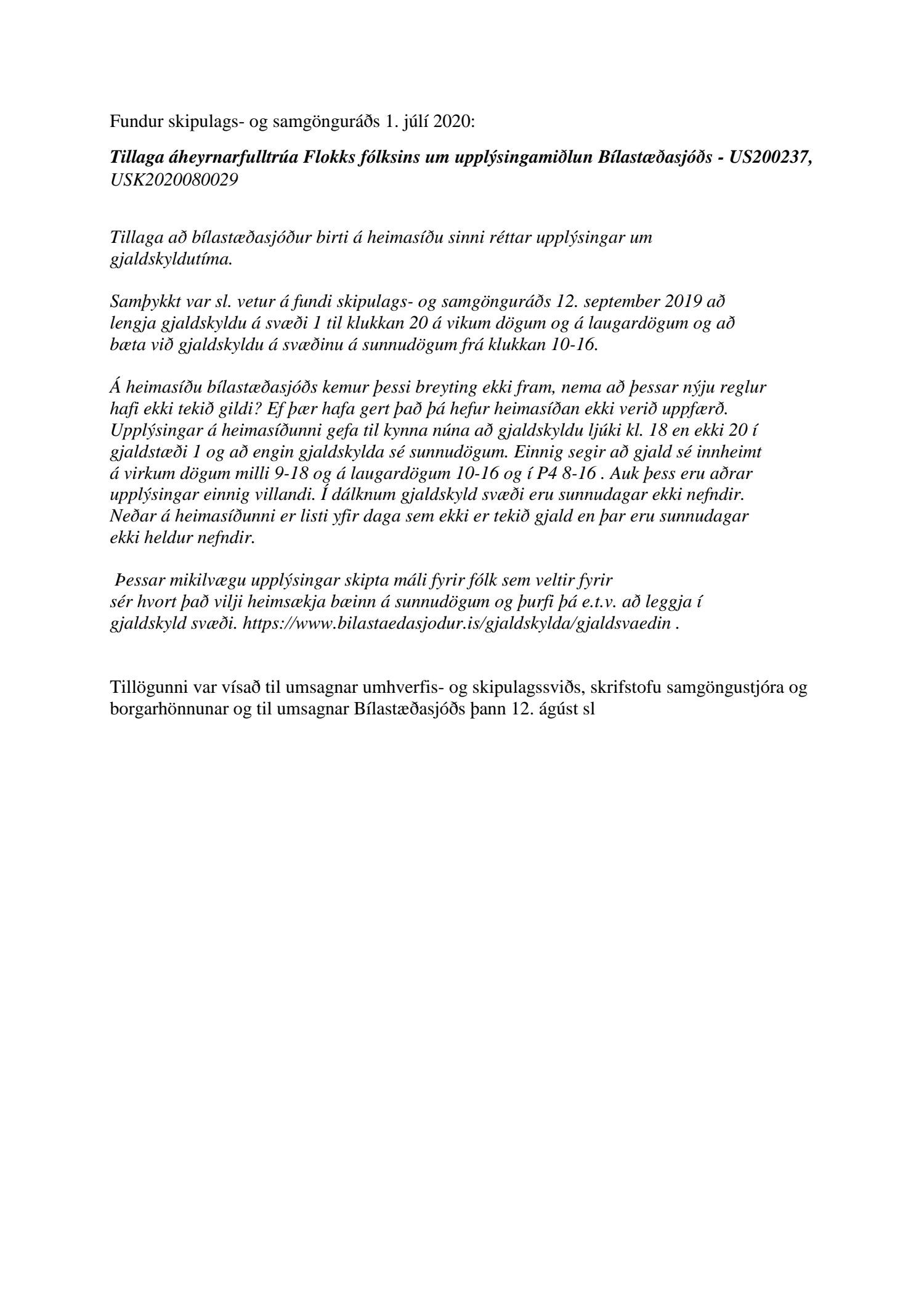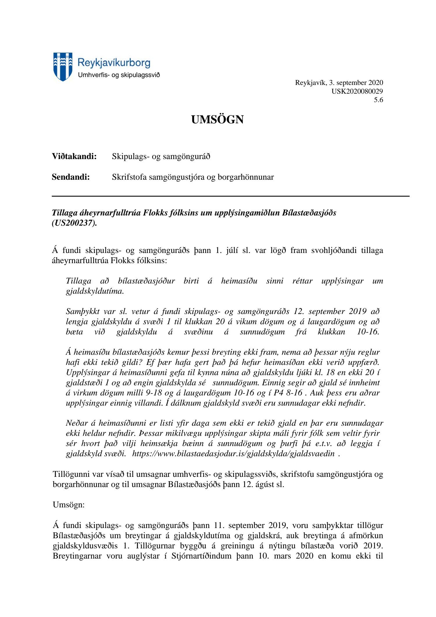 Lögð er fram að nýju tillaga áheyrnarfulltrúa Flokks fólksins vegna upplýsingamiðlunar bílastæðasjóðs, sbr. 82 lið fundargerðar skipulags- og samgönguráðs frá 1. júlí 2020. Einnig lögð fram umsögn umhverfis- og skipulagssviðs, Skrifstofu samgöngustjóra og borgarhönnunar.