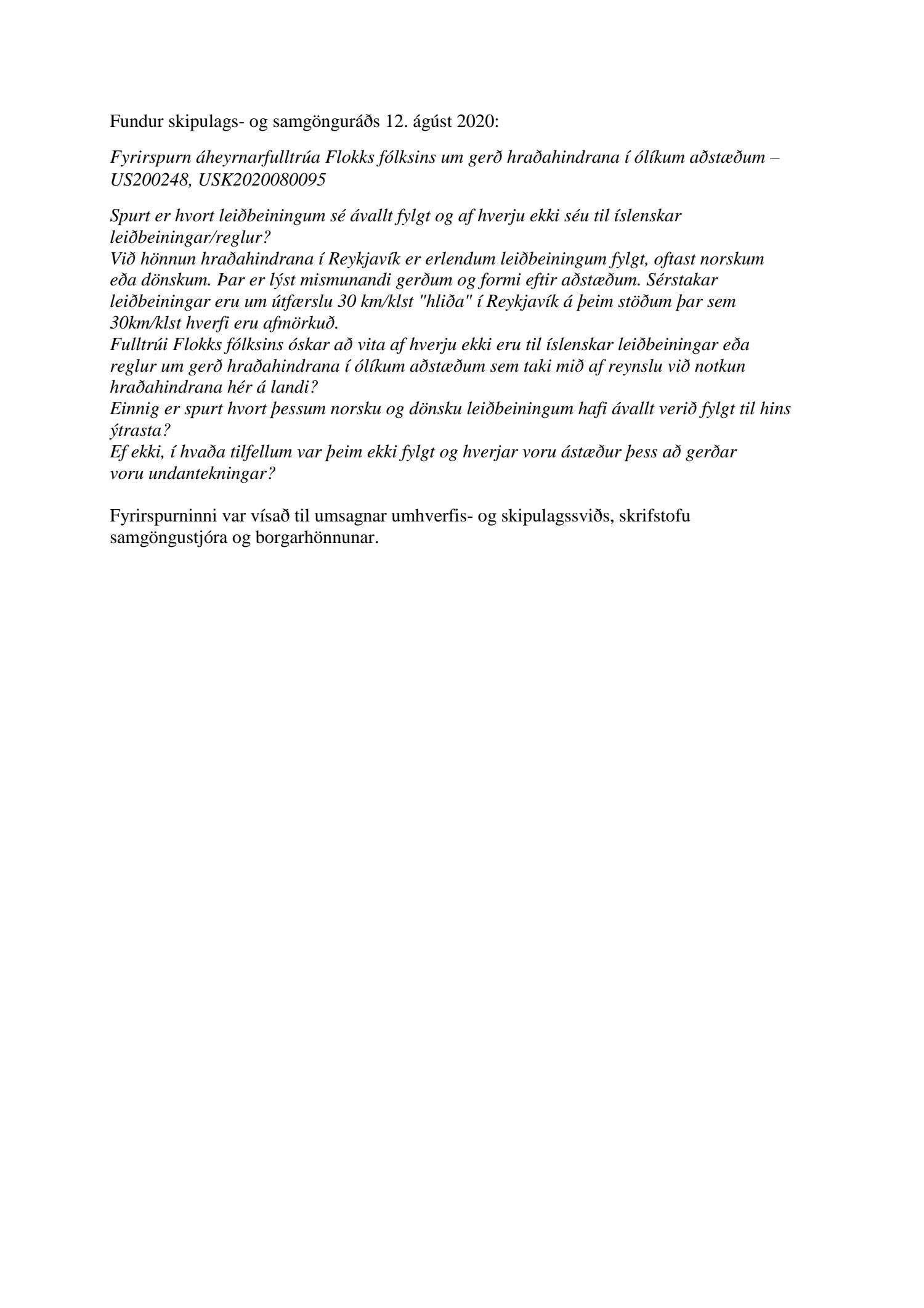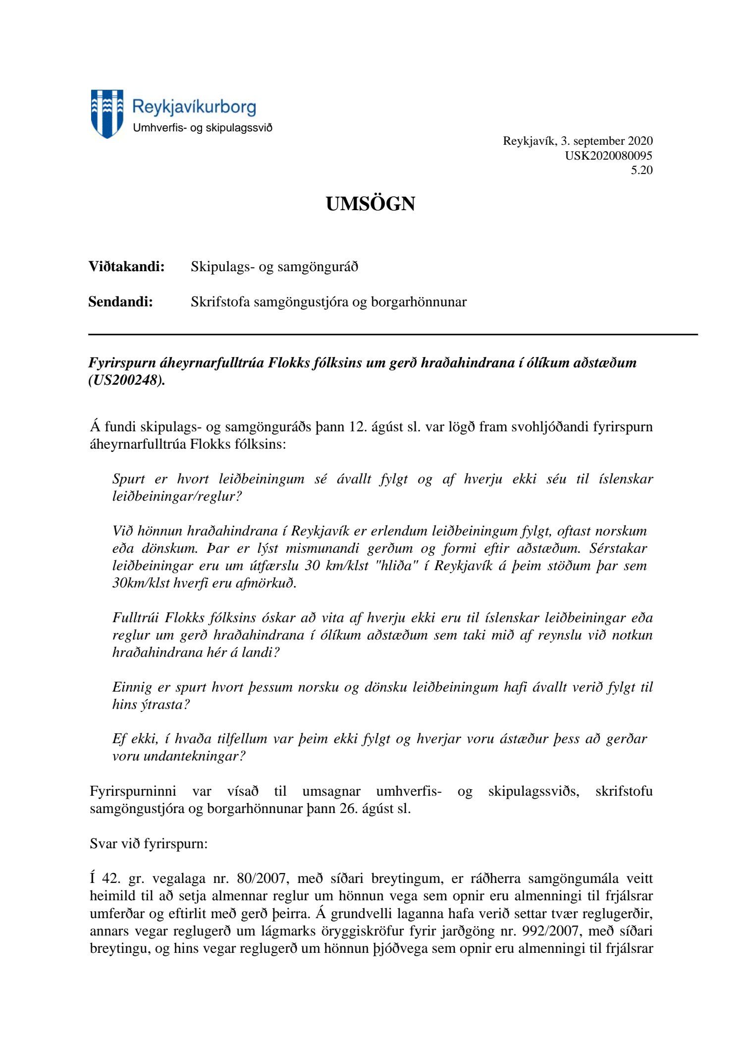 Lögð er fram að nýju fyrirspurn áheyrnarfulltrúa Flokks fólksins um gerð hraðahindrana í ólíkum aðstæðum, sbr. 48. lið fundargerðar skipulags- og samgönguráðs 12. ágúst. Einnig lögð fram umsögn umhverfis- og skipulagssviðs, Skrifstofu samgöngustjóra og borgarhönnunar dags. 3. september 2020.