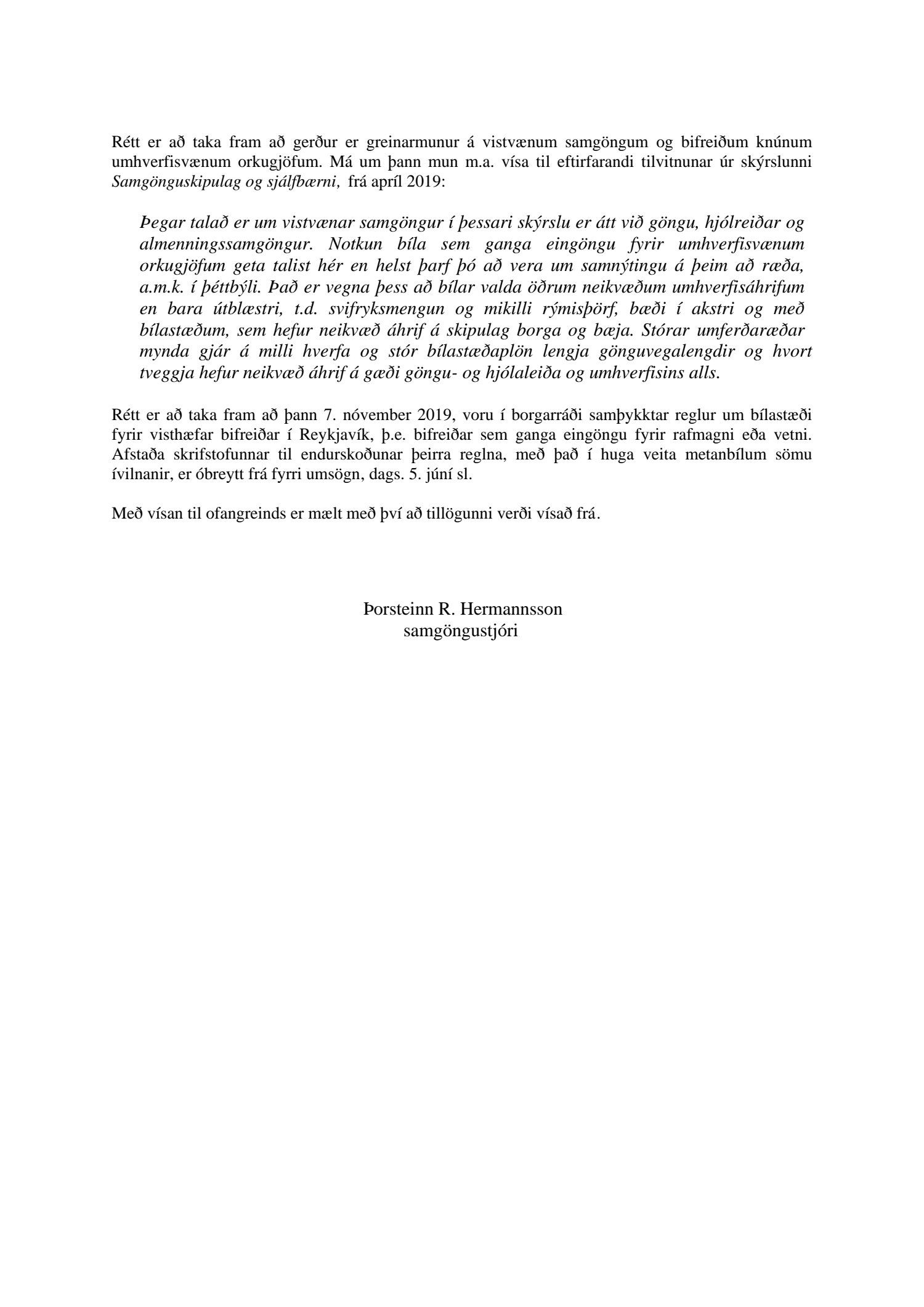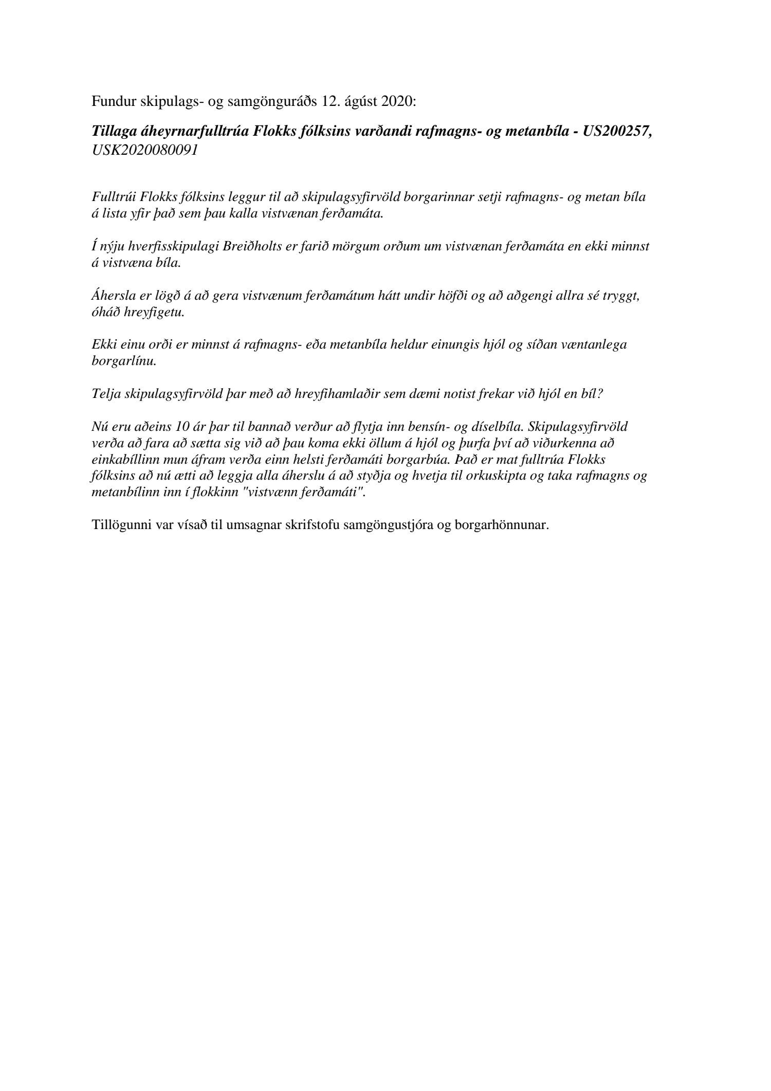 Lögð er fram að nýju tillaga áheyrnarfulltrúa Flokks fólksins sem varðar rafmagns- og metan bíla, sbr. 56. lið fundargerðar skipulags- og samgönguráðs 12. ágúst 2020. Einnig fylgir umsögn umhverfis- og skipulagssviðs, Skrifstofu samgöngustjóra og borgarhönnunar dags. 3. september 2020.
