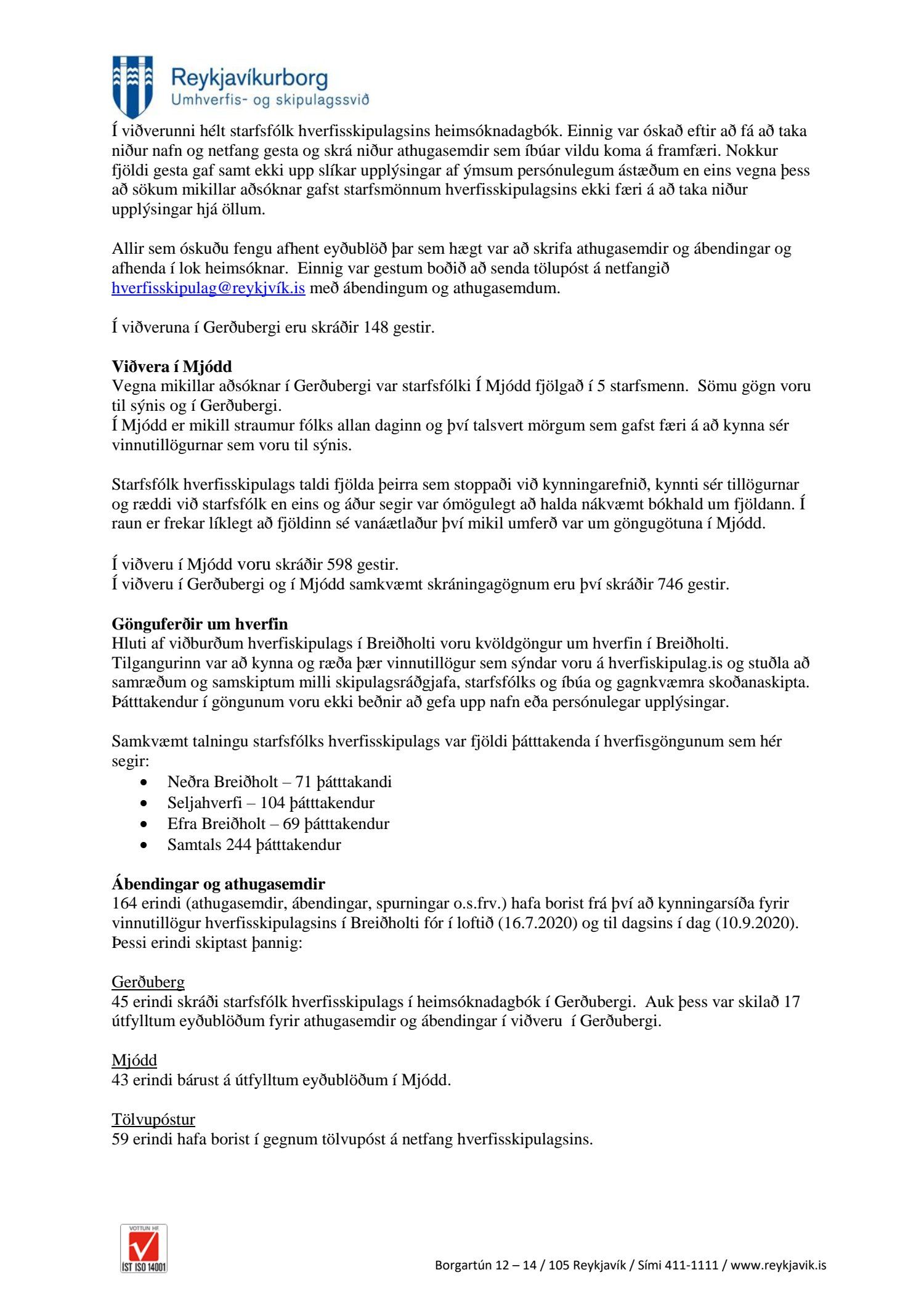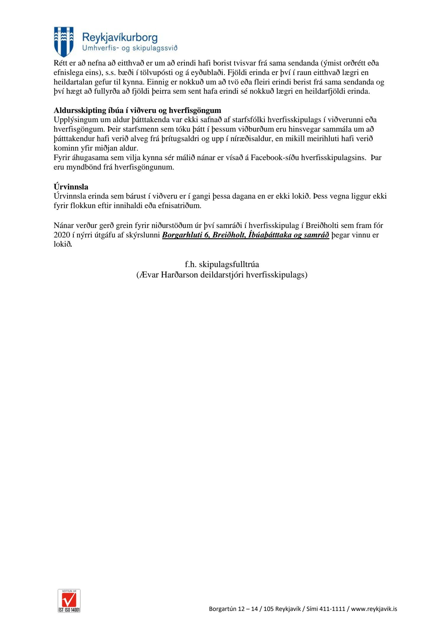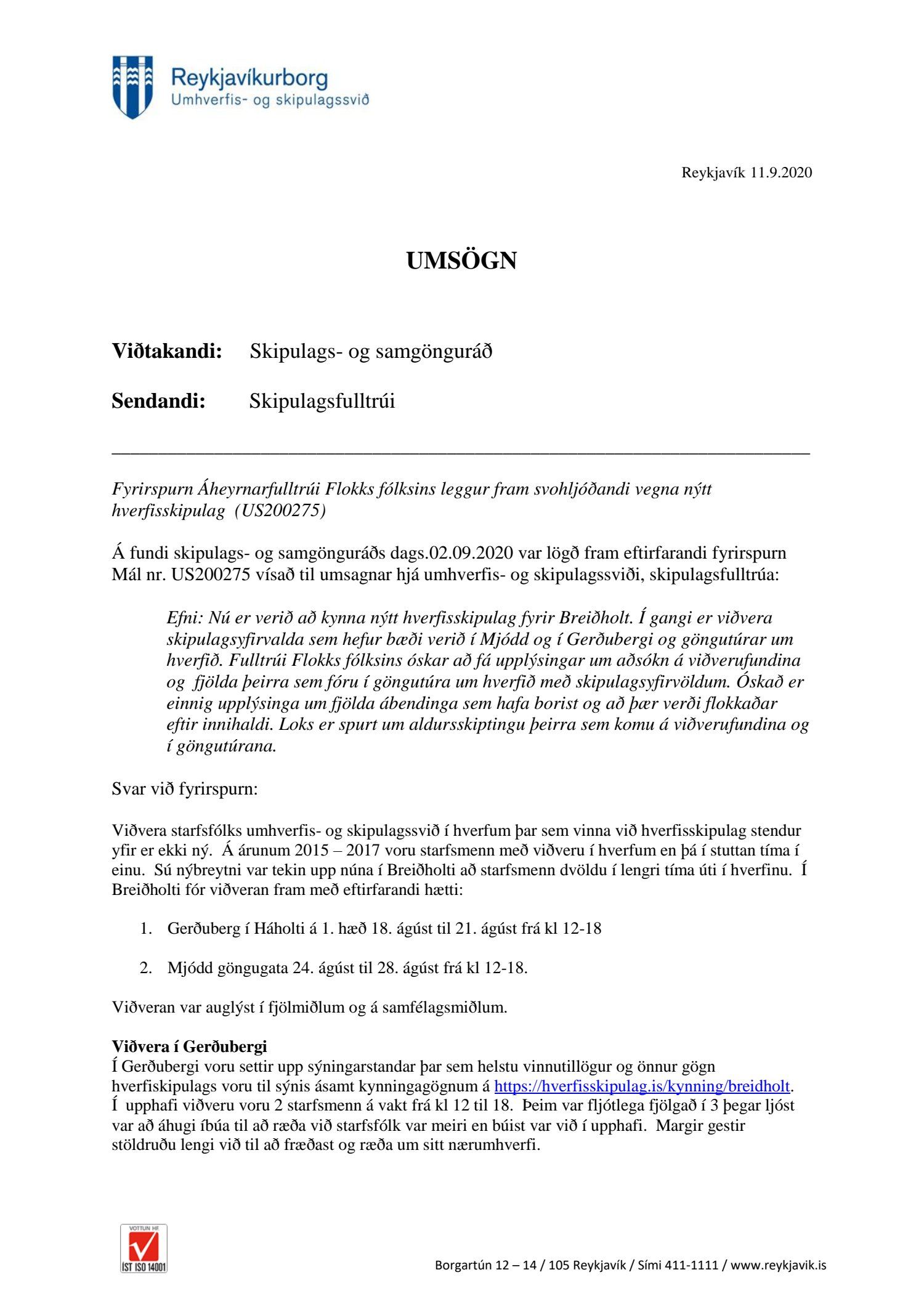 Fulltrúi Flokks fólksins bað um upplýsingar um aðsókn á viðverufundina og fjölda þeirra sem fóru í göngutúra um hverfið í tengslum við kynningu nýs hverfisskipulags Breiðholts. Einnig var óskað upplýsinga um fjölda ábendinga sem hafa borist og að þær verði flokkaðar eftir innihaldi og aldursdreifingu gesta. Í svari koma fram skráningar en ekki náðist að skrá alveg alla sem komu í viðveru. Hlaupa þessar tölur á einhverjum hundruðum en ef allt er talið nær fjöldi kannski að vera um þúsund manns. Í Breiðholti búa yfir 20. þúsund manns. Segja má að þessi viðvera hafi því skilað kynningu/ upplýsingum til lítils brots af íbúum. Hér er um að ræða gríðarlegar breytingar sem gera á í Breiðholti, sumar sannarlega tímabærar en aðrar afar umdeildar og róttækar. Þá ber helst að nefna að fólk sem notar einkabíl mun eiga erfitt um vik að búa í Breiðholti þar sem fjölga á íbúðum um 3000 en ekki bílastæðum í neinu samræmi við það heldur byggja íbúðir á fyrirliggjandi bílastæðum. Það er mat Flokks fólksins að fara þarf hægt hér svo sömu mistökin sem urðu á Laugavegi verði ekki endurtekin. Halda þarf íbúafundi. En það er ekki hægt um þessar mundir. Spurt var um aldursdreifingu þeirra sem mættu til kynningar en ekki er til skráning um það.