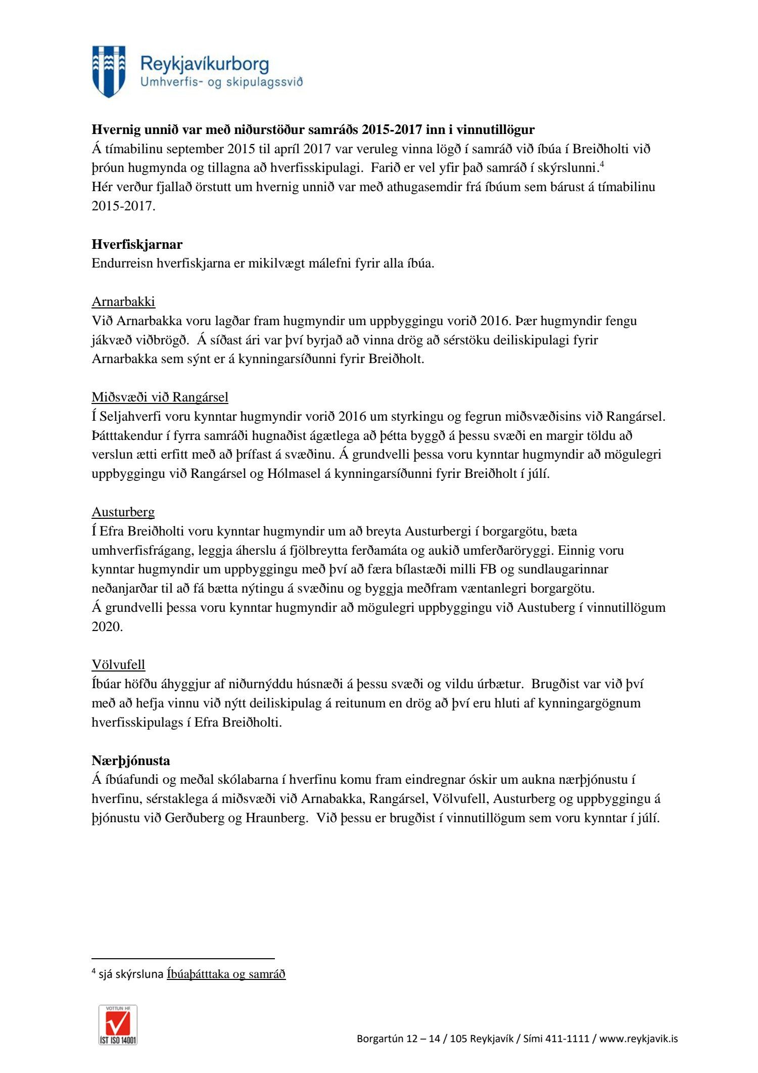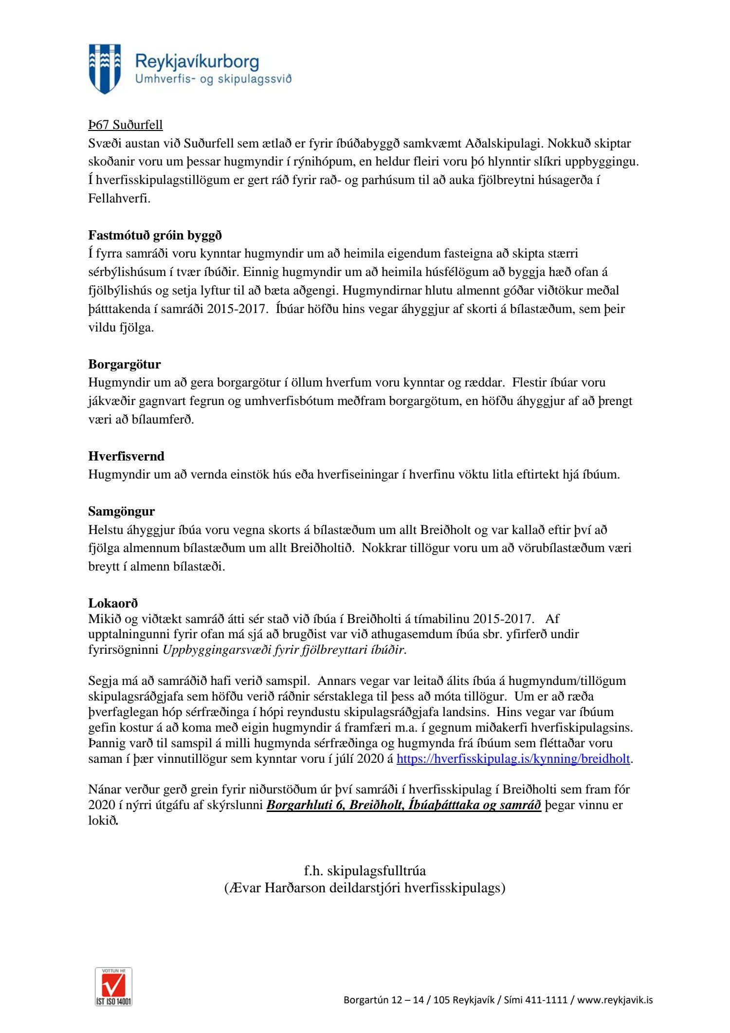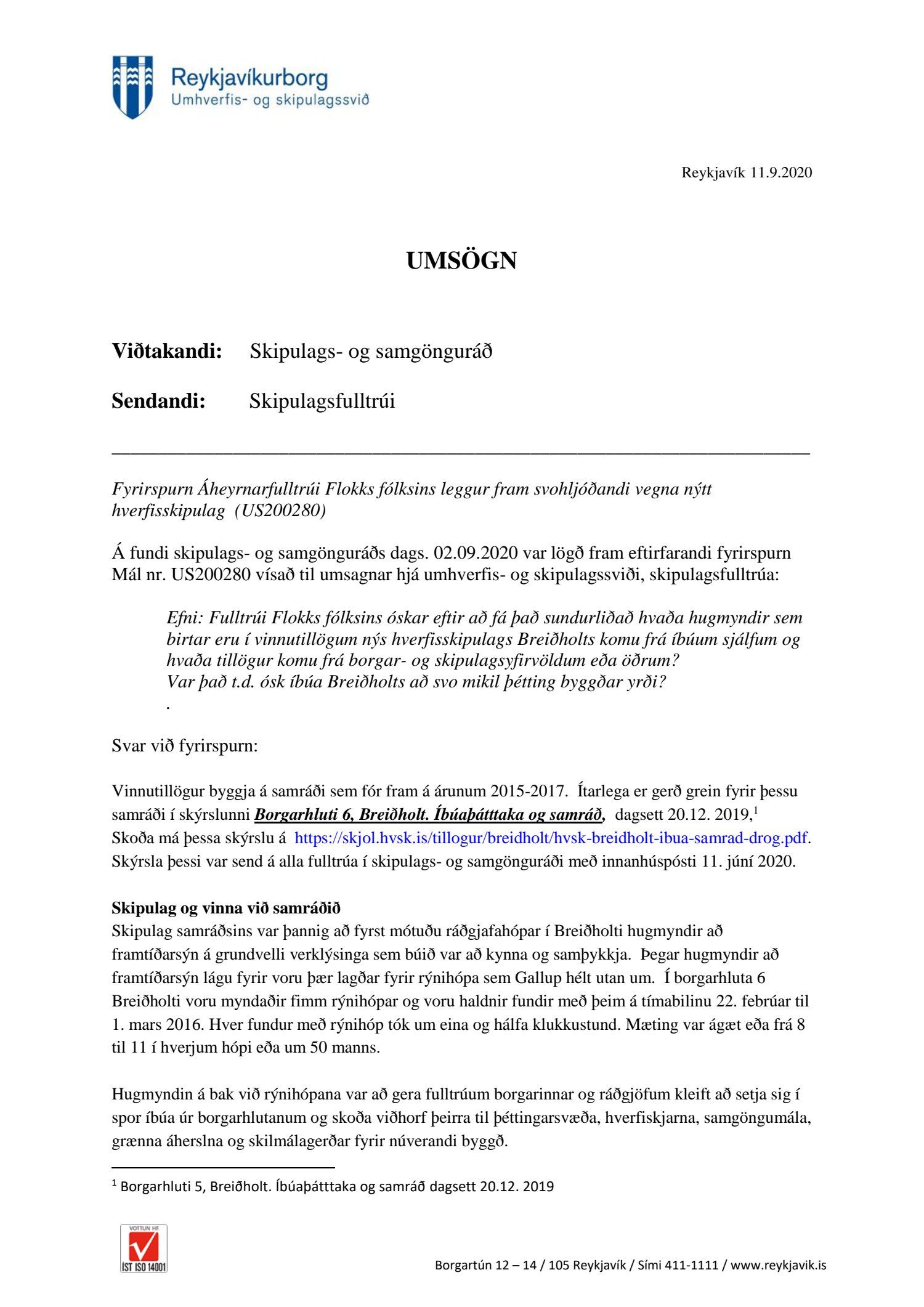 Fulltrúi Flokks fólksins óskaði eftir að fá það sundurliðað hvaða hugmyndir sem birtar eru í vinnutillögum nýs hverfisskipulags Breiðholts komu frá íbúum sjálfum og hvaða tillögur komu frá borgar- og skipulagsyfirvöldum eða öðrum? Var það t.d. ósk íbúa Breiðholts að svo mikil þétting byggðar yrði? Í svari segir að vinnutillögur byggi á samráði sem fór fram á árunum 2015-2017. Ítarlega er gerð grein fyrir þessu samráði í skýrslunni Borgarhluti 6, Breiðholt. Það sætir furðu hvað allt þetta „samráð“, boð um samráð hafi farið fram hjá mörgum í Breiðholti. Ótal margir hafa stigið fram og segjast ekkert kannast við að hafa fengið upplýsingar um fundi eða beðnir að bregðast við hugmyndum hvað þá senda inn hugmyndir. Það búa yfir 20 þúsund manns í Breiðholti. Hér er ekki um ræða lítið hverfi. Fólk man sem dæmi ekki eftir að hafa verið sendur neinn póstur um allt þetta samráð. Rýnihópar? Hvað margir af þeim 20 þúsund sem búa í Breiðholti höfðu aðgang að þeim? Segir í svari að mæting hafi verið ágæt eða frá 8 til 11 í hverjum hópi eða um 50 manns. Hverjir voru þessir fulltrúar borgarinnar og ráðgjafar sem setja áttu sig í spor íbúa. Ef hugmynd er óvinsæl hjá mörgum er sagt að hún hafi komið frá íbúa?
