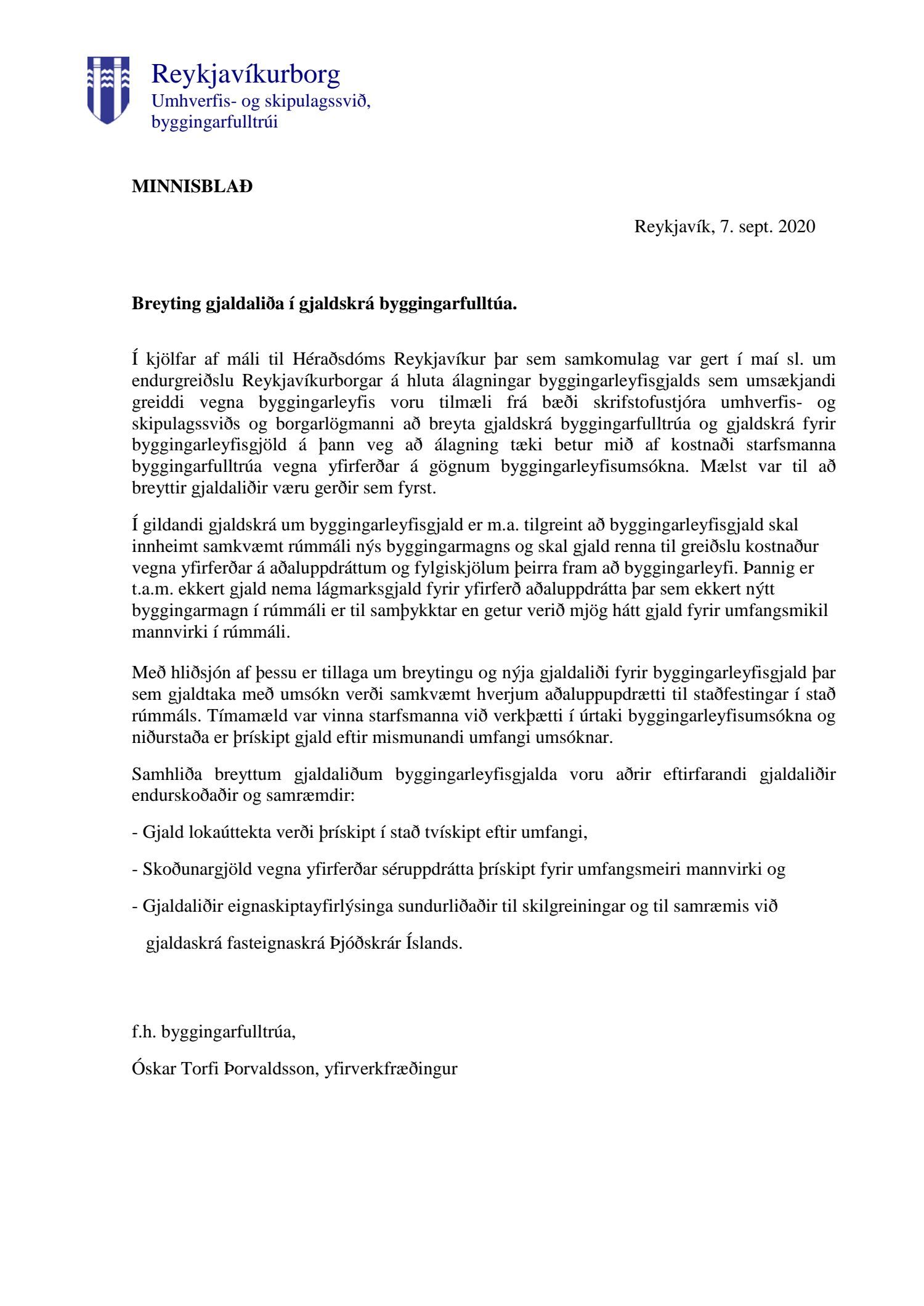 Lögð er fram tillaga að nýrri gjaldskrá fyrir byggingarfulltrúa Reykjavíkurborgar. Einnig er lagt fram minnisblað dags. 7. september 2020.