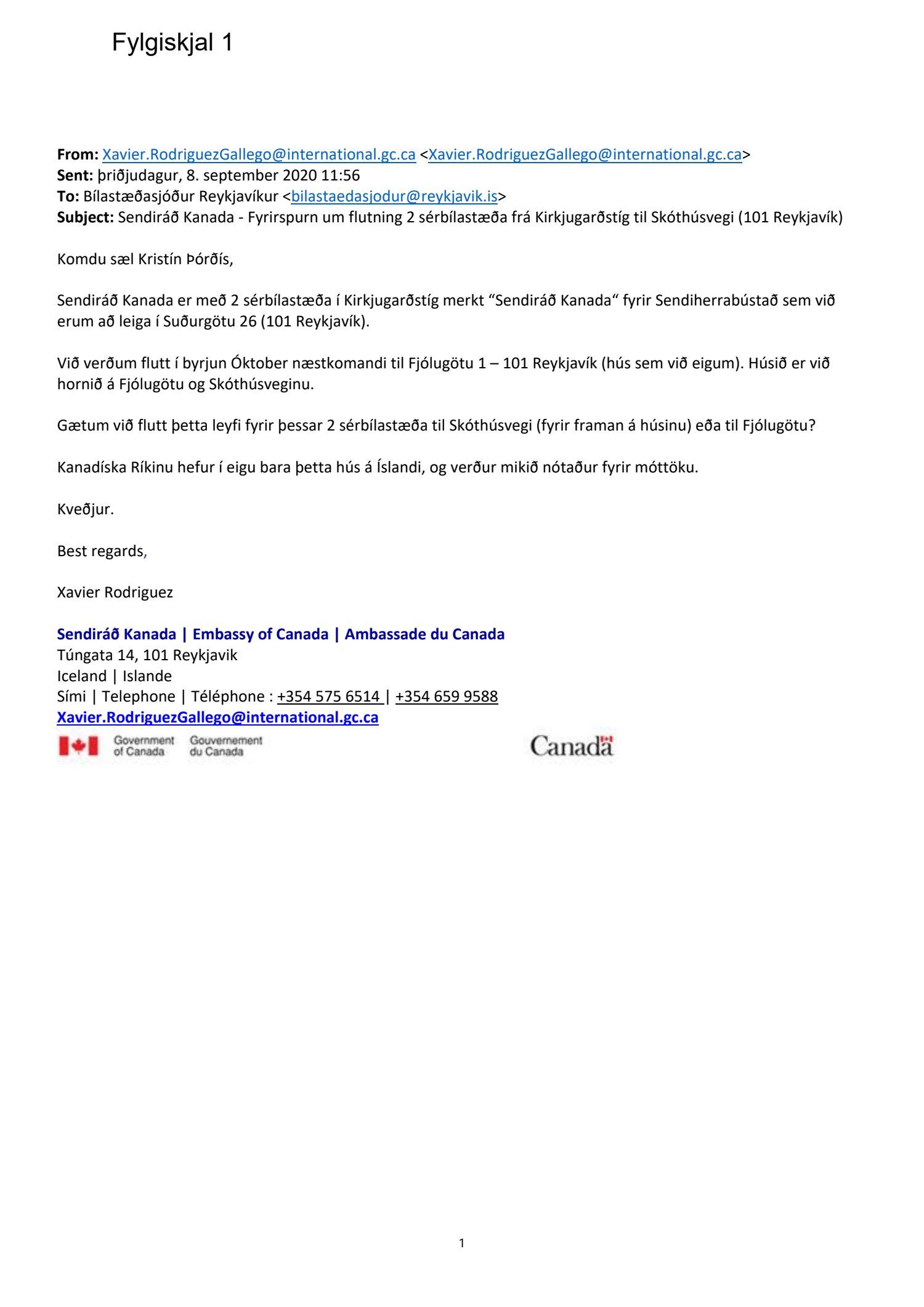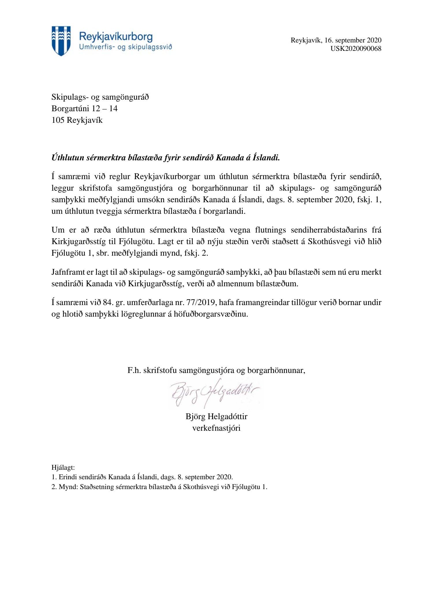 Lagt er til að skipulags- og samgönguráð samþykki meðfylgjandi umsókn sendiráðs Kanada á Íslandi, dags. 8. september 2020, um úthlutun tveggja sérmerktra bílastæða í borgarlandi og að þau bílastæði sem nú eru merkt sendiráði Kanada við Kirkjugarðsstíg, verði að almennum bílastæðum.